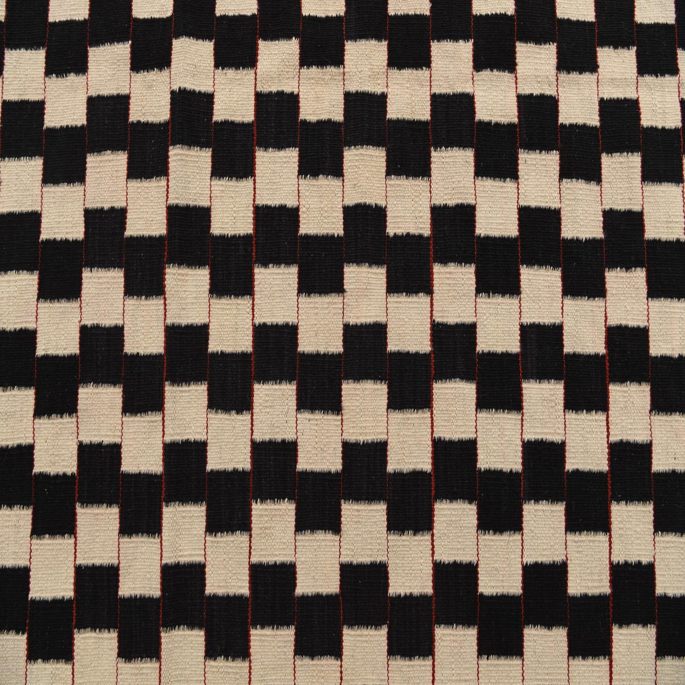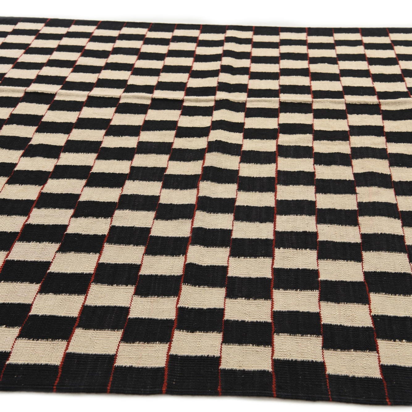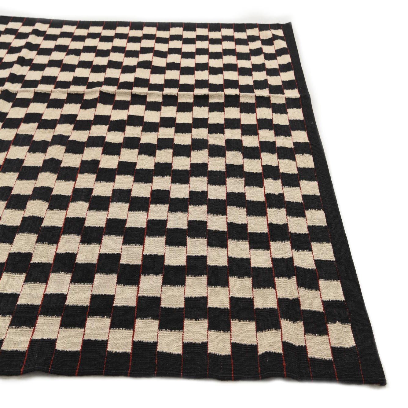 A 5x8 rectangular Kilim Modern rug with a black and ivory checkerboard pattern, featuring thin red horizontal lines.