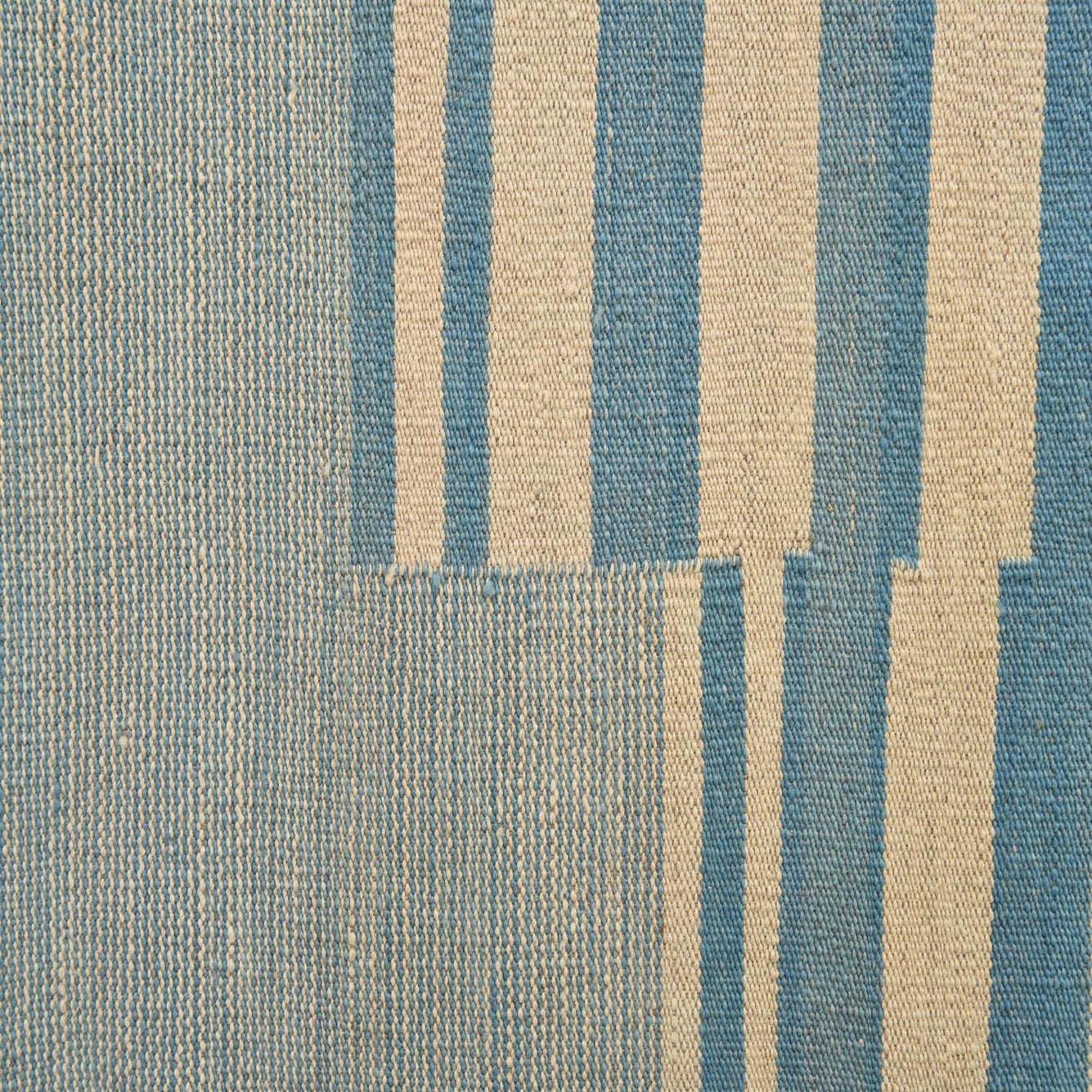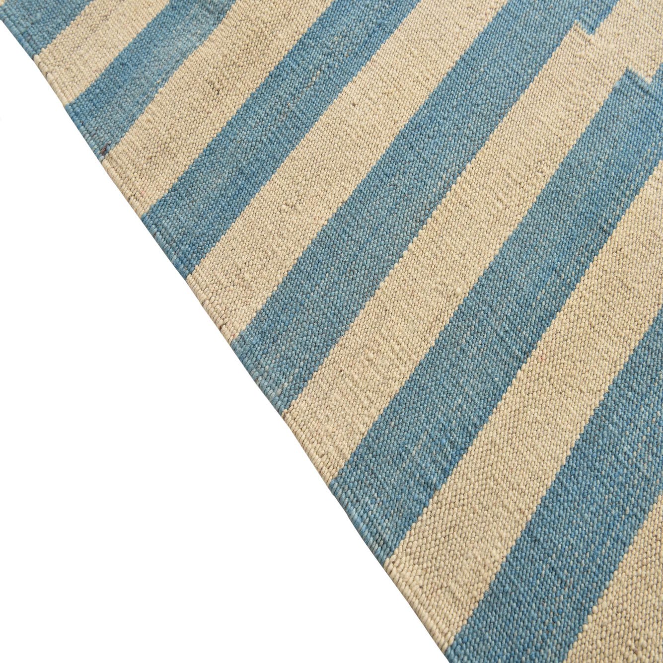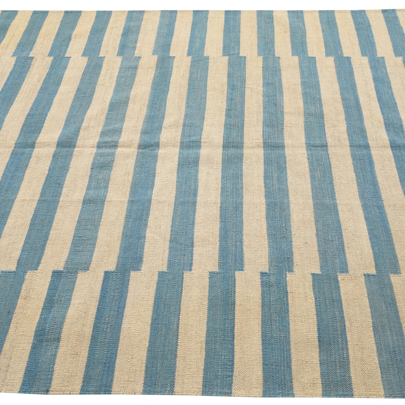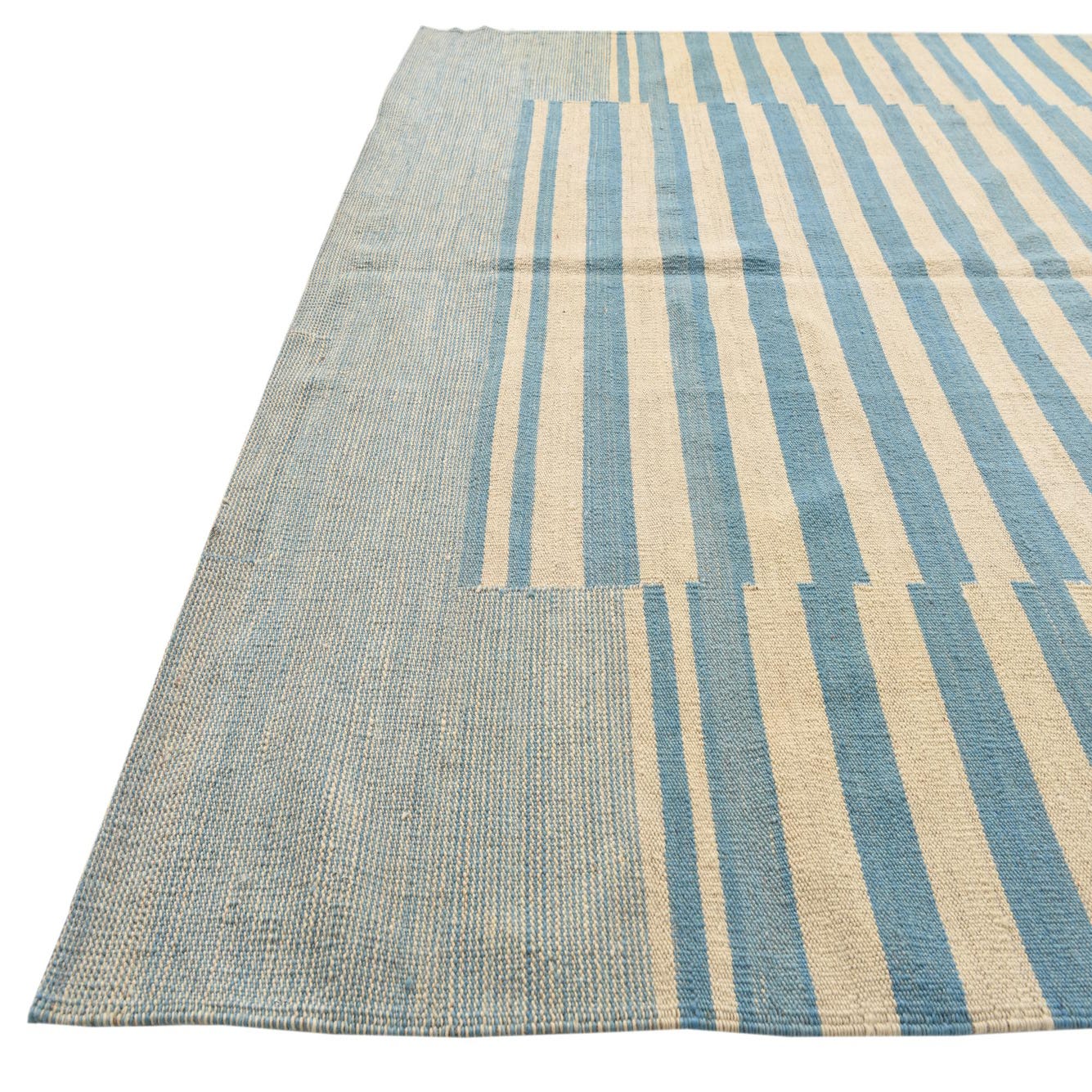 A 5x8 rectangular Kilim Modern rug with a central ivory and light blue striped pattern, framed by a solid light blue border.