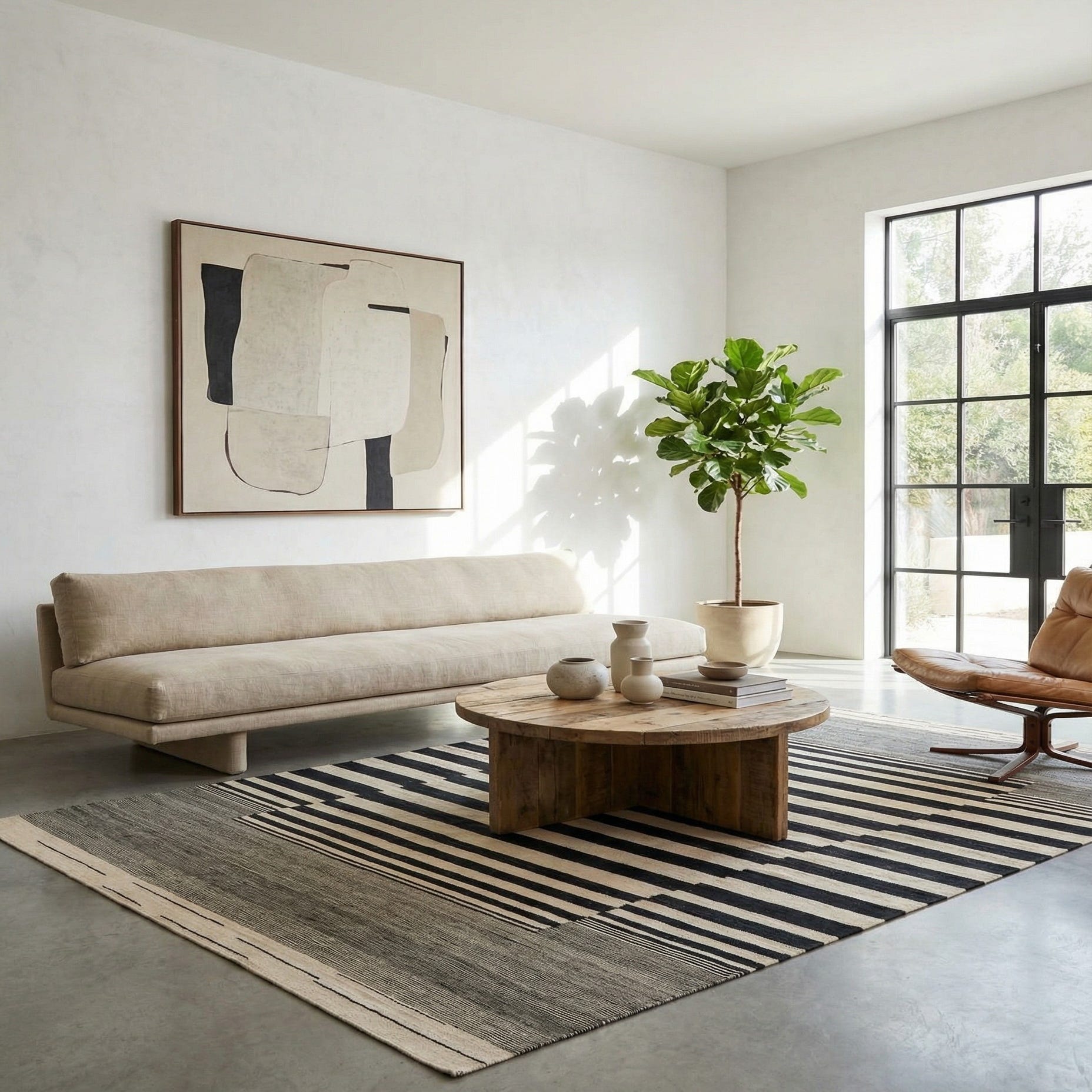 This rug integrates seamlessly into contemporary spaces where its clean lines and graphic appeal complement modern furniture and decor. It can also act as a visual anchor in eclectic interiors, harmonizing disparate elements with its strong, geometric presence. For a more traditional setting, this piece offers a refreshing contrast, reinforcing a classic monochrome color palette while providing a modern twist. The Kilim Modern rug is well-suited for living rooms, home offices, or dining areas where its graphic design will accentuate and define the space.