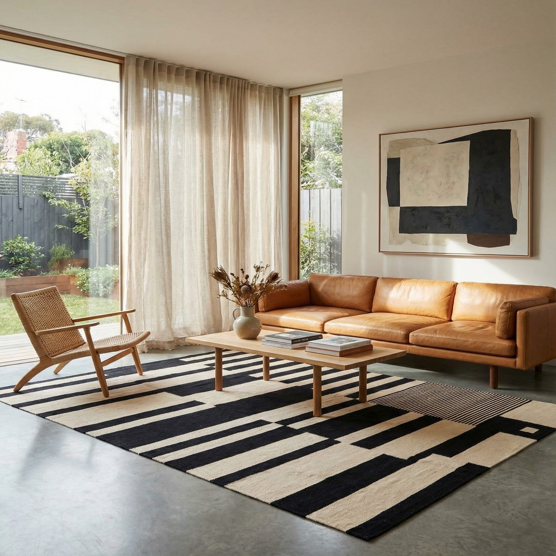 The rug's palette of ivory and black makes it a versatile piece for various interior styles, from monochromatic minimalist to more eclectic and bold decors. The geometric precision of the design suits a modern living room or office space, providing a foundation that can anchor a variety of furniture pieces. Additionally, its simplicity allows it to blend seamlessly in a Scandinavian-inspired setting, where clean lines and neutral colors are prized.