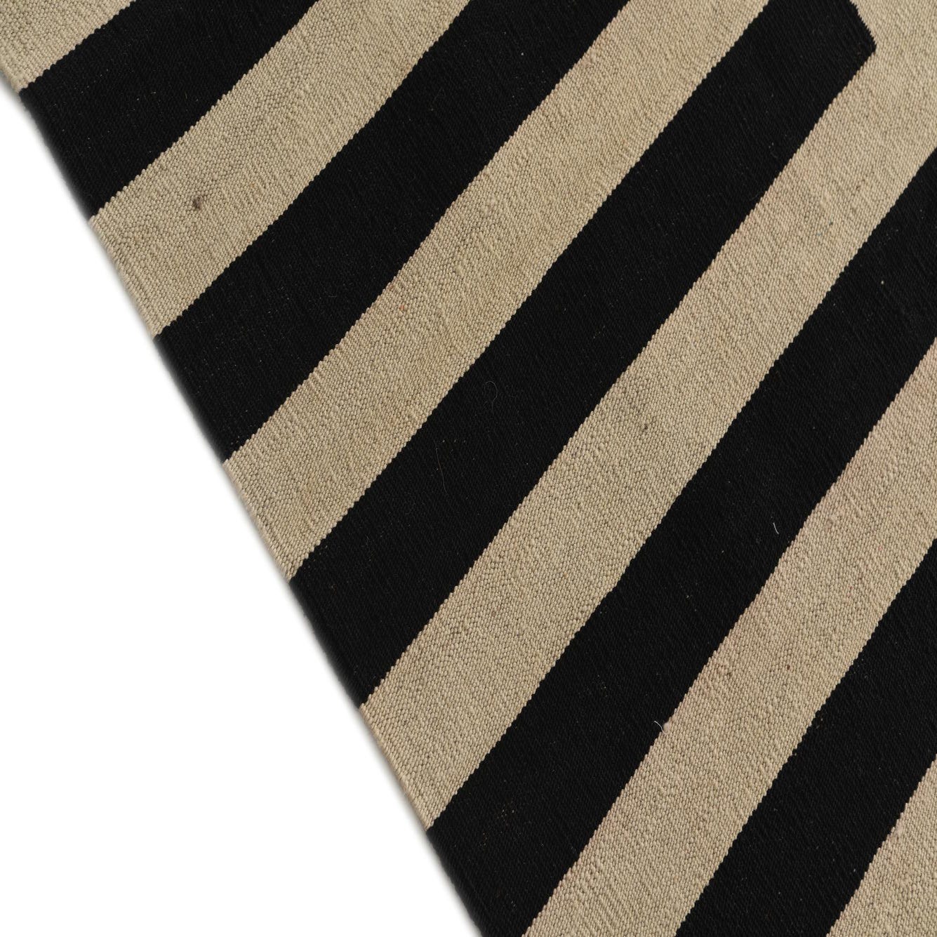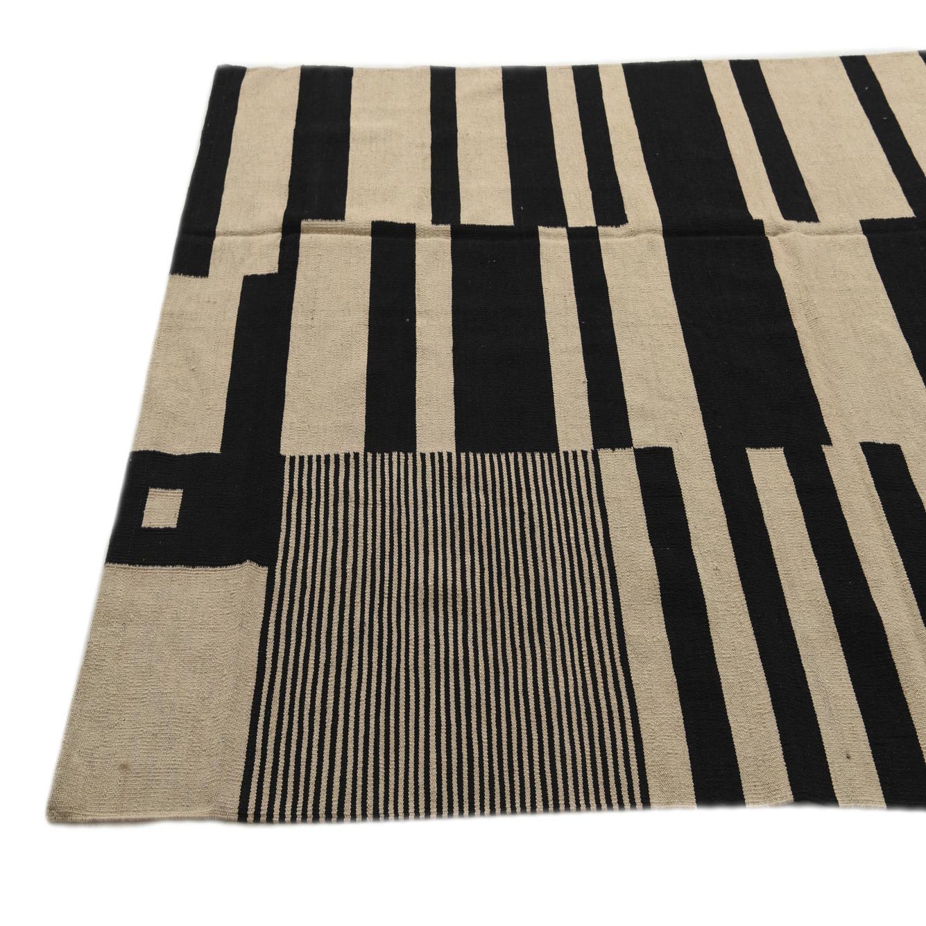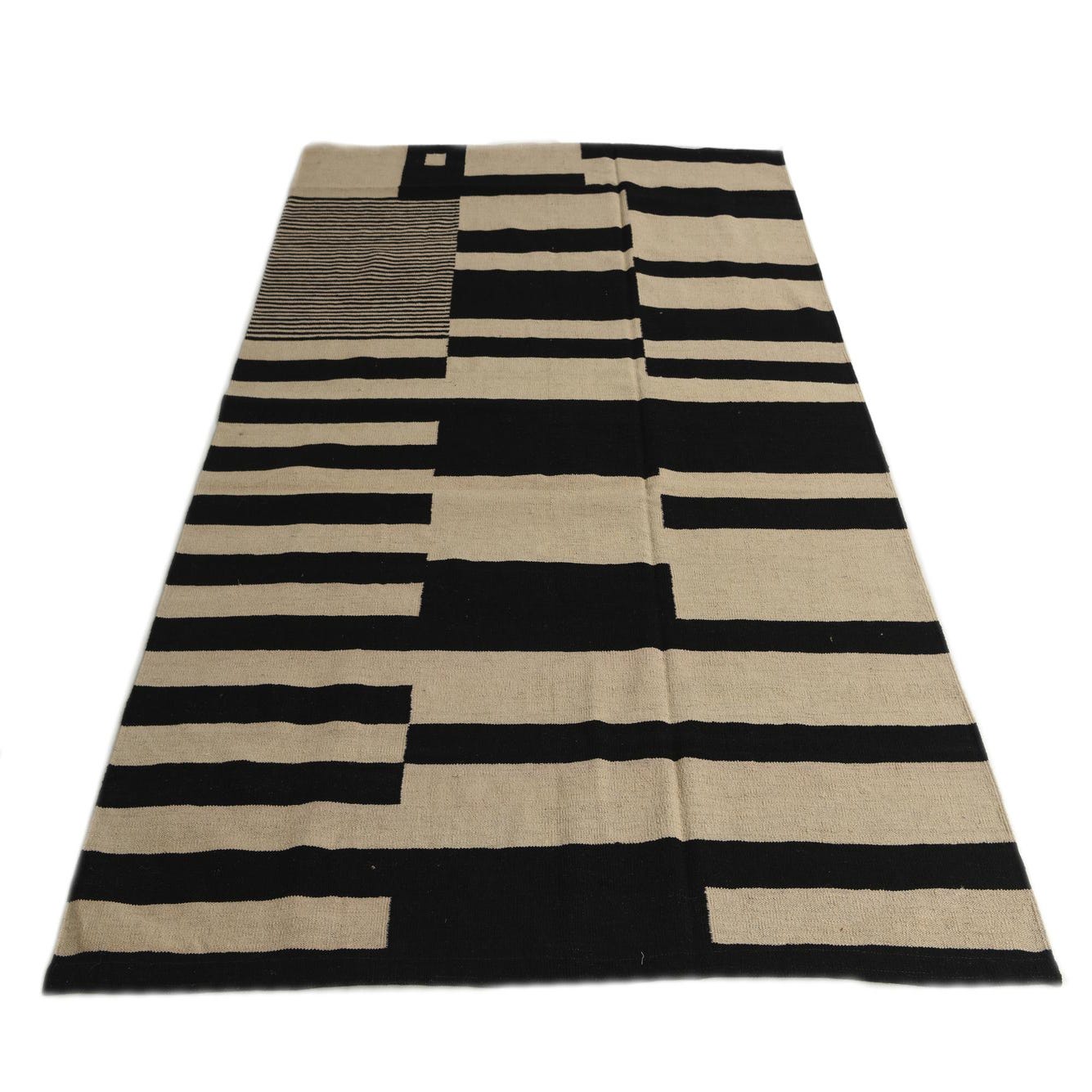 The Kilim Modern Hand Woven 5x8 rug offers a bold and minimalist design, adept at complementing a variety of contemporary spaces. Handwoven from 100% wool, this rug presents a juxtaposition of black and ivory hues in a graphic, abstract pattern that creates visual interest without overwhelming a room's aesthetic. Its flatweave construction ensures durability while offering a smooth texture underfoot.