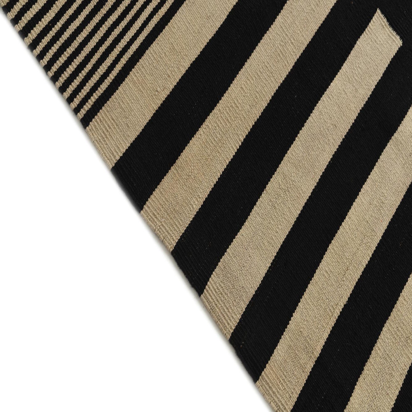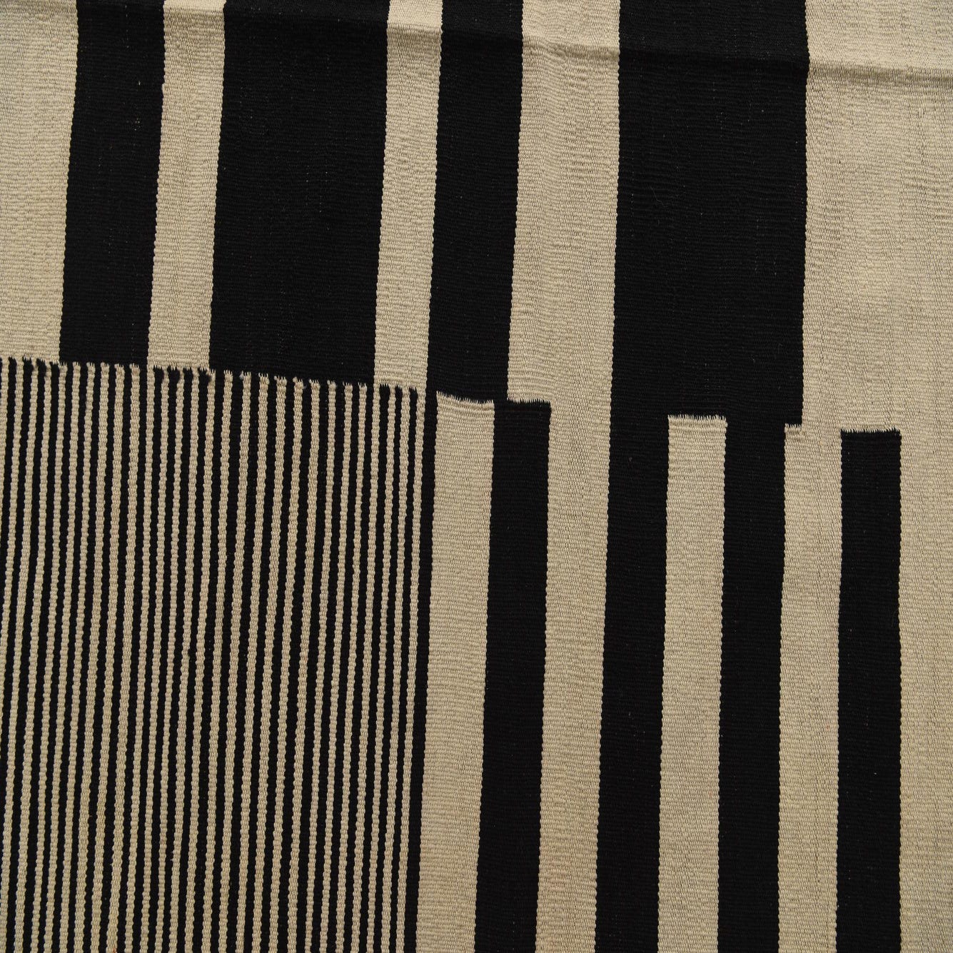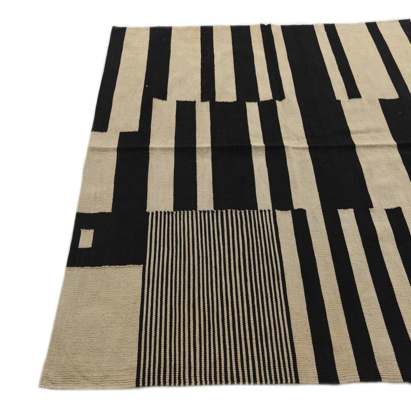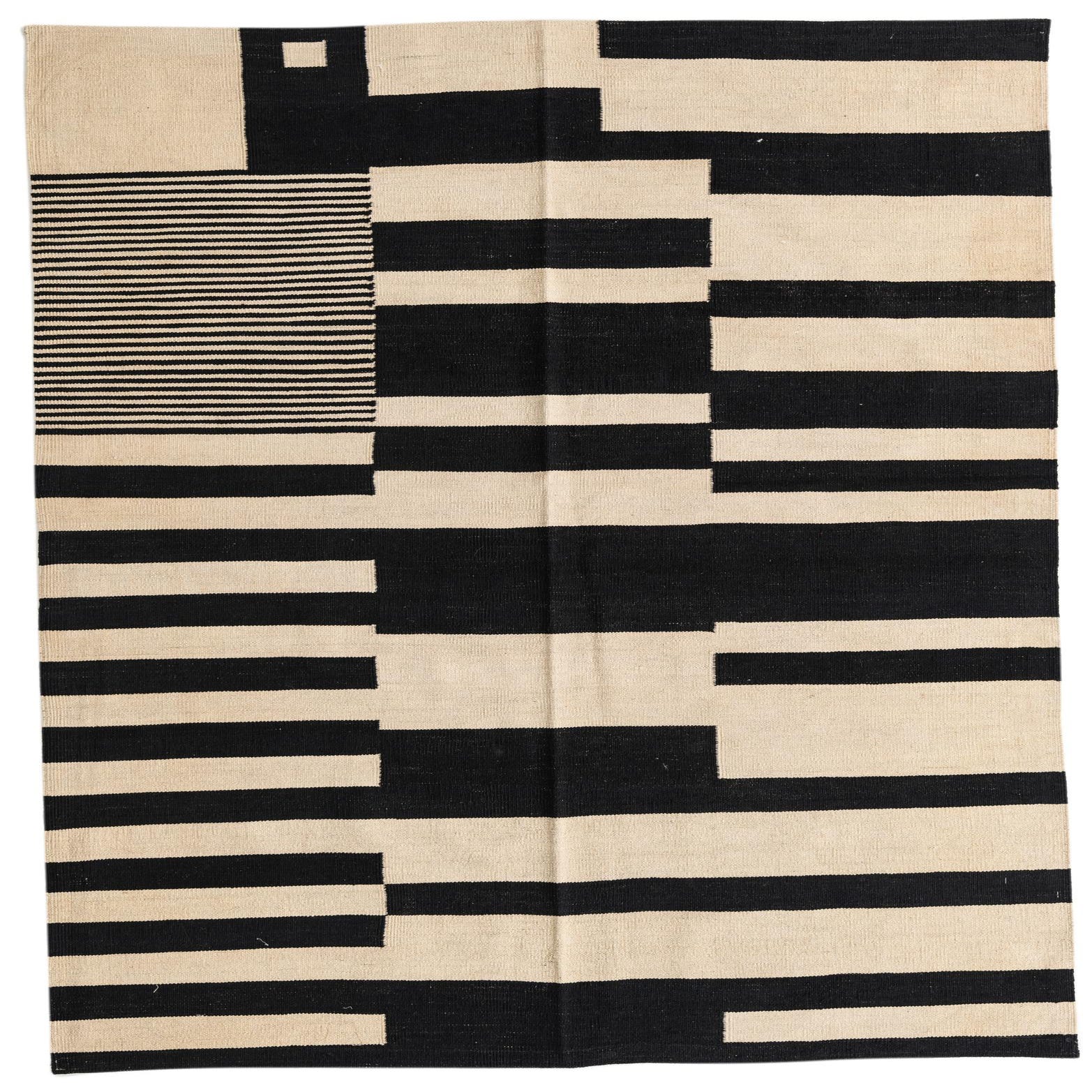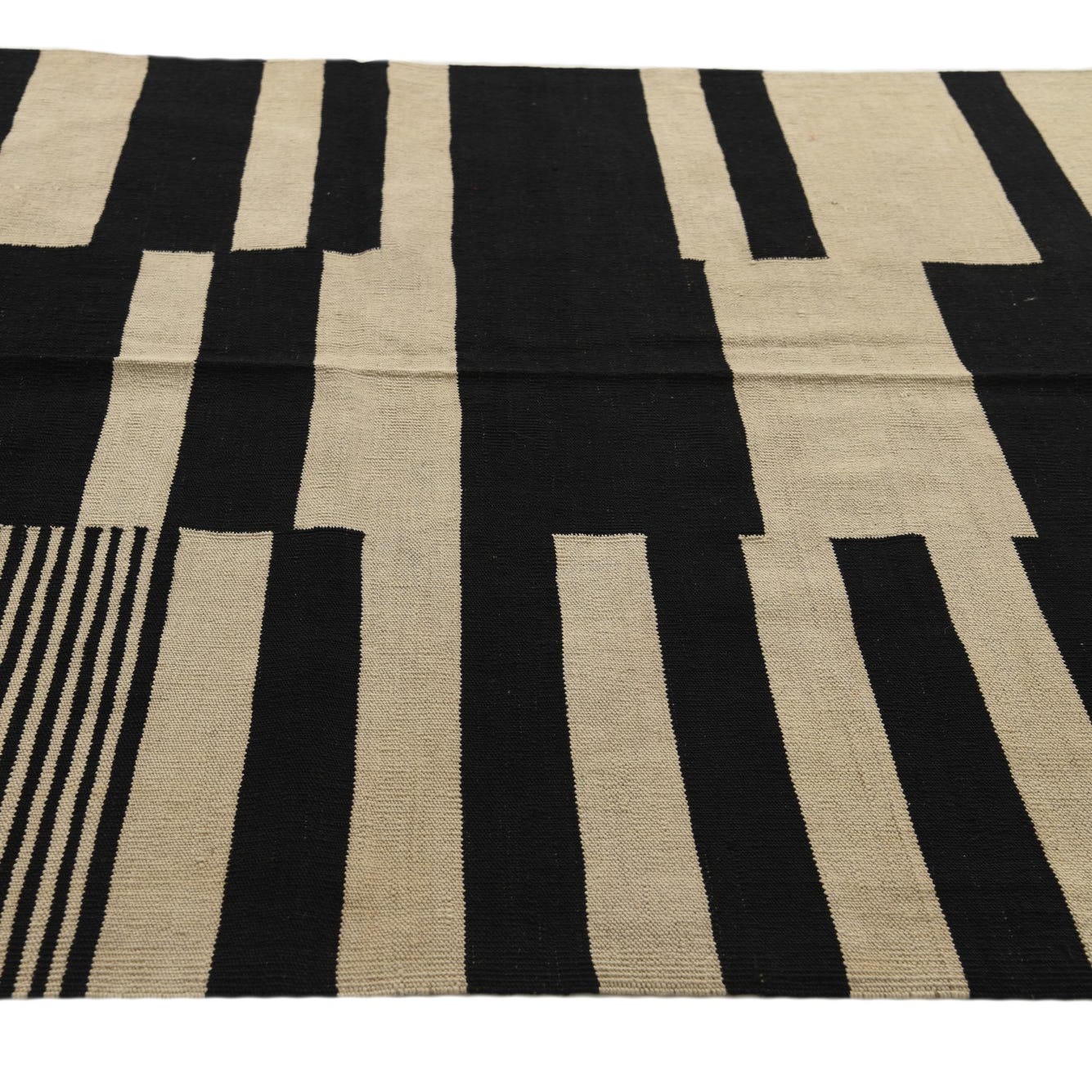 A 5x8 rectangular Kilim Modern rug with a bold abstract pattern of black and ivory stripes and blocks.