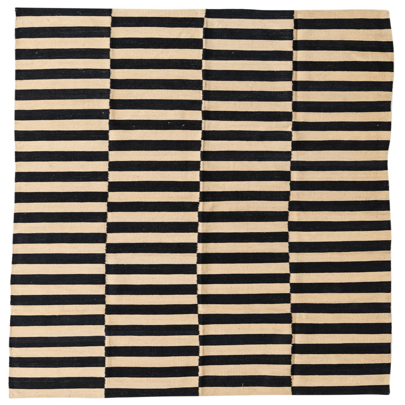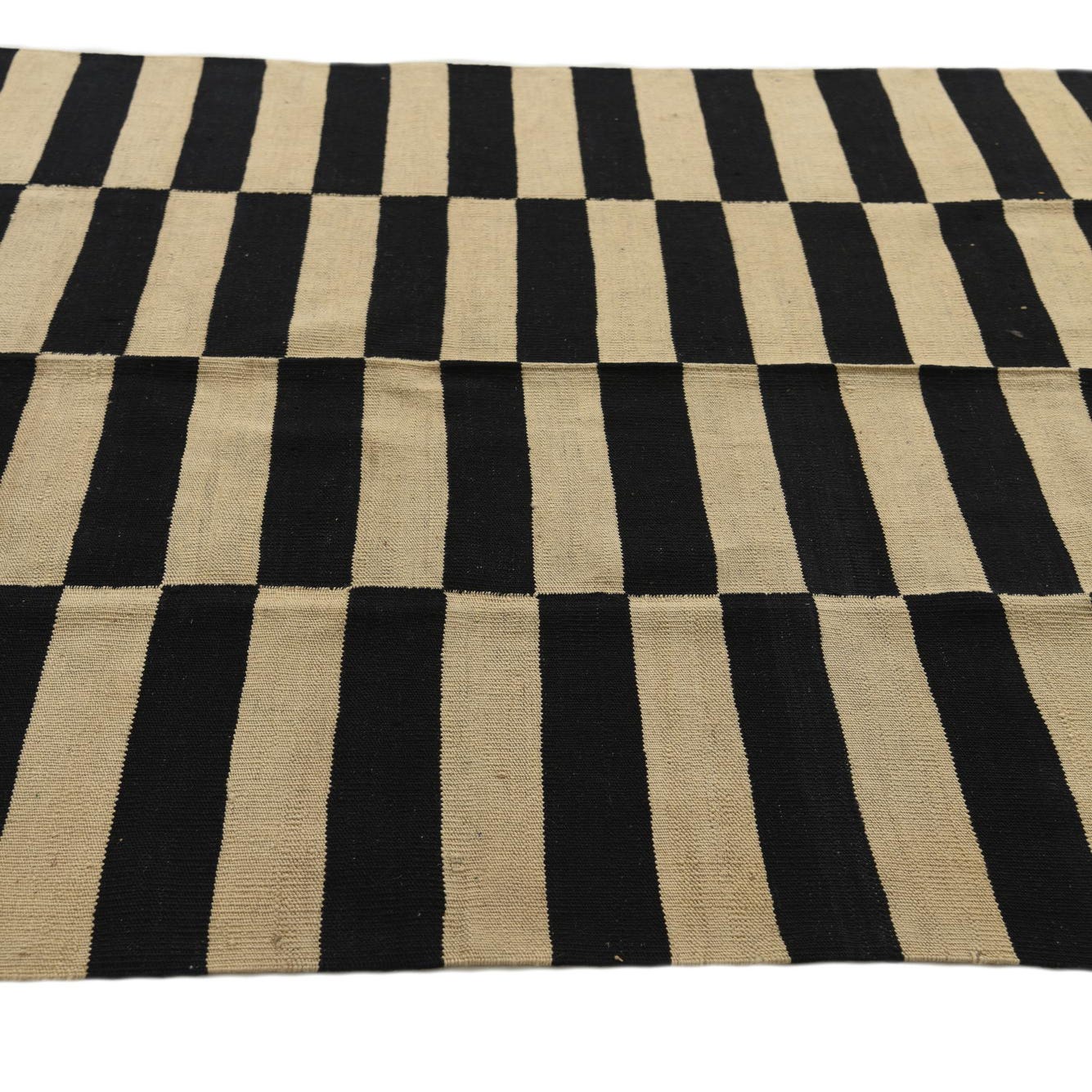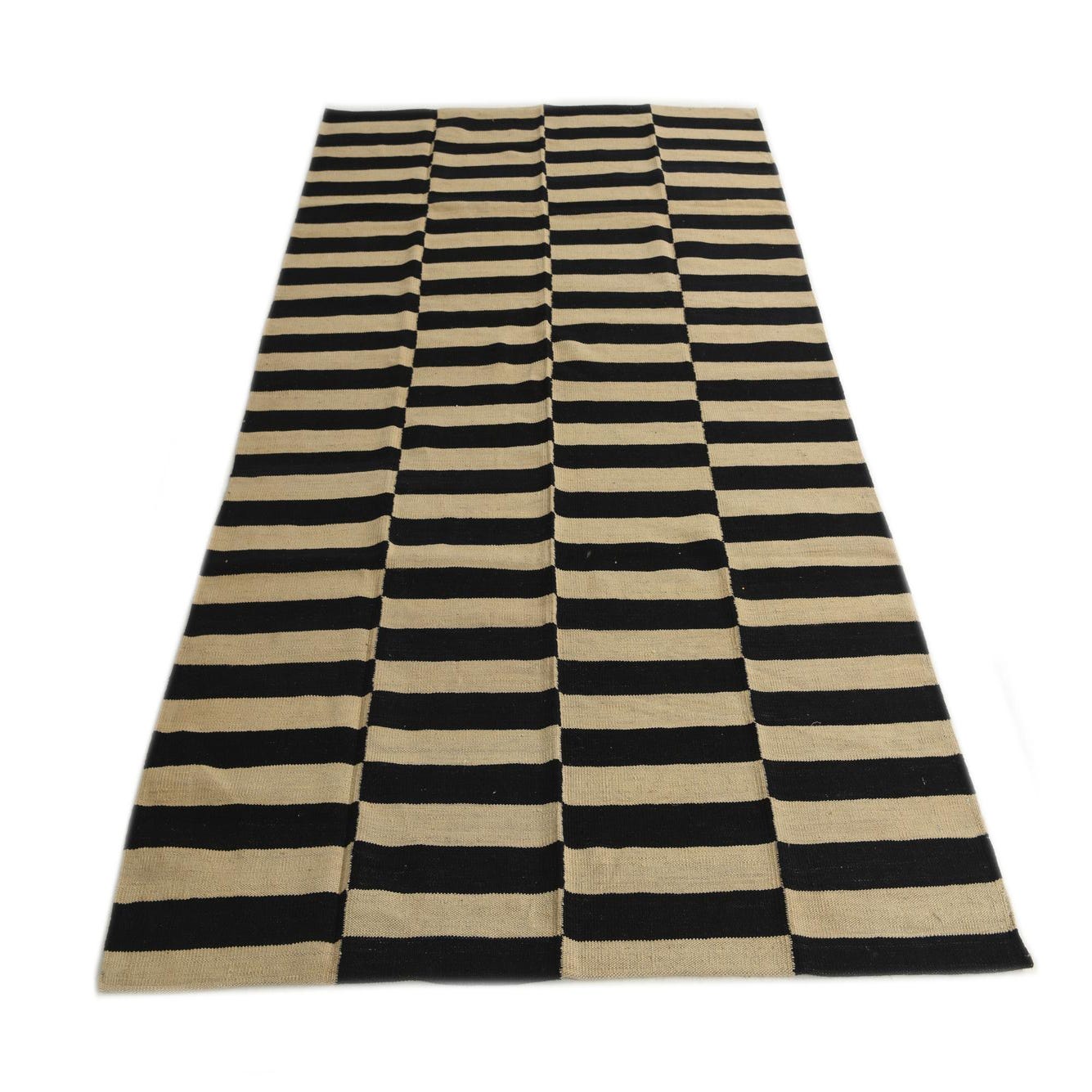 A 5x8 rectangular Kilim Modern rug with a bold black and ivory striped pattern, perfect for a living room.