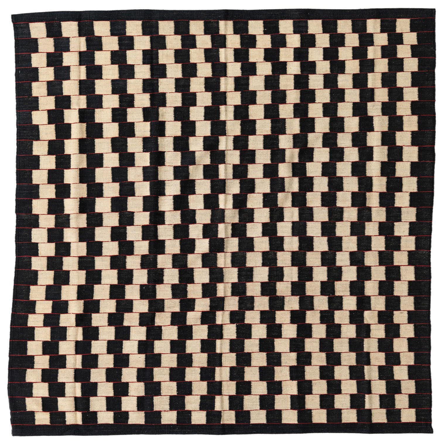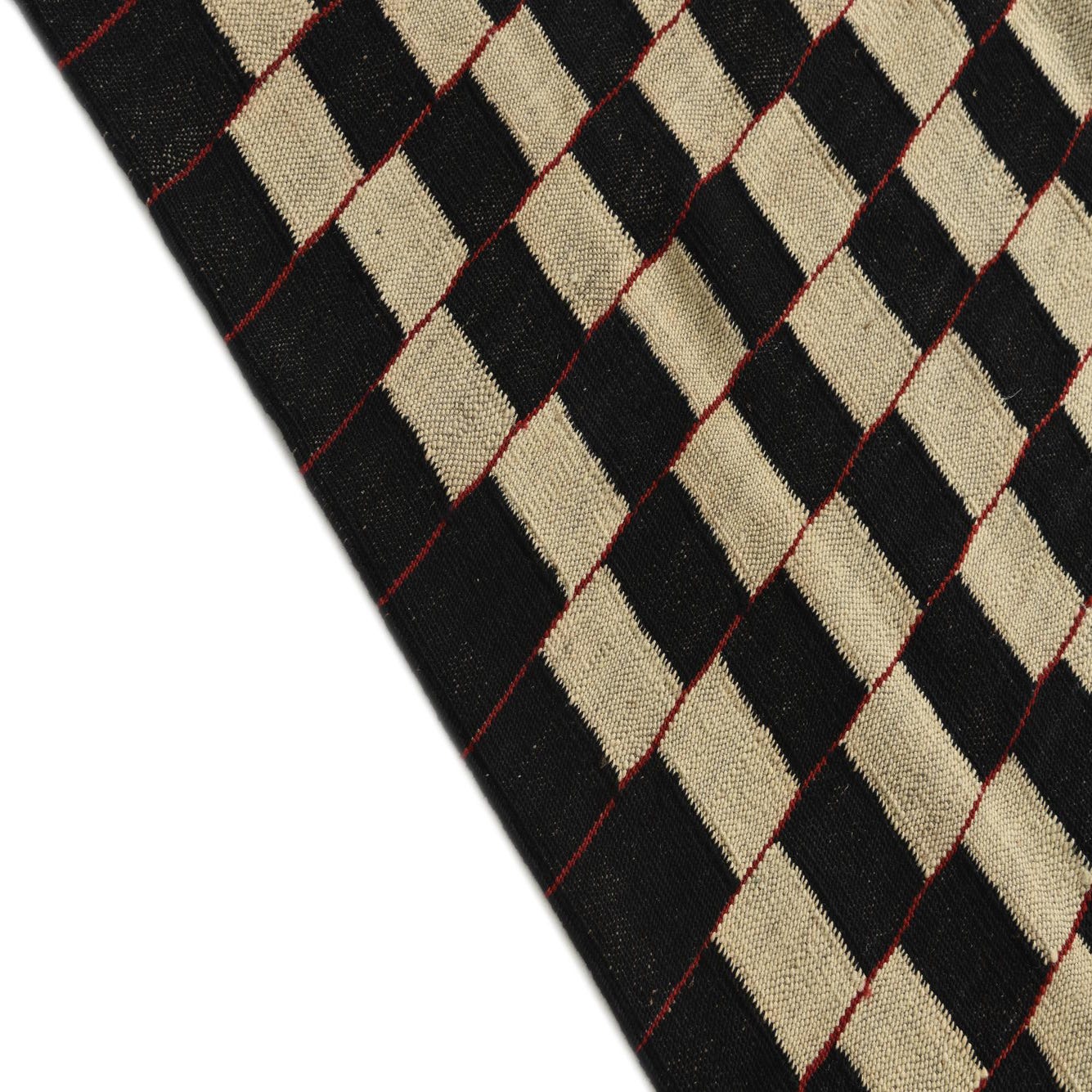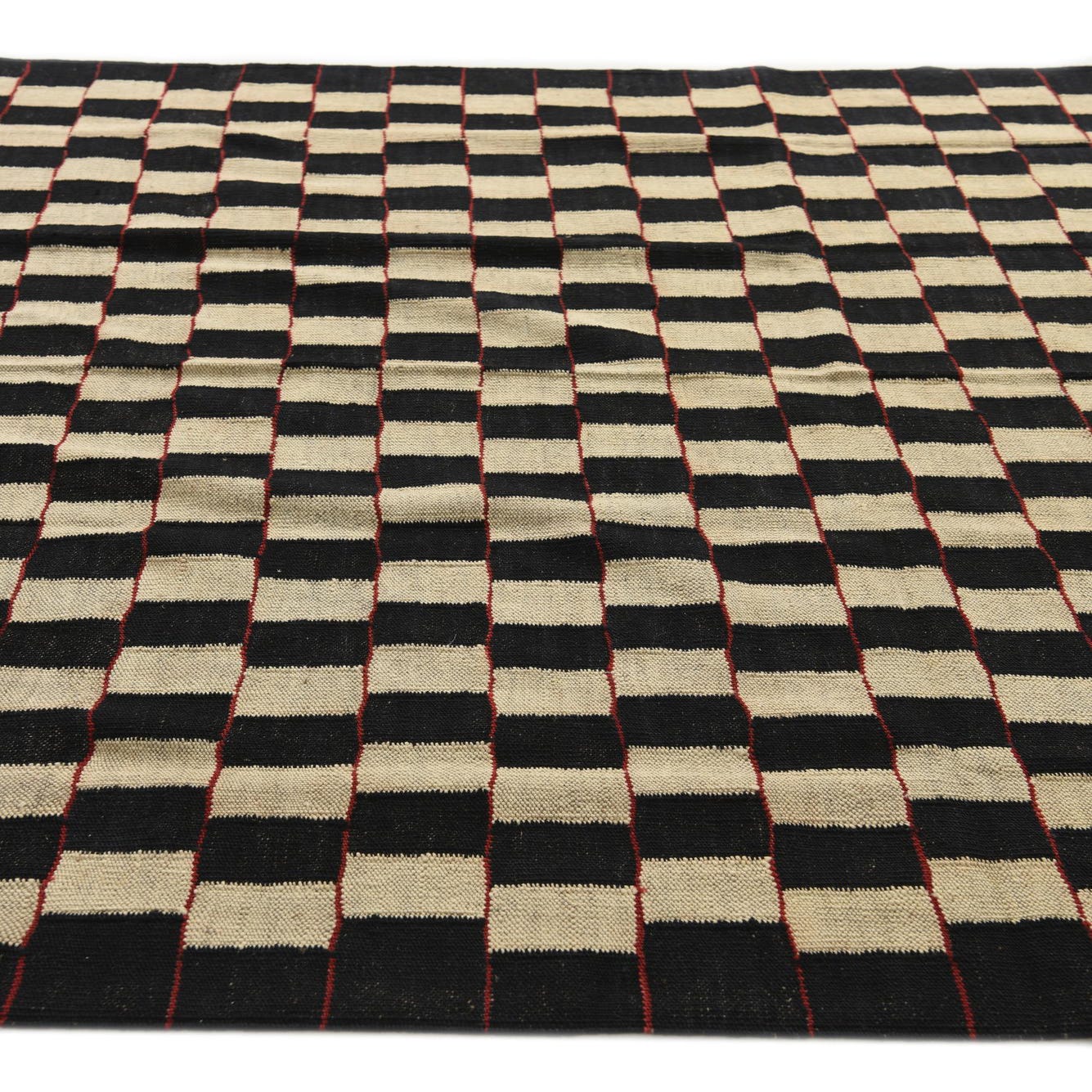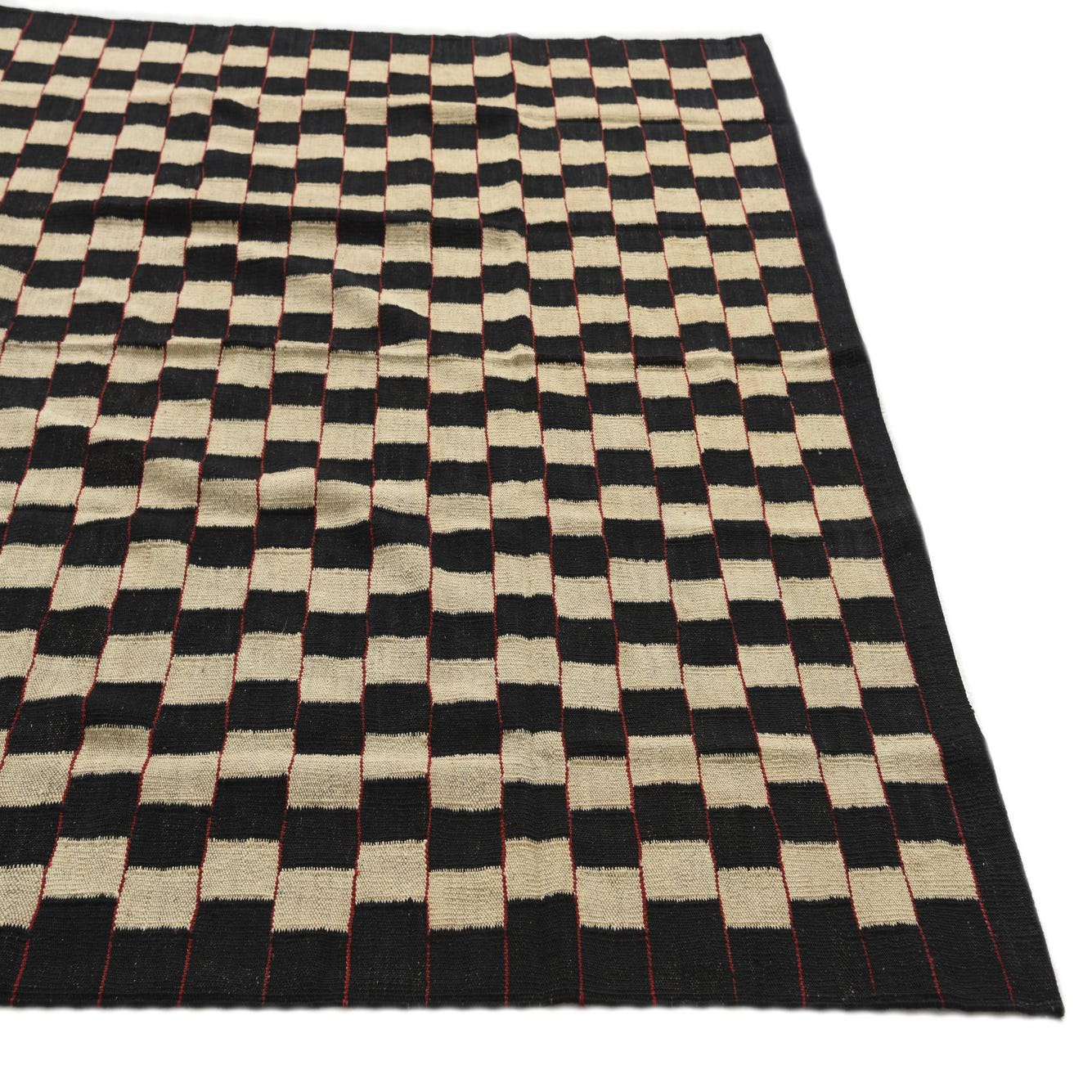 A 5x8 rectangular Kilim Modern rug with a black and ivory checkerboard pattern, featuring thin red accent lines.