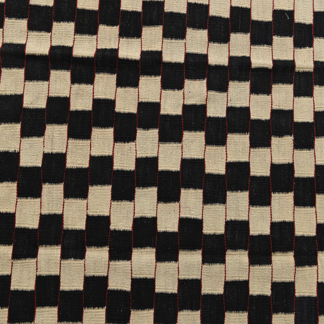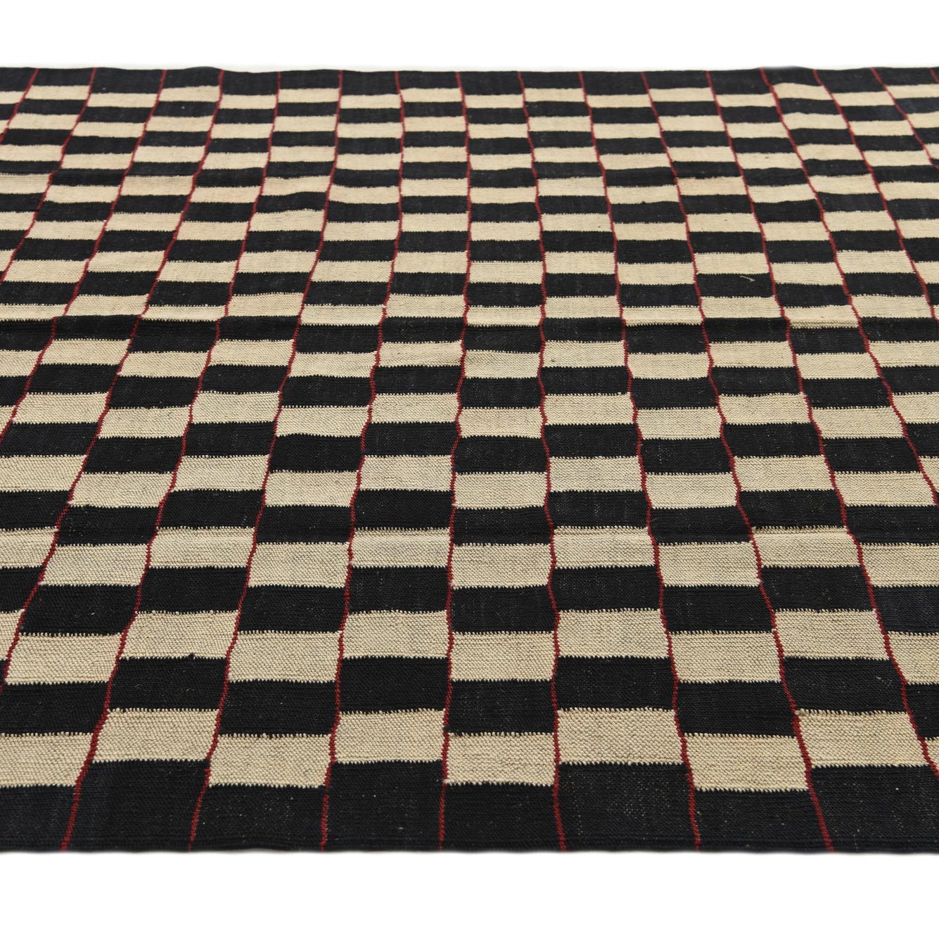 A 5x8 rectangular Kilim Modern rug with a checkerboard pattern of ivory and black squares, accented by thin red lines.