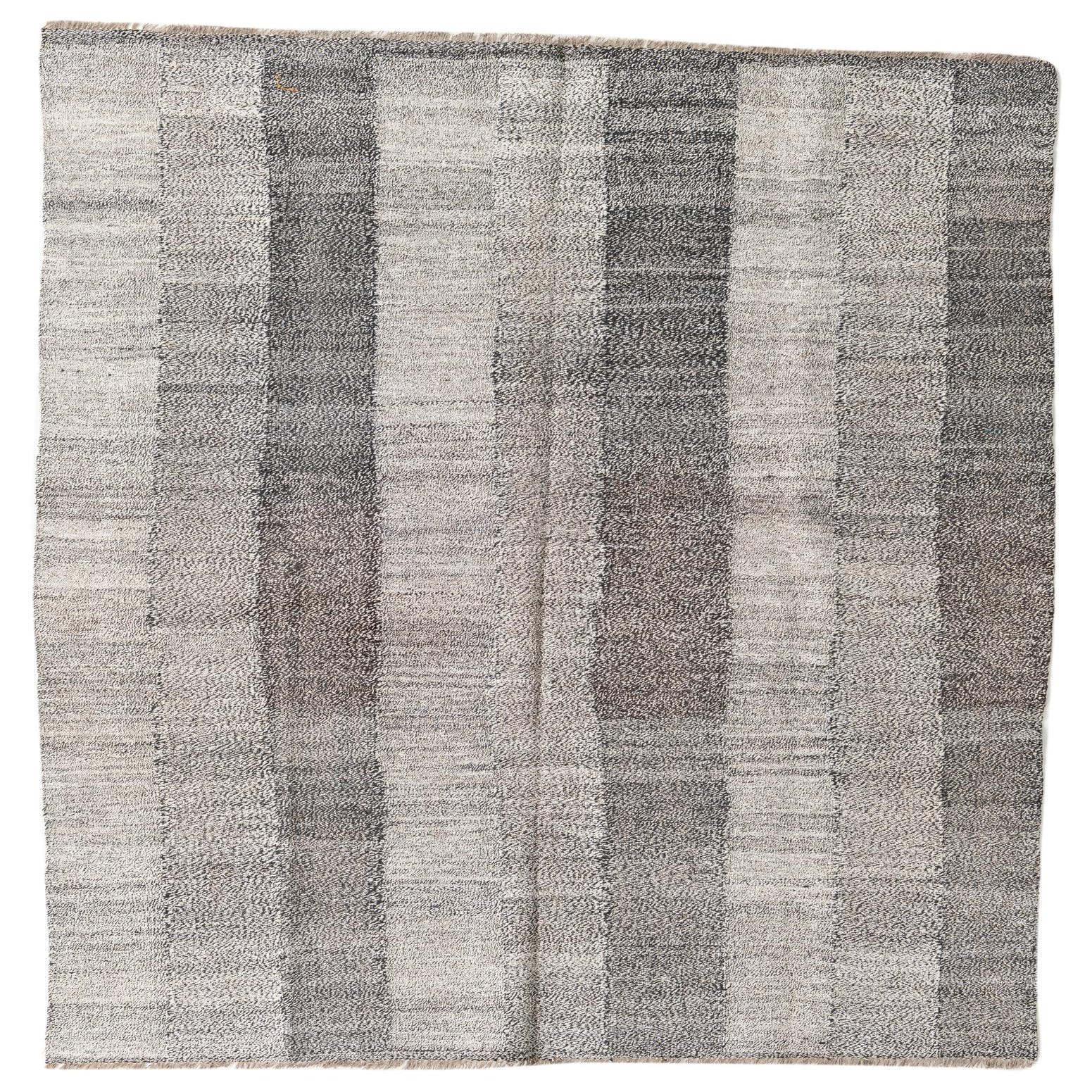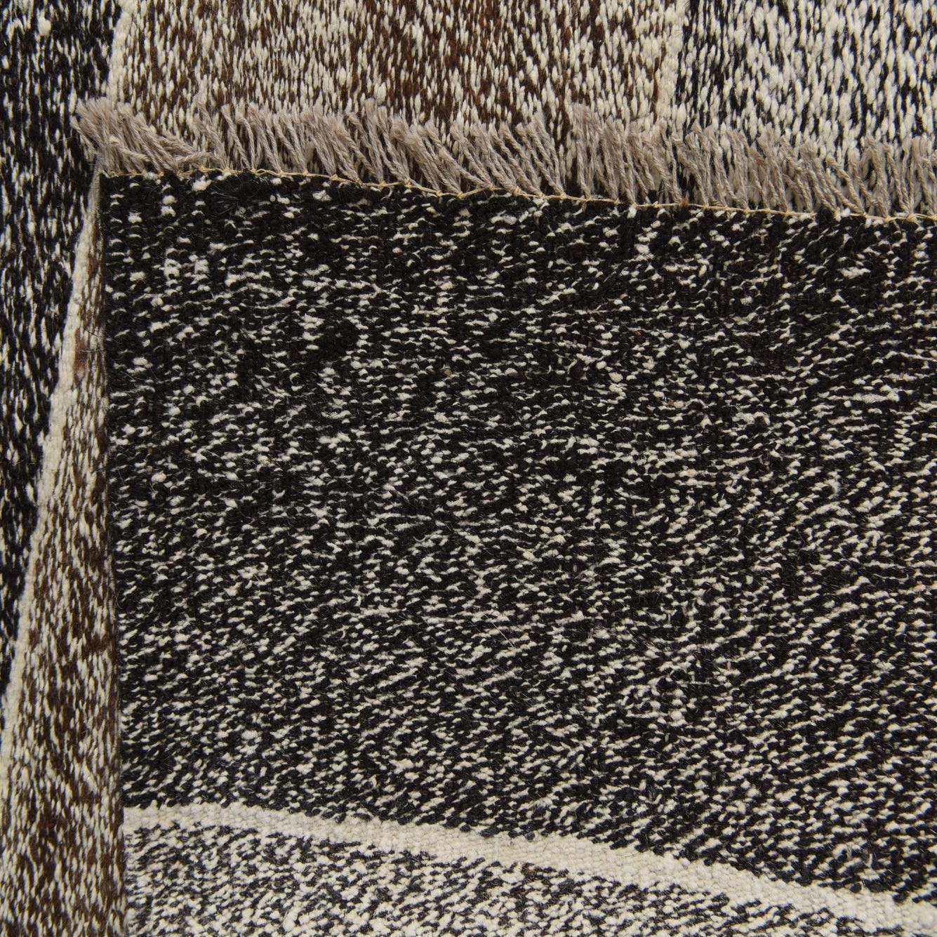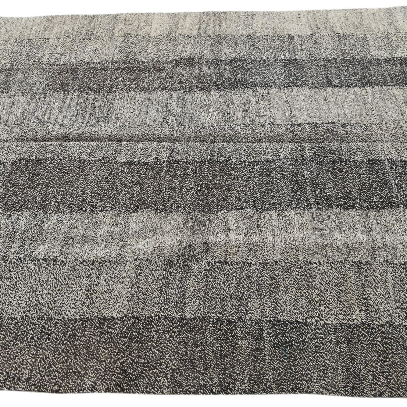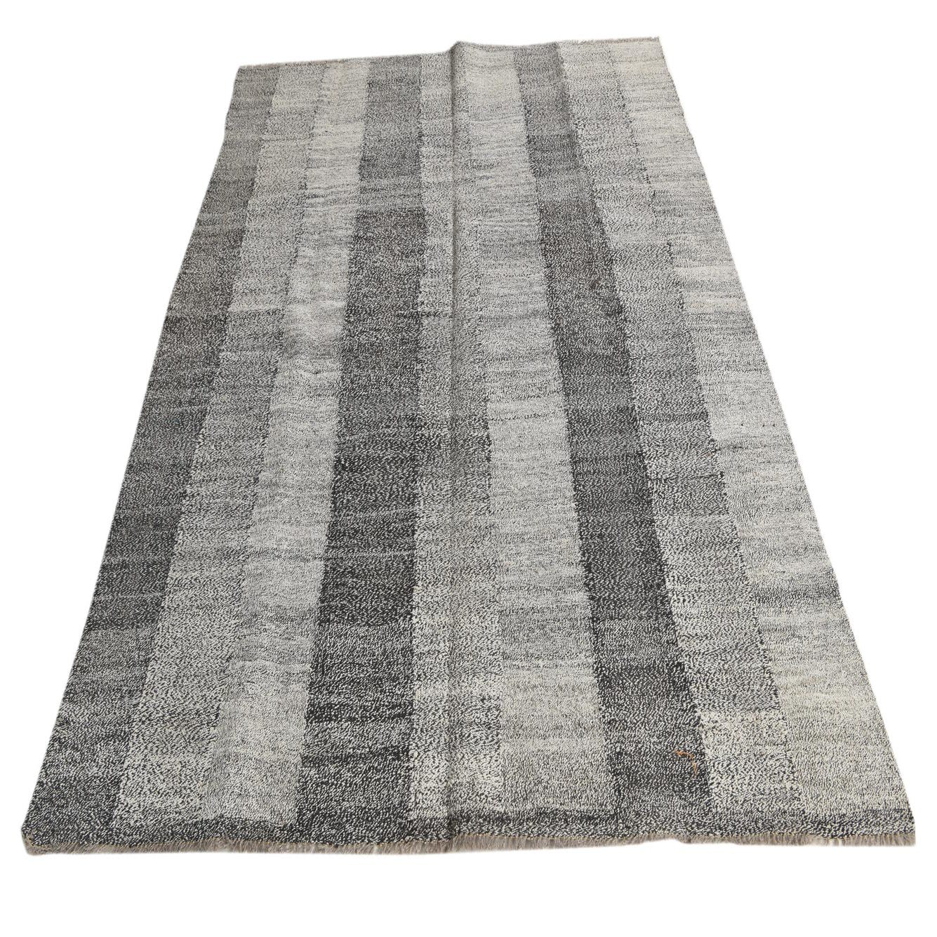 This Kilim Modern collection rug offers a harmonious blend of simplicity and style, created through a hand-woven process using 100% wool. Sized at 5x8, it presents a minimalist striped pattern featuring alternating bands of ivory and black hues. While maintaining a clean and sophisticated appearance, the texture of the wool brings tactile interest to the flatweave construction. The ivory background provides a neutral canvas, punctuated by the richness of black, creating a dynamic yet understated visual effect ideal for a variety of settings.