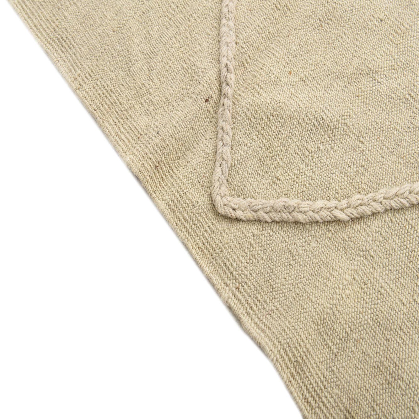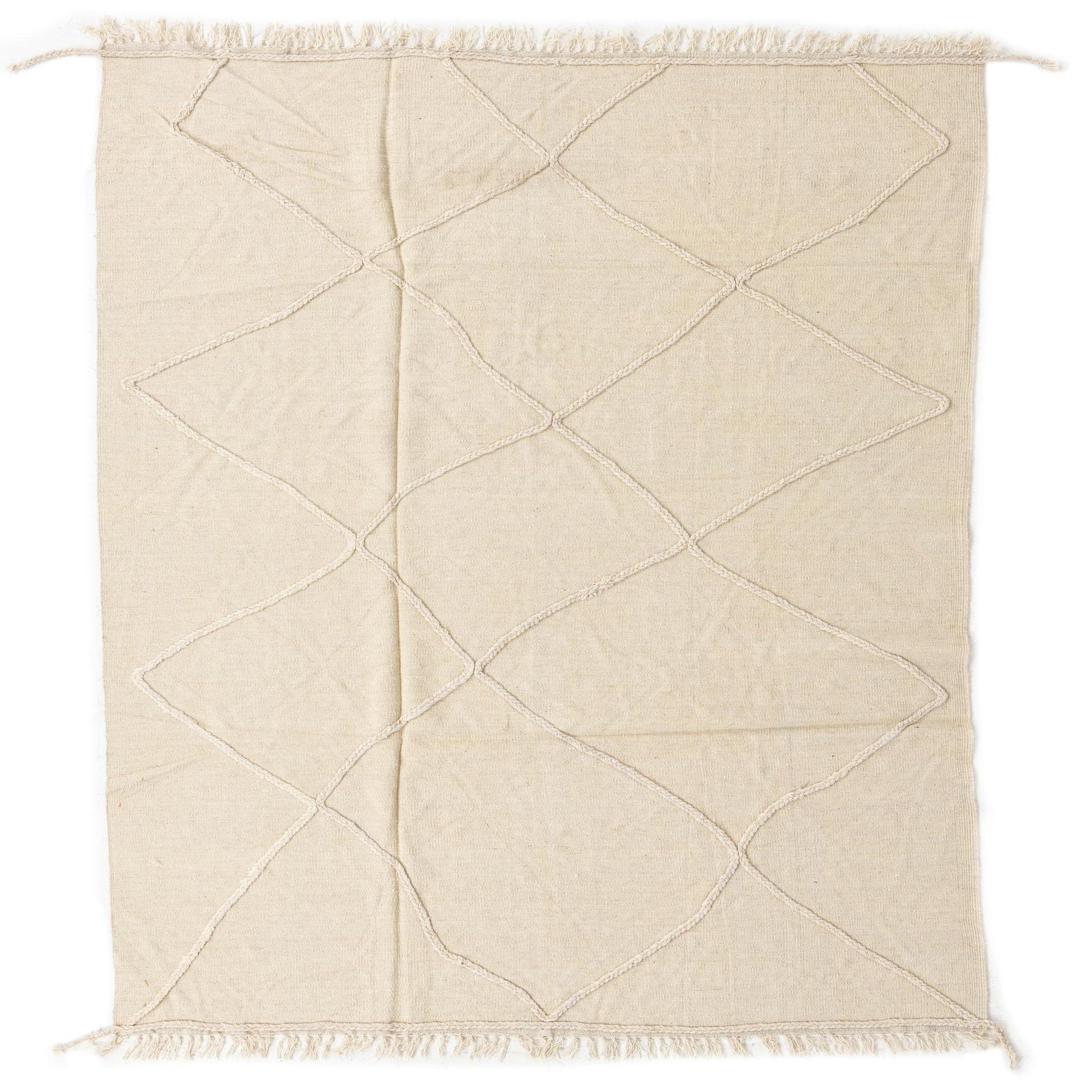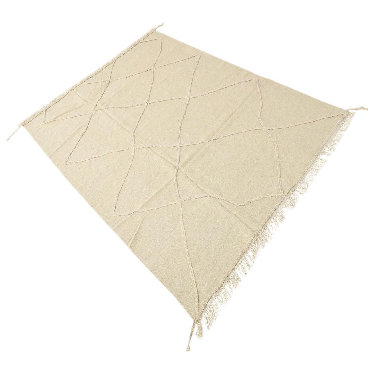 A 5x8 rectangular ivory flatweave wool rug with a subtle tribal diamond pattern and fringed ends.