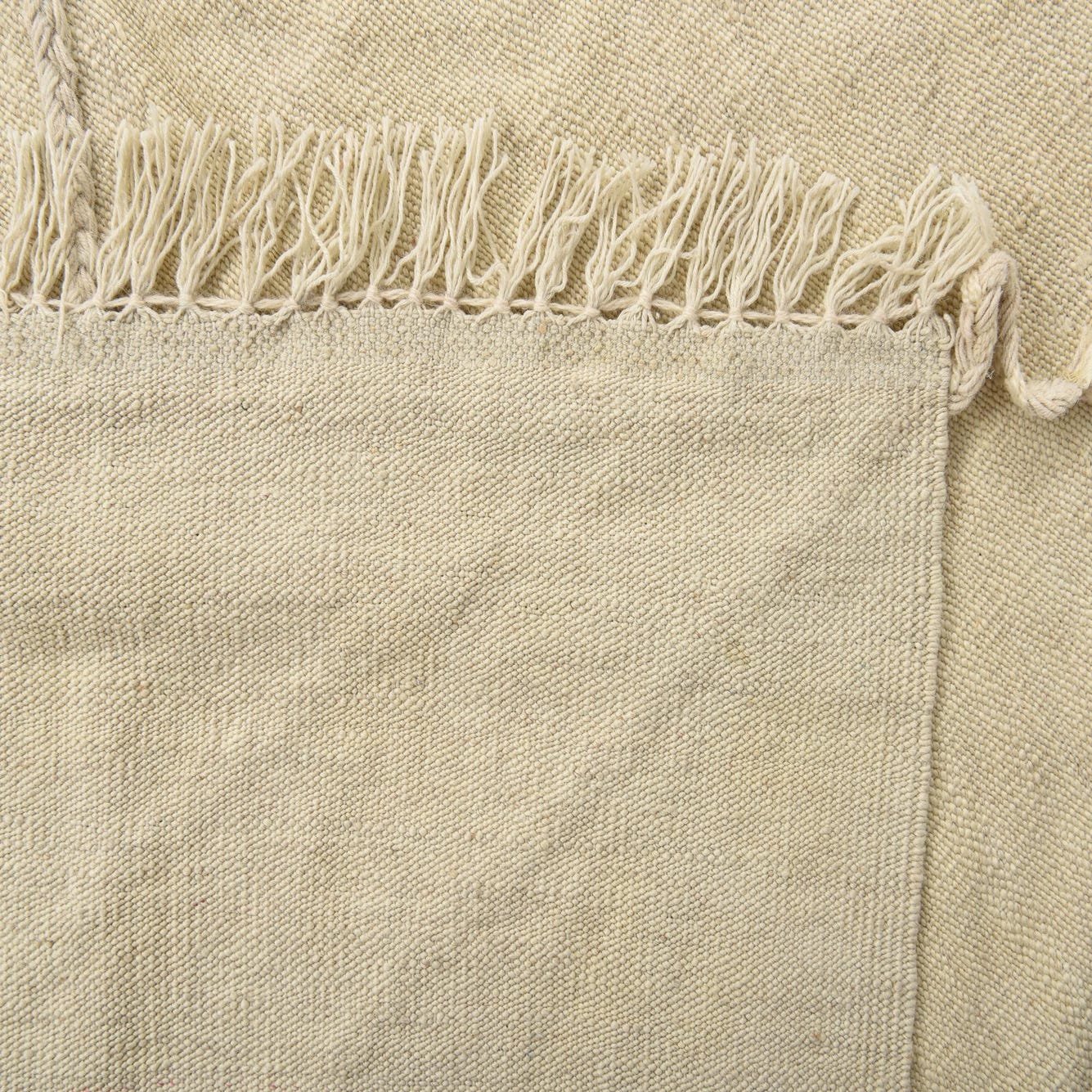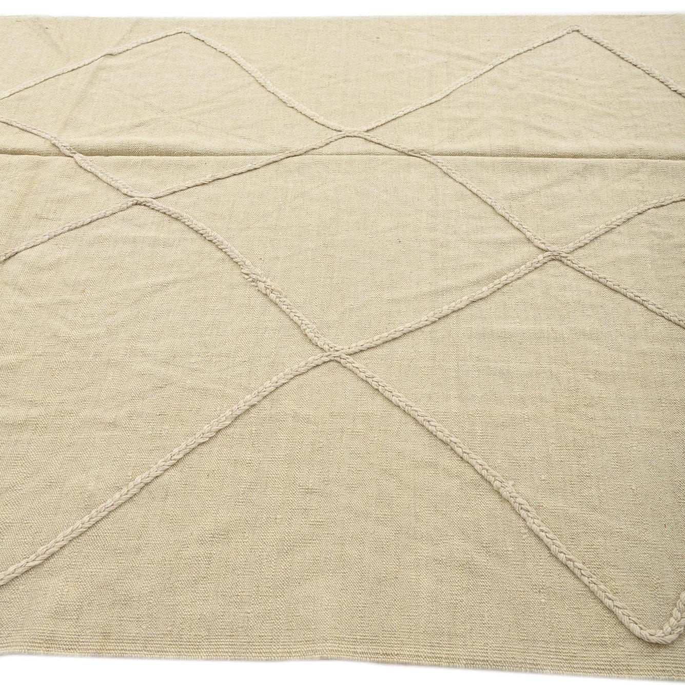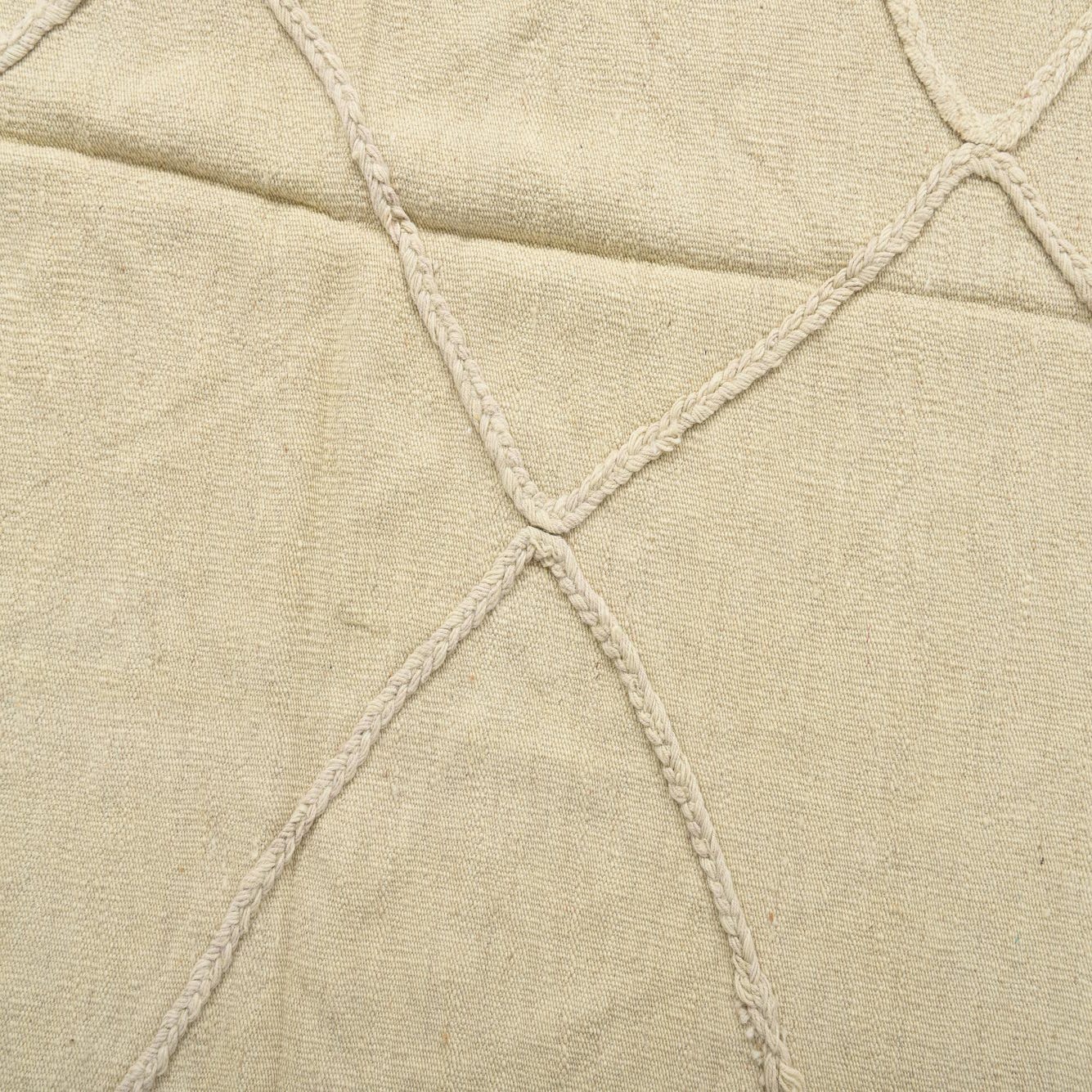 A 5x8 rectangular ivory flatweave wool rug with a subtle tribal diamond pattern and fringed ends.