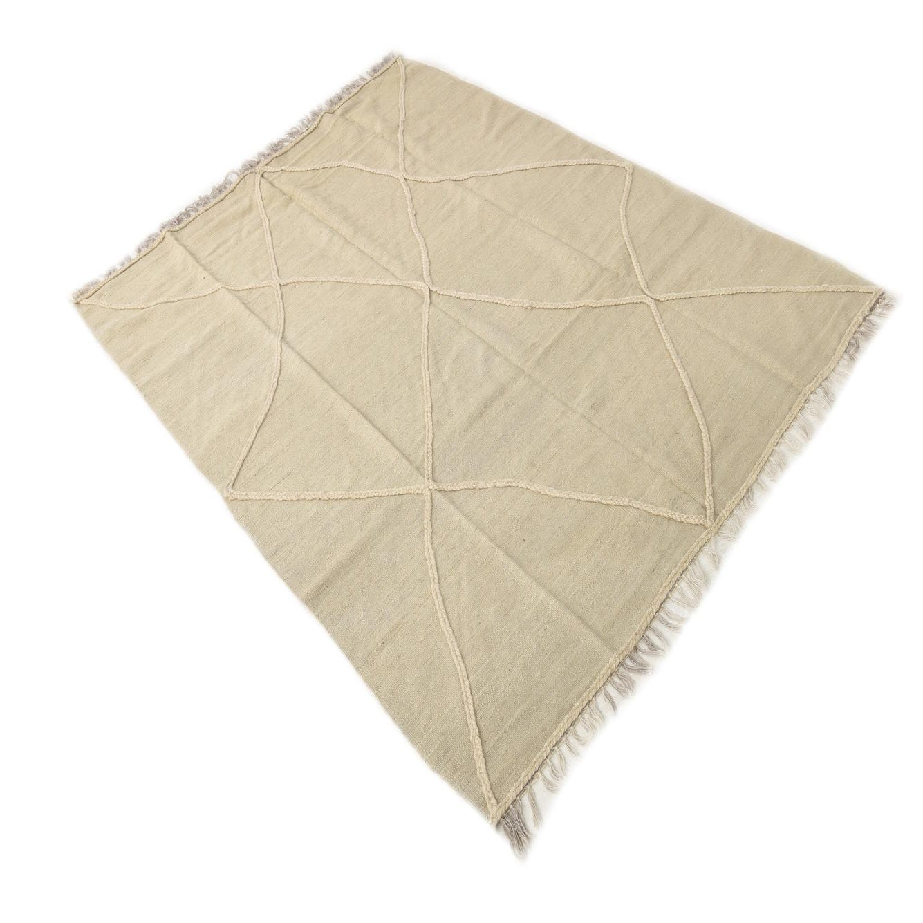 The diamond pattern interplays with the rug's texture, creating a sense of depth and sophistication. The inclusion of fringe on the ends adds a classic touch, emphasizing the handcrafted quality. This rug would pair well with natural wood furniture, metallic accents, and could serve as a subtle focal point in a living room, study or bedroom. Its neutral palette ensures that it will harmonize with a wide range of color schemes.
