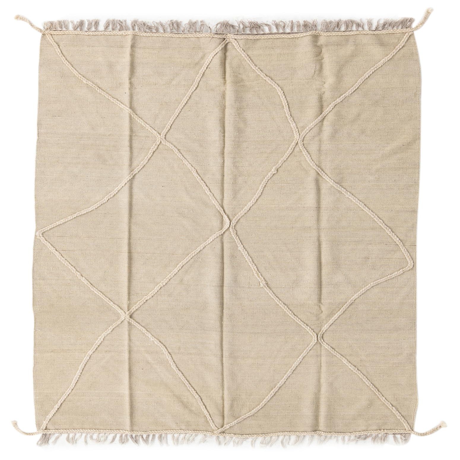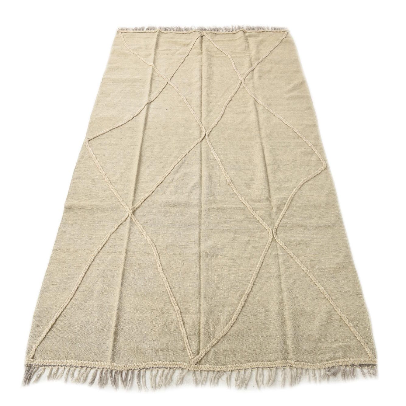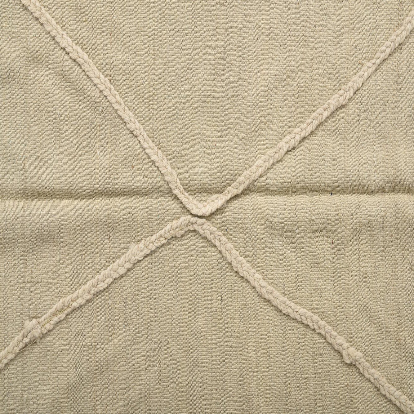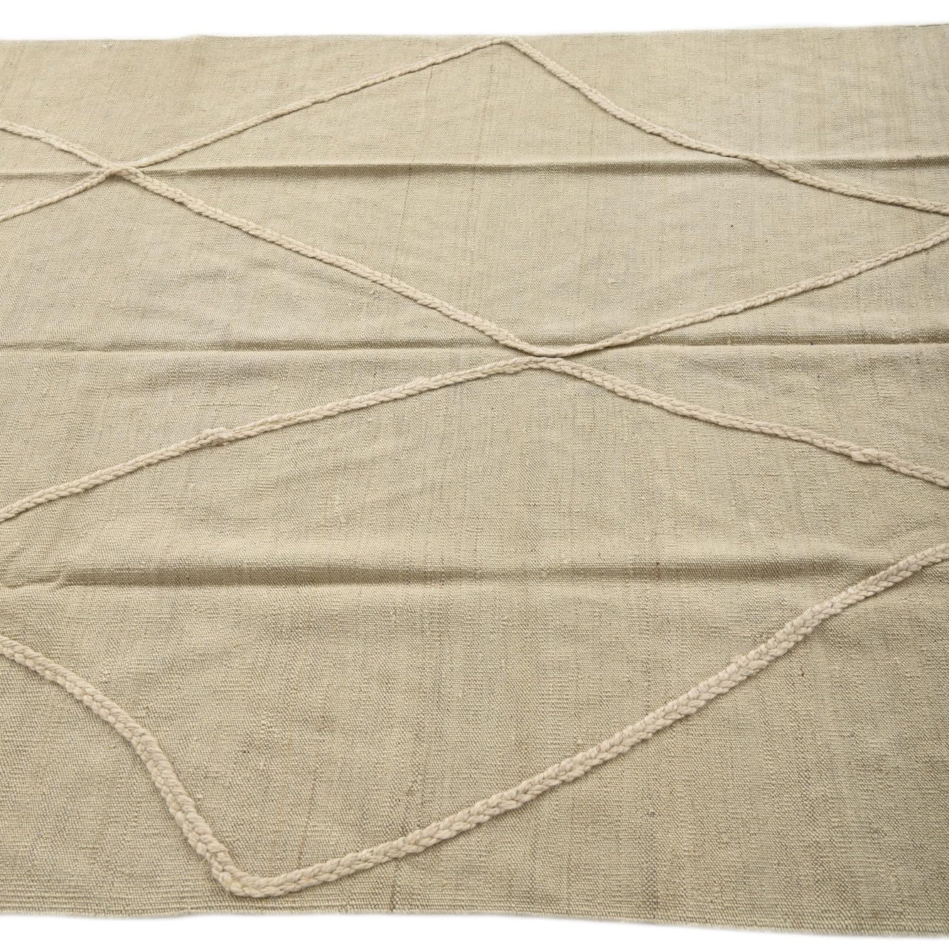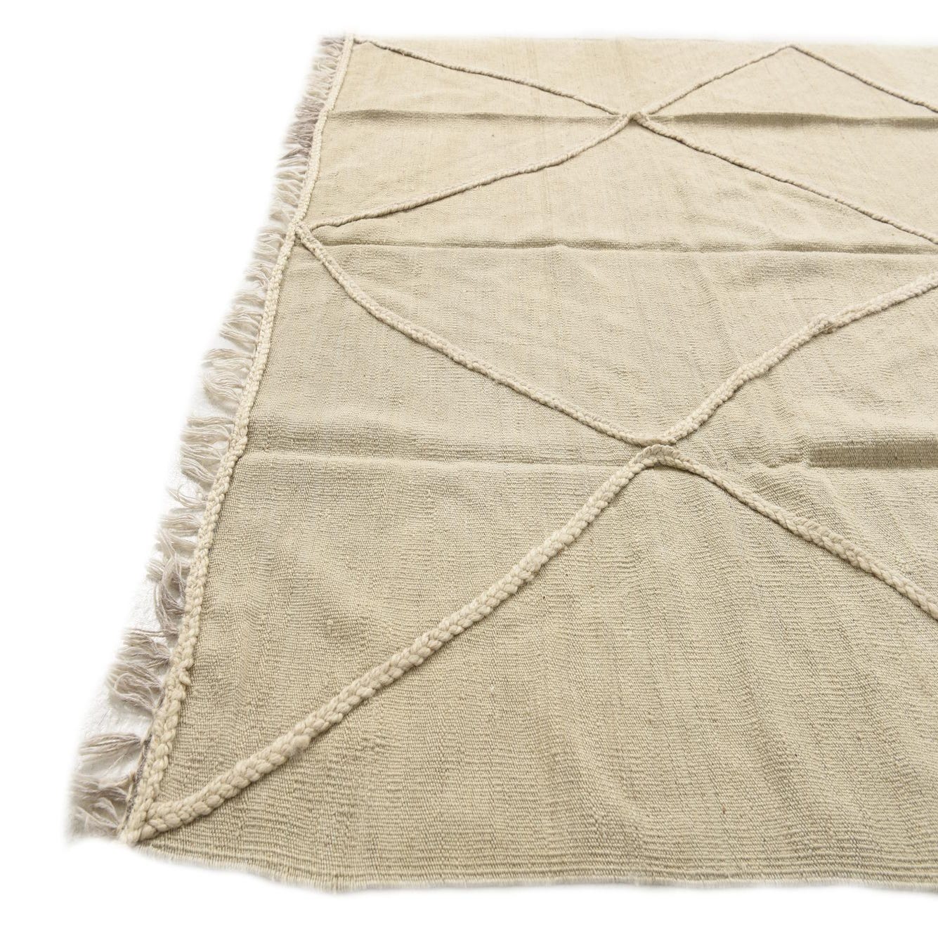 This 5x8 rug from the Kilim Modern collection offers a simplistic yet impactful design that complements a variety of interior spaces. The hand-woven 100% wool construction provides a durable surface with a natural texture. The background of the rug showcases a soft ivory hue, lending a light and airy feel to the room. An understated geometric pattern in a contrasting tone adds visual interest without overwhelming the space, making it a versatile piece for contemporary, minimalist, or Scandinavian-inspired decors.