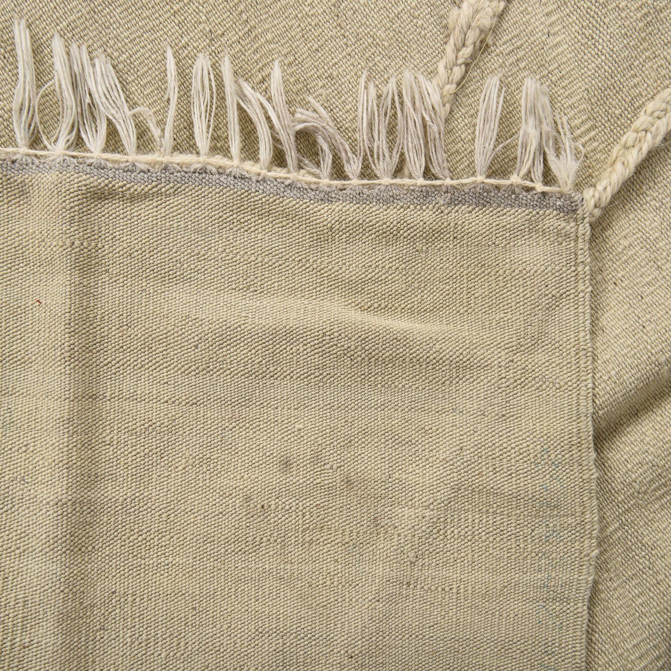 A 5x8 rectangular ivory flatweave wool rug with a subtle cream braided geometric pattern and fringed ends.