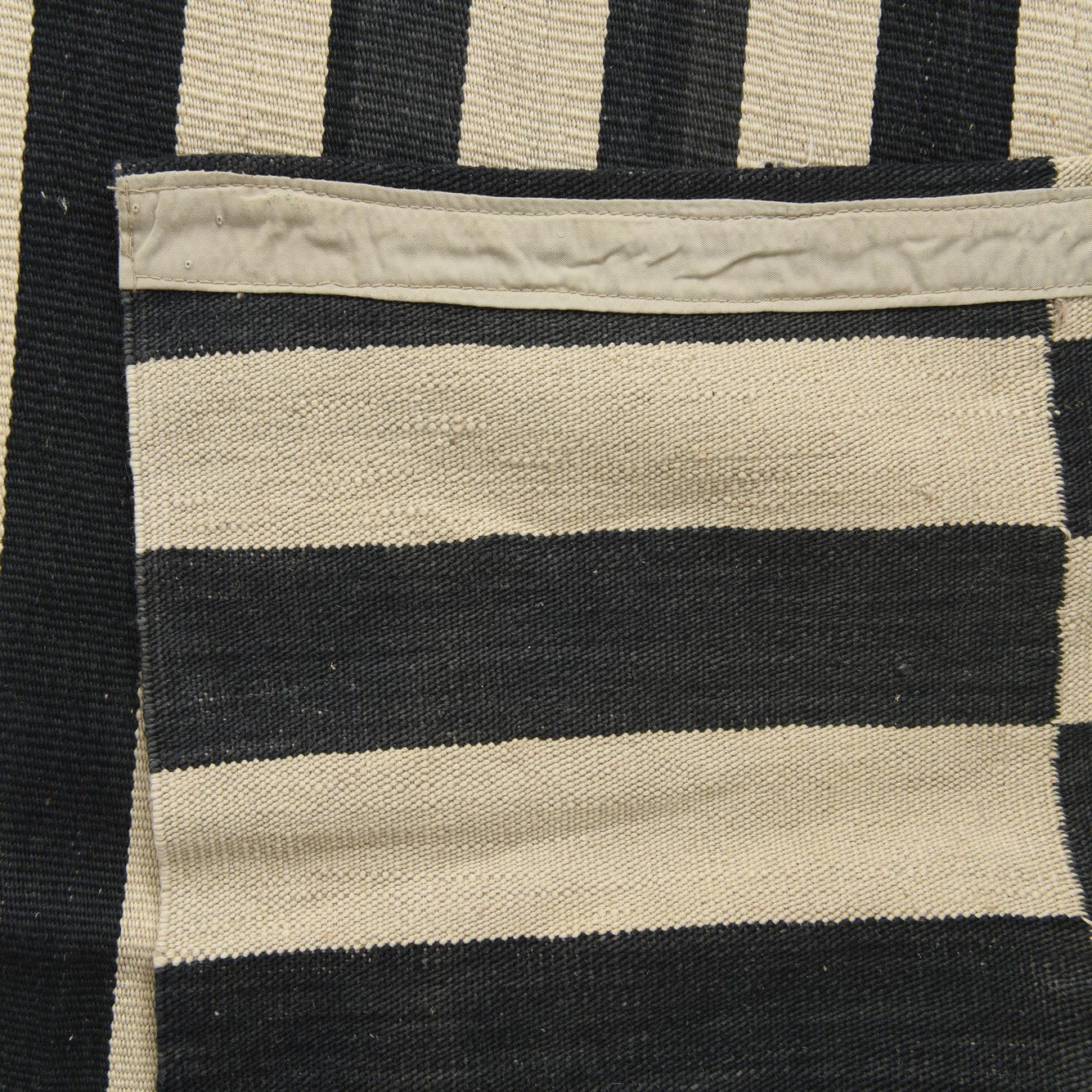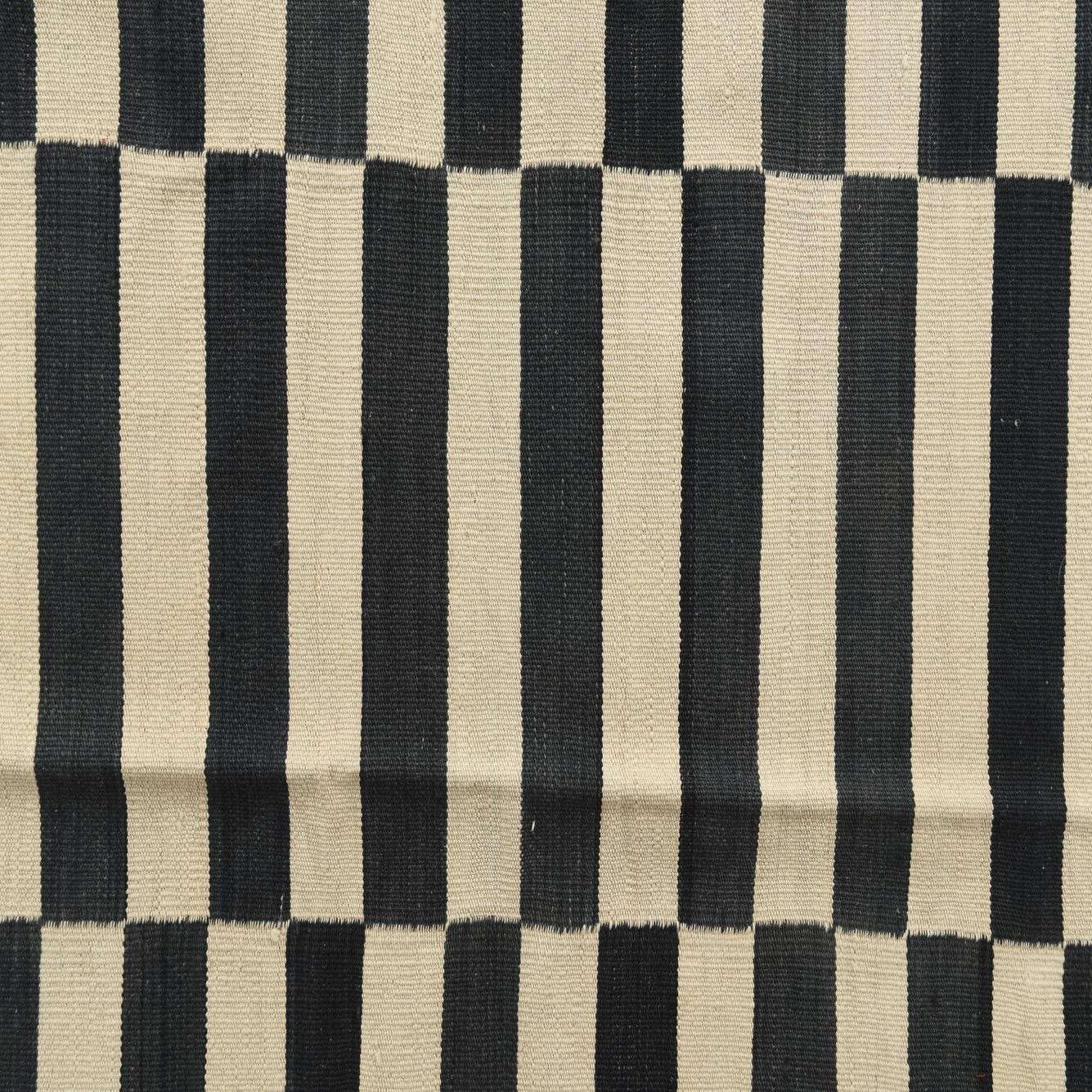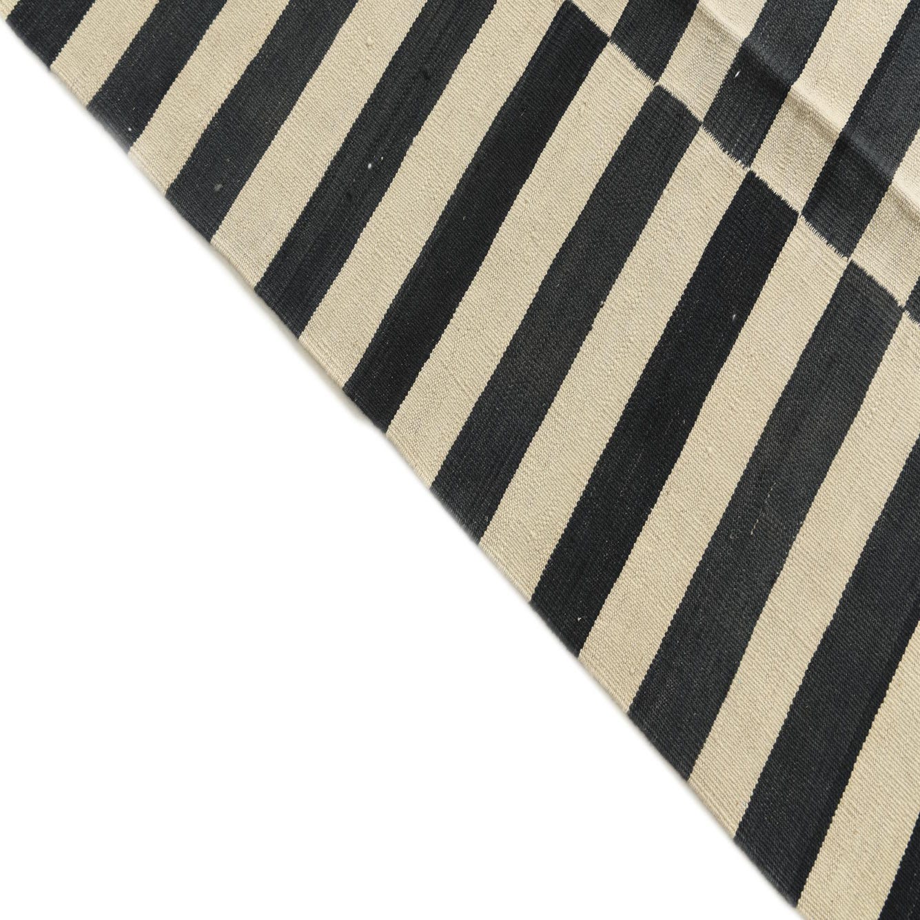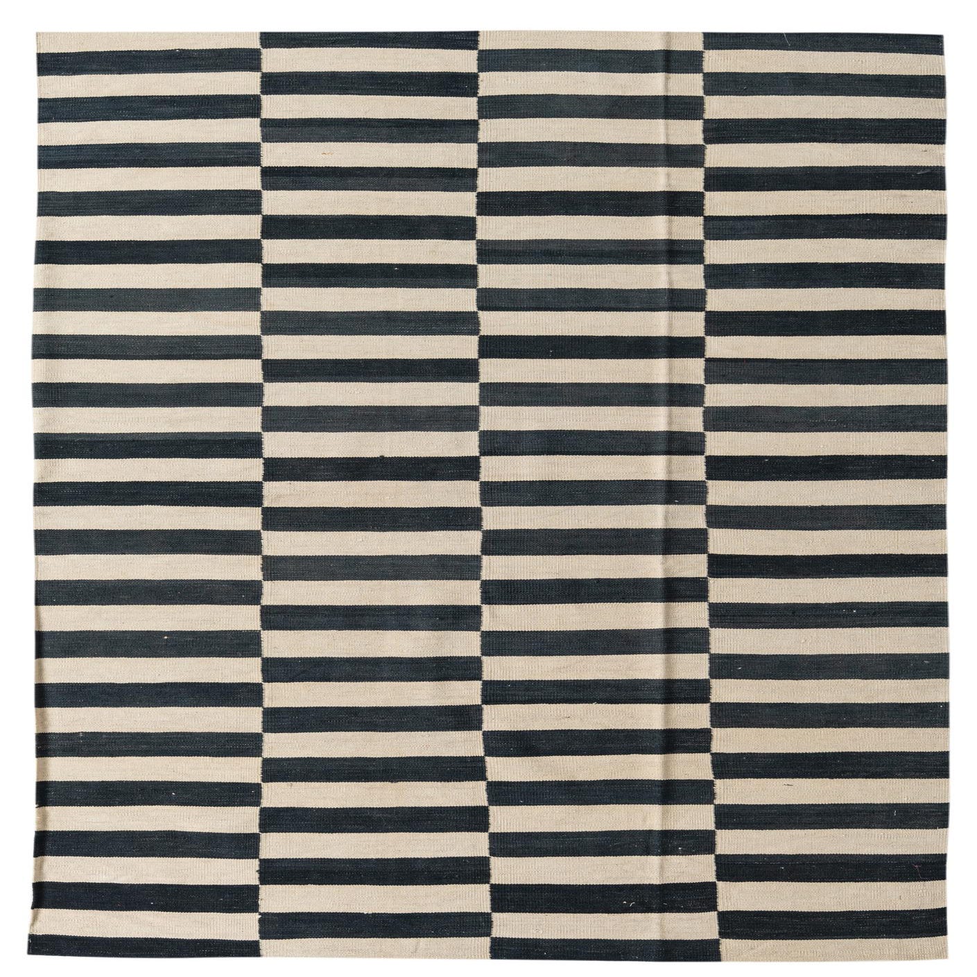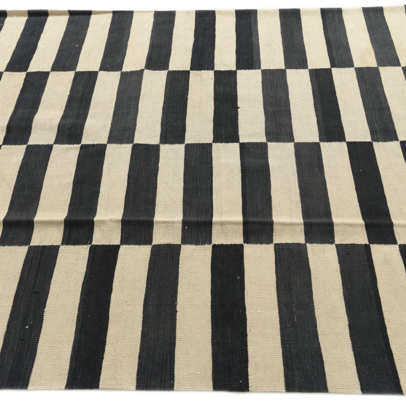 A graphic, modern flatweave that pairs clean lines with a tactile, low-profile feel. Narrow black bars are stacked into repeating vertical columns over an ivory ground, creating a rhythmic, striped motif with precise contrast. The flat, tightly woven surface has a firm hand—you can feel the wool’s slight ribbing underfoot while the open weave keeps the look streamlined and contemporary.
