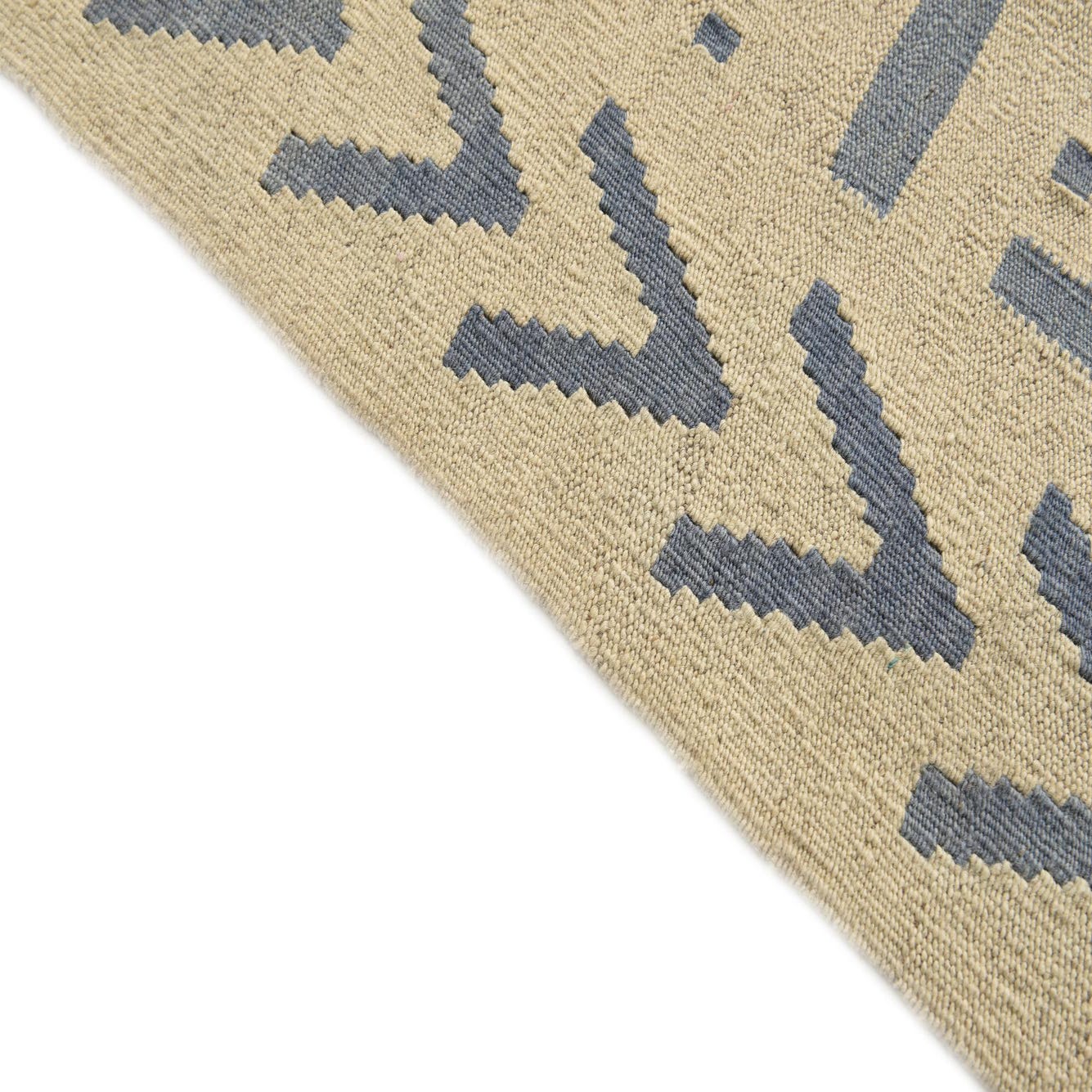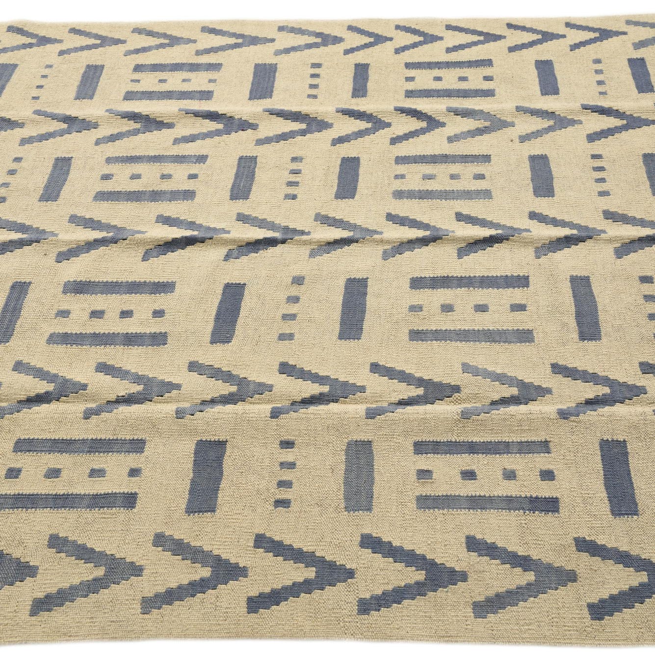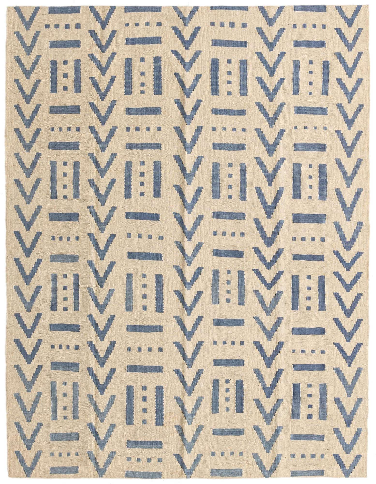 Part of the Kilim Modern collection, this hand woven 5x8 rug is crafted from 100% wool, offering a tactile and durable surface underfoot. The design boasts a sophisticated pattern featuring geometric shapes and symbols in shades of blue set against an inviting ivory background. The clean lines and crisp contrast of the pattern impart a contemporary aesthetic, complementing an array of interior styles from minimalist to eclectic.
