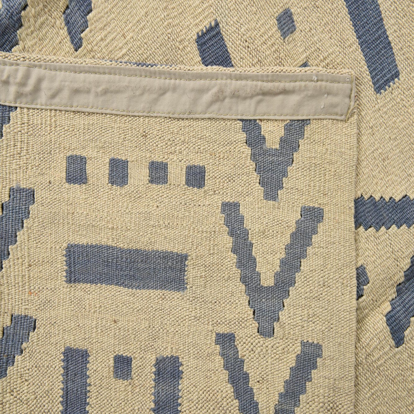 With its balanced color palette, this piece serves as a versatile foundation for a living room, office, or dining area. It pairs seamlessly with neutral furnishings to create a serene ambiance, or can be the anchor for vibrant decor, allowing the blue accents to stand out. The texture and flatweave technique add an organic touch to the space, making it an ideal selection for those who appreciate the craftsmanship and enduring quality of hand woven textiles.