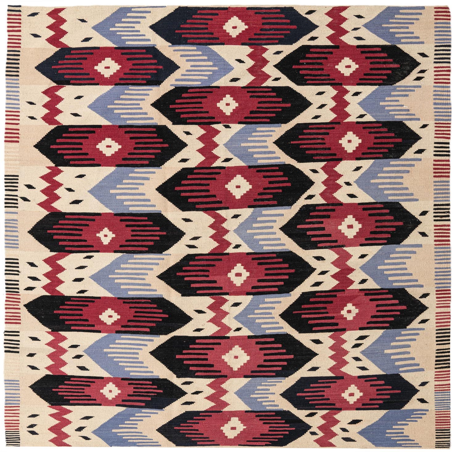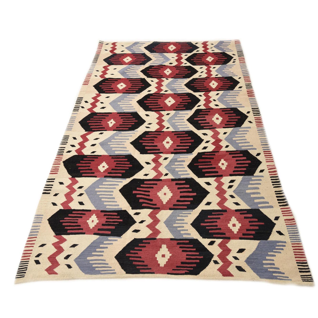 Hand-woven from 100% wool, this kilim flatweave pairs a warm ivory field with bold geometric motifs that read clean and deliberate. Rows of elongated hexagonal medallions in black and red carry small ivory diamond centers, while light blue chevrons and tiny black dash accents create a steady rhythmic pattern across the surface. Narrow striped ends and zigzag bands add a finishing graphic edge. The flat, low-profile weave has a tactile, slightly firm hand that sits close to the floor and highlights the sharp, woven edges of each shape.