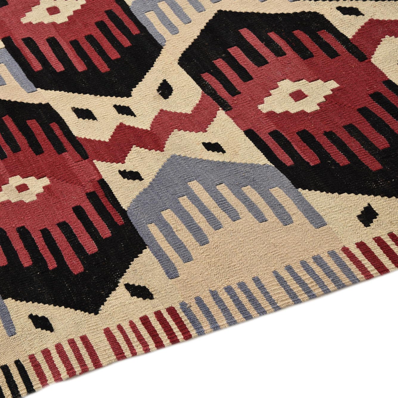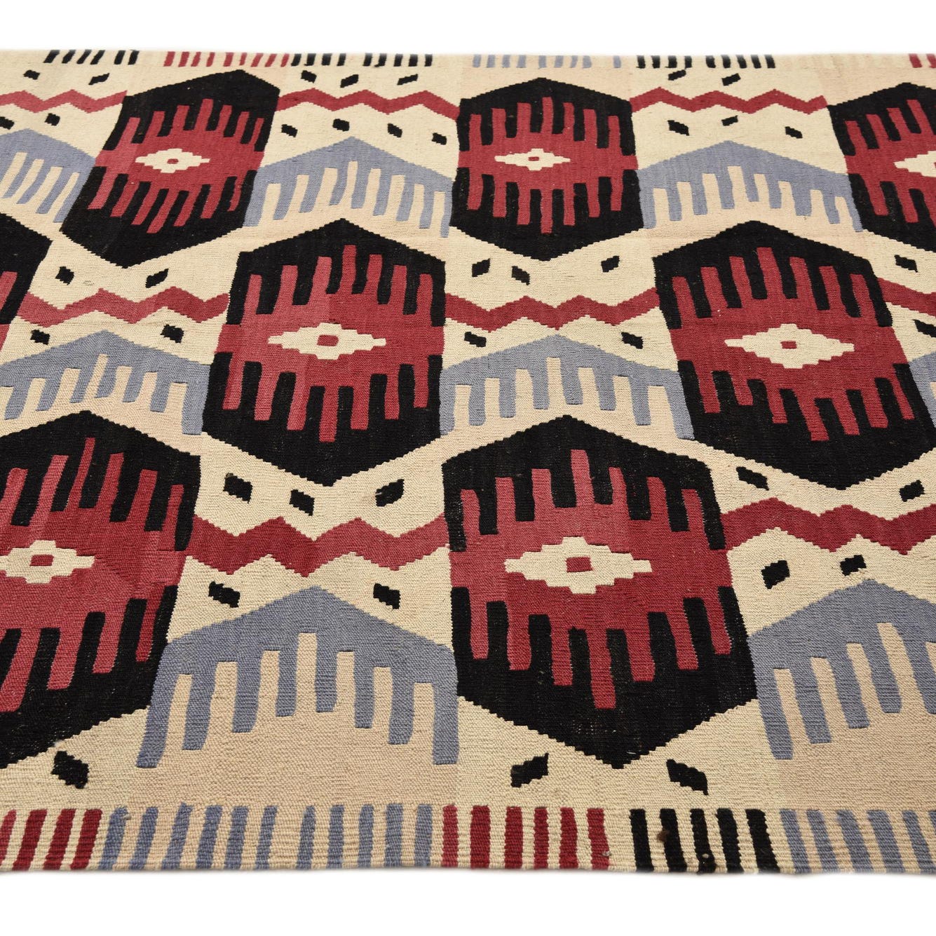 A 5x8 rectangular Kilim Modern rug with a tribal pattern in ivory, red, black, and light blue, featuring geometric shapes.