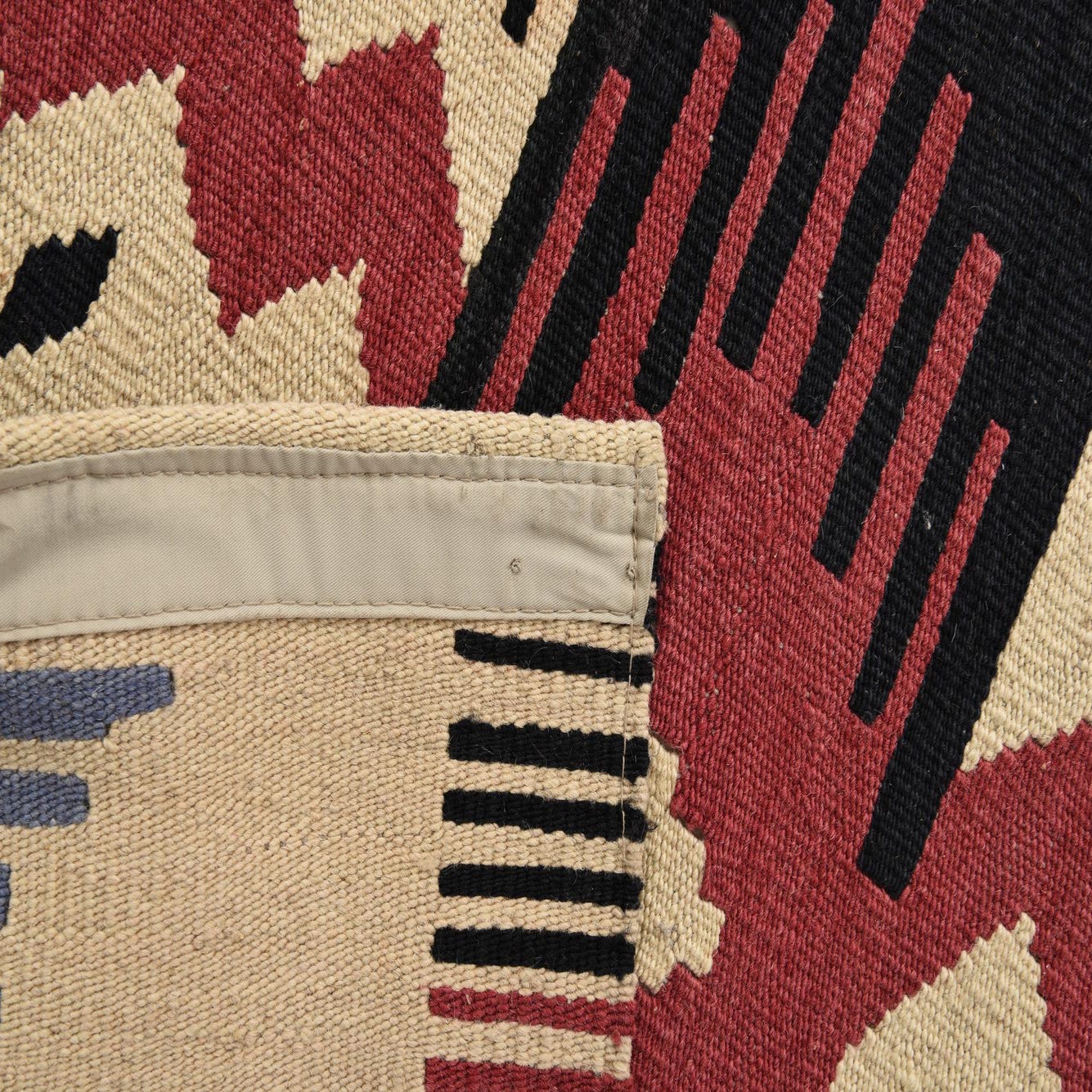 The restrained yet vivid palette of ivory, light blue, red and black complements a range of interiors — from mid-century modern and contemporary to layered boho or southwestern-inspired rooms. Place it to anchor a seating group, layer it over hardwood for added pattern and texture, or set it in a home office or bedroom to introduce color without bulk. The hand-woven wool construction provides a textured presence that integrates easily with both clean-lined and more eclectic décor.