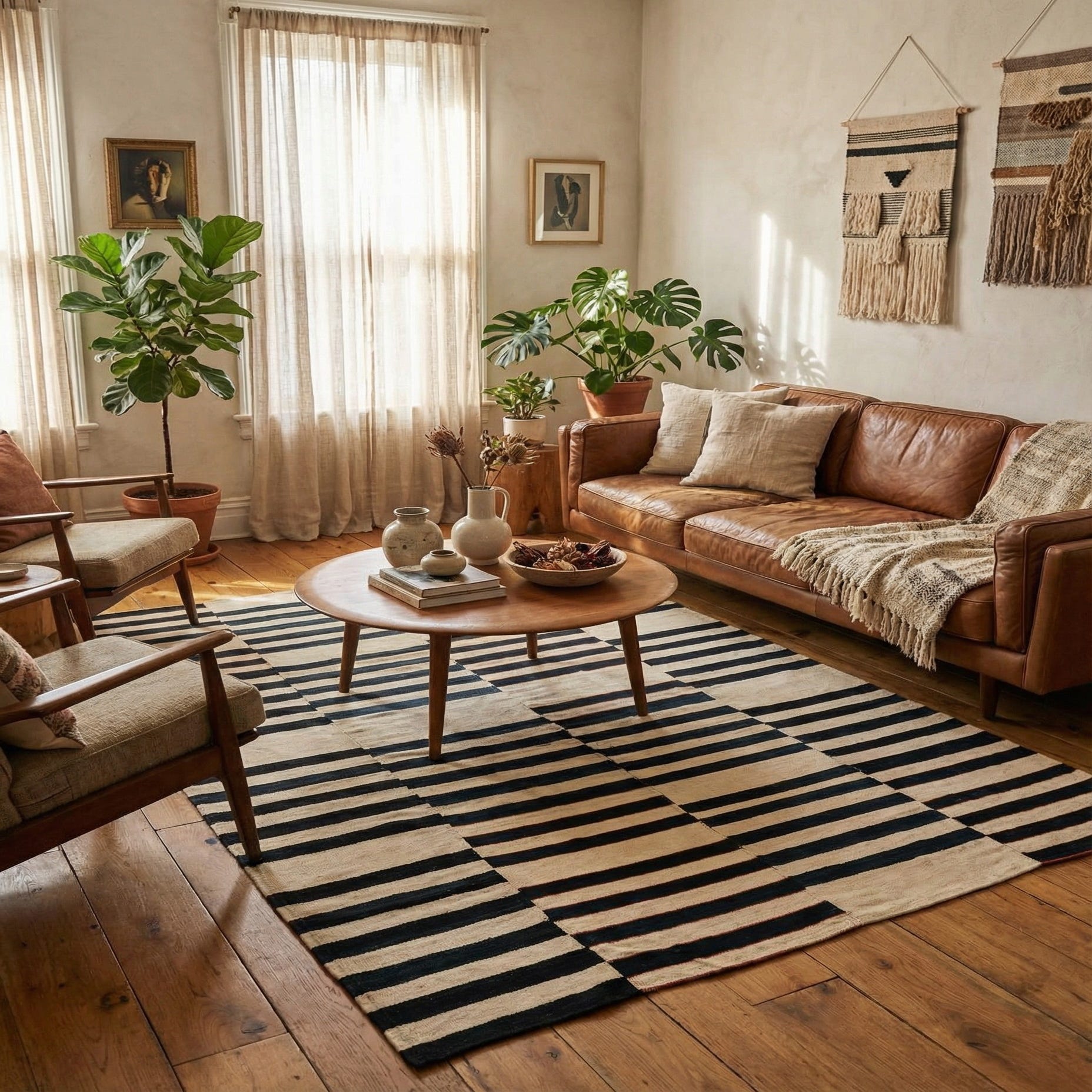 This rug works well where a graphic, grounded anchor is needed—try it beneath a low-profile coffee table in a contemporary living room, layered over wider floorboards in a Scandinavian or modern farmhouse scheme, or placed in an entryway to make a crisp first impression. It pairs easily with warm woods, black metal accents, leather seating and simple, neutral upholstery to let the striped pattern carry the room.