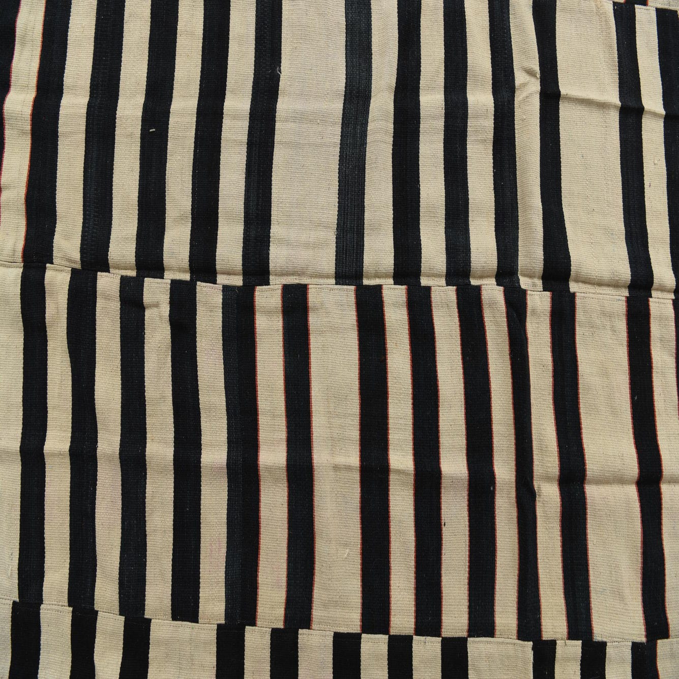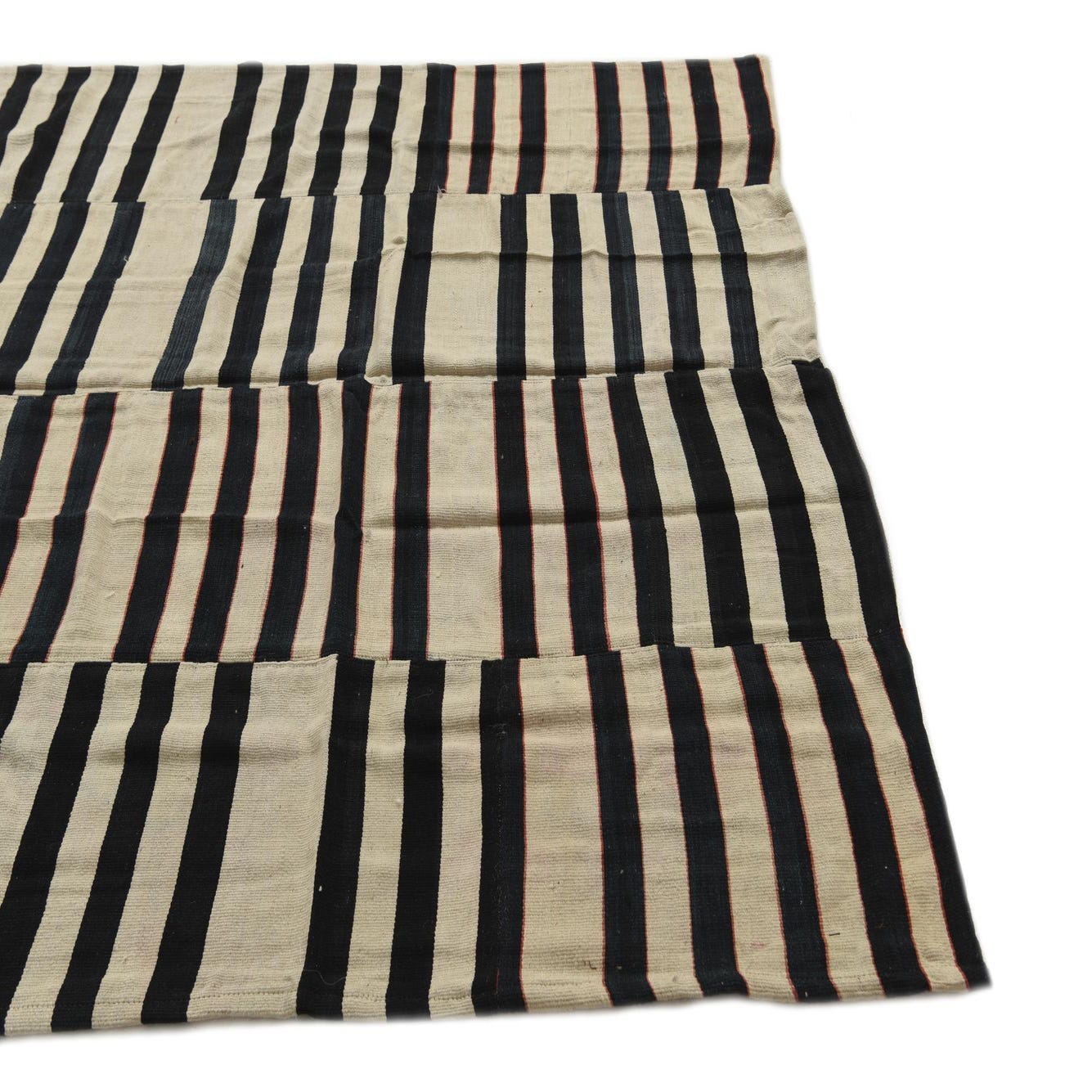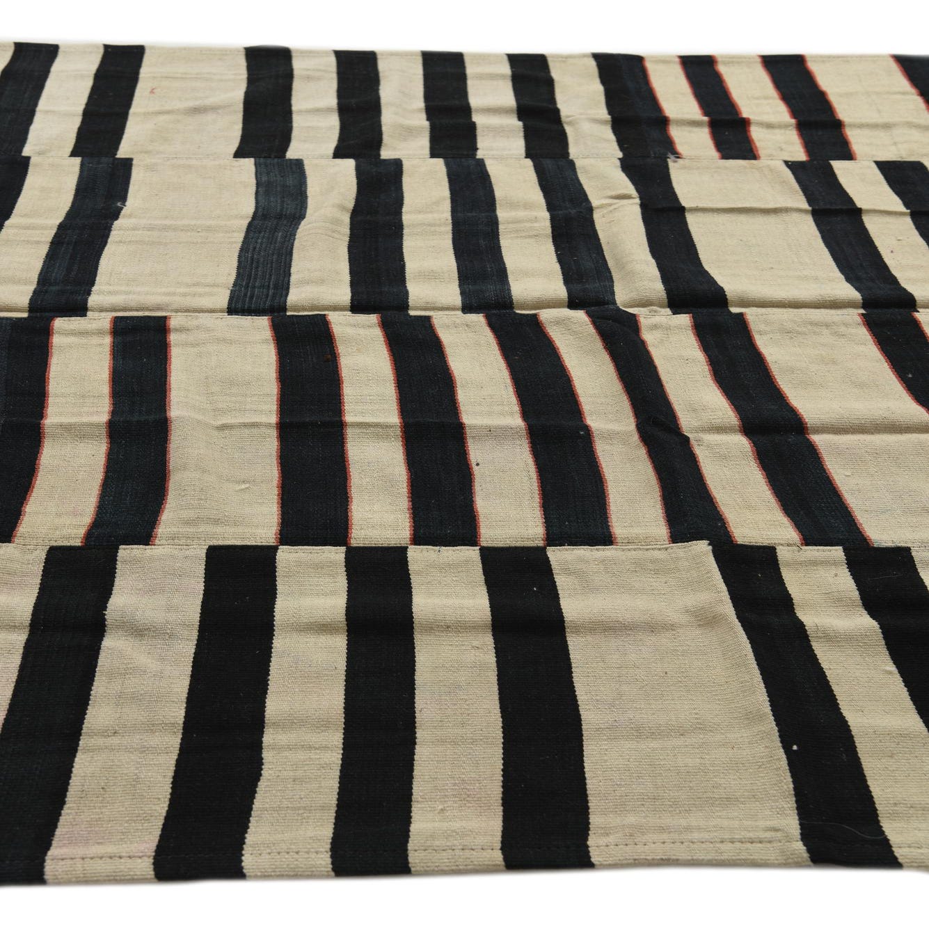 A 5x8 rectangular Kilim Patchwork rug with alternating ivory and black horizontal stripes, showcasing a tribal, modern aesthetic.