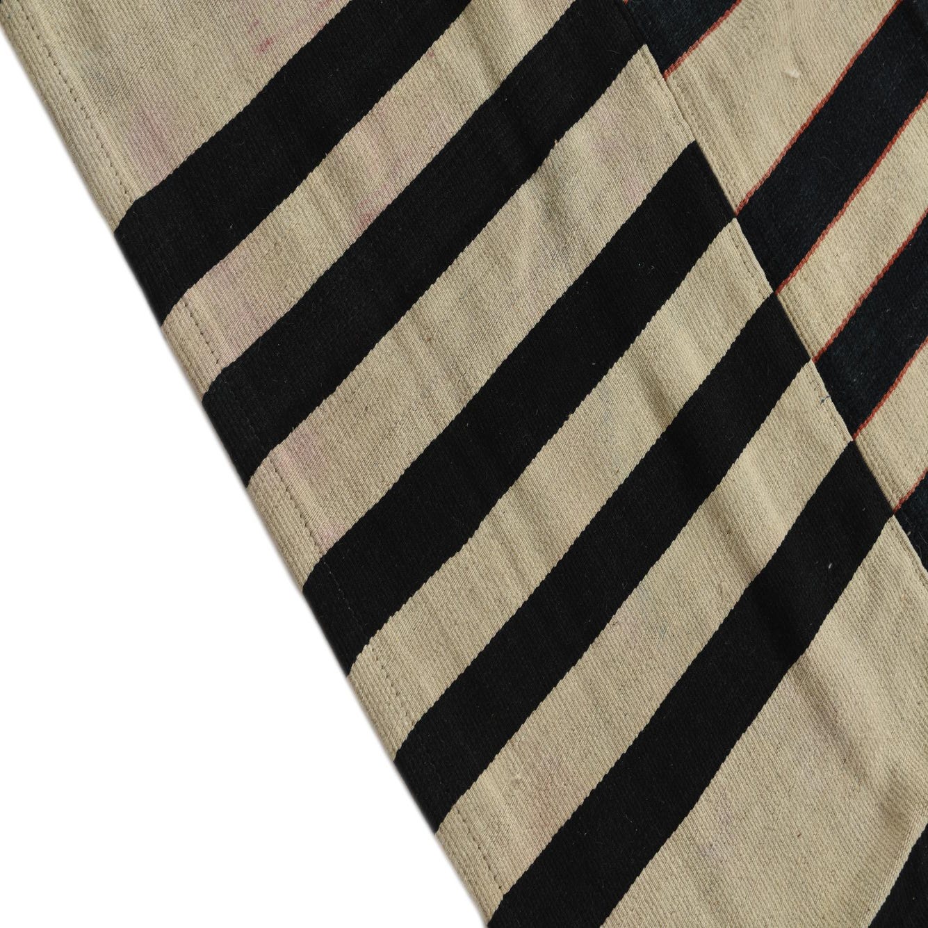 Hand-woven from 100% wool in a flatwoven kilim construction, this rug is made from vertical pieced panels that create a patchwork of bold horizontal stripes. A clean ivory ground sets the stage for deep black bands punctuated by narrow red lines, producing a graphic, rhythmic pattern. The flat surface has a firm, tactile feel underfoot while the wool fibers lend a warm, slightly textured hand that sits low to the floor.
