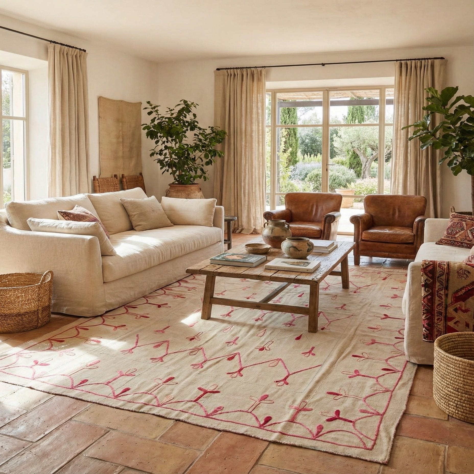 Hand woven of 100% wool, this piece brings a cozy, natural texture to a room without adding bulk. It works well layered in a relaxed living room beneath a coffee table, as an accent under a small dining set, or at the foot of a bed to introduce soft color. Pair it with light woods and linen upholstery for a modern-Scandinavian look, use it to warm a boho or eclectic seating area, or add it to a pastel-focused bedroom to tie together pink and peach accents.