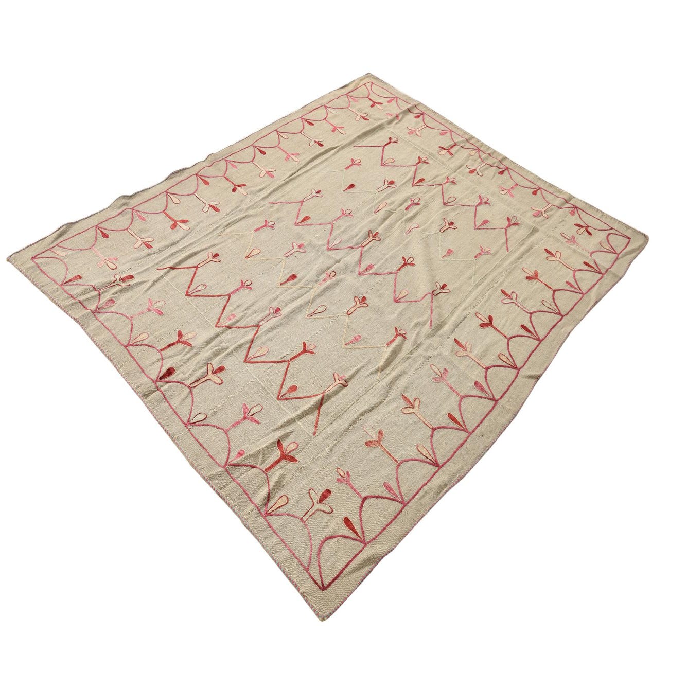 A 5x8 rectangular Kilim Suzani rug featuring a cream background with intricate tribal and floral patterns in shades of red and pink.
