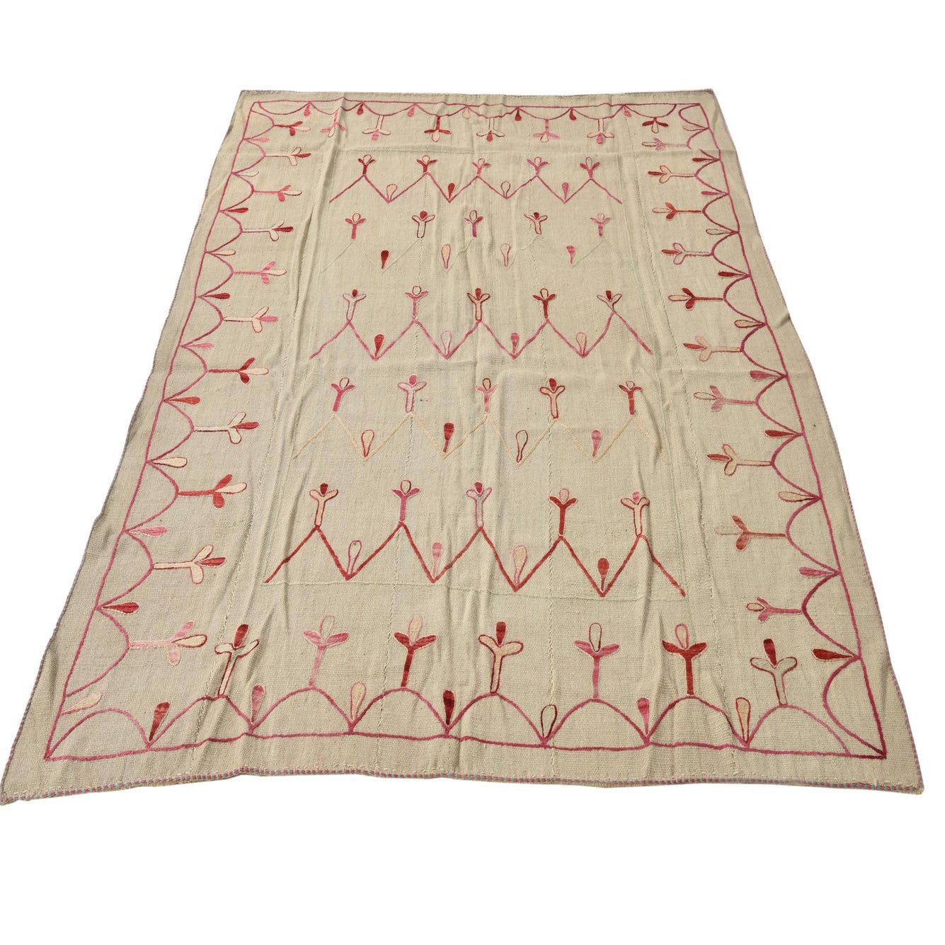 A soft ivory field provides a calm backdrop for a repeating linear motif of stylized floral drops and connected chevrons, finished with a scalloped border. The design is worked in warm reds, lively pinks and hints of peach that sit like hand-dyed stitches against the pale ground. The flat-woven surface has a low-profile, tactile feel, with the colored motifs sitting slightly raised so you notice the handwork as soon as you run your fingers across it.