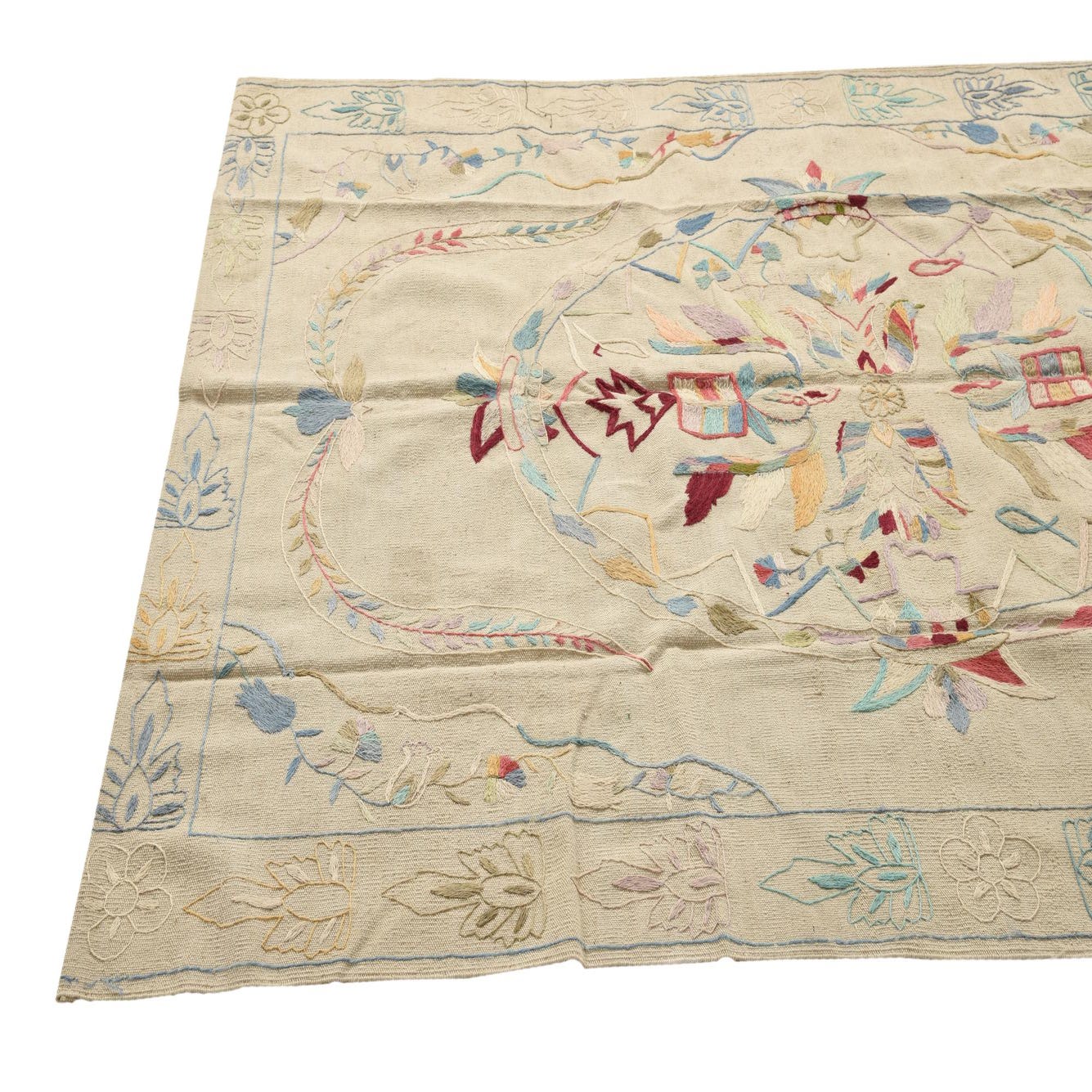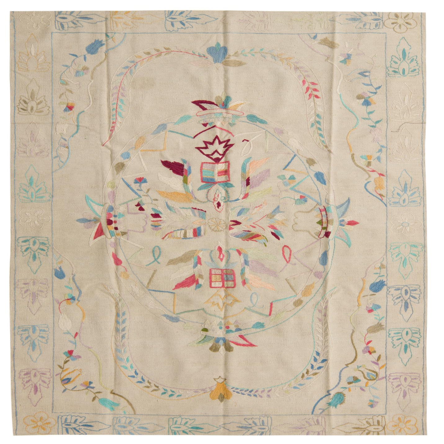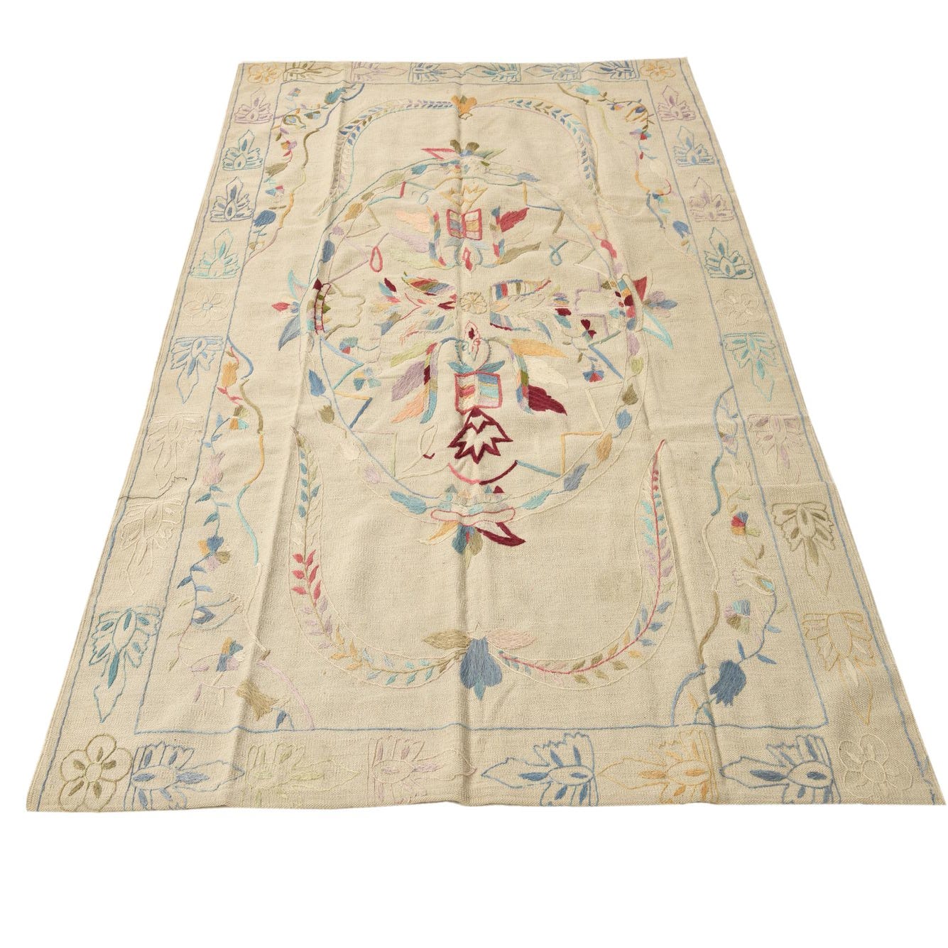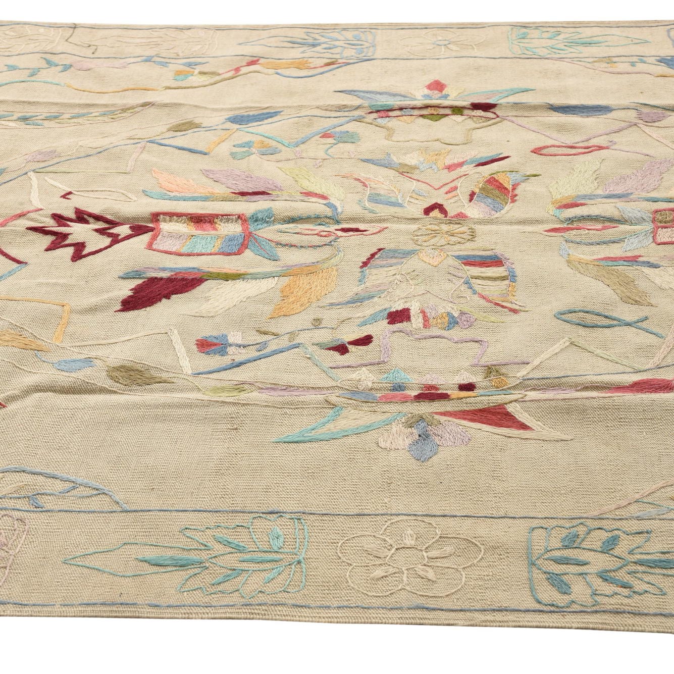 A 5x8 rectangular ivory Kilim Suzani wool rug with a vibrant, multicolored floral and tribal pattern, handmade flatweave.