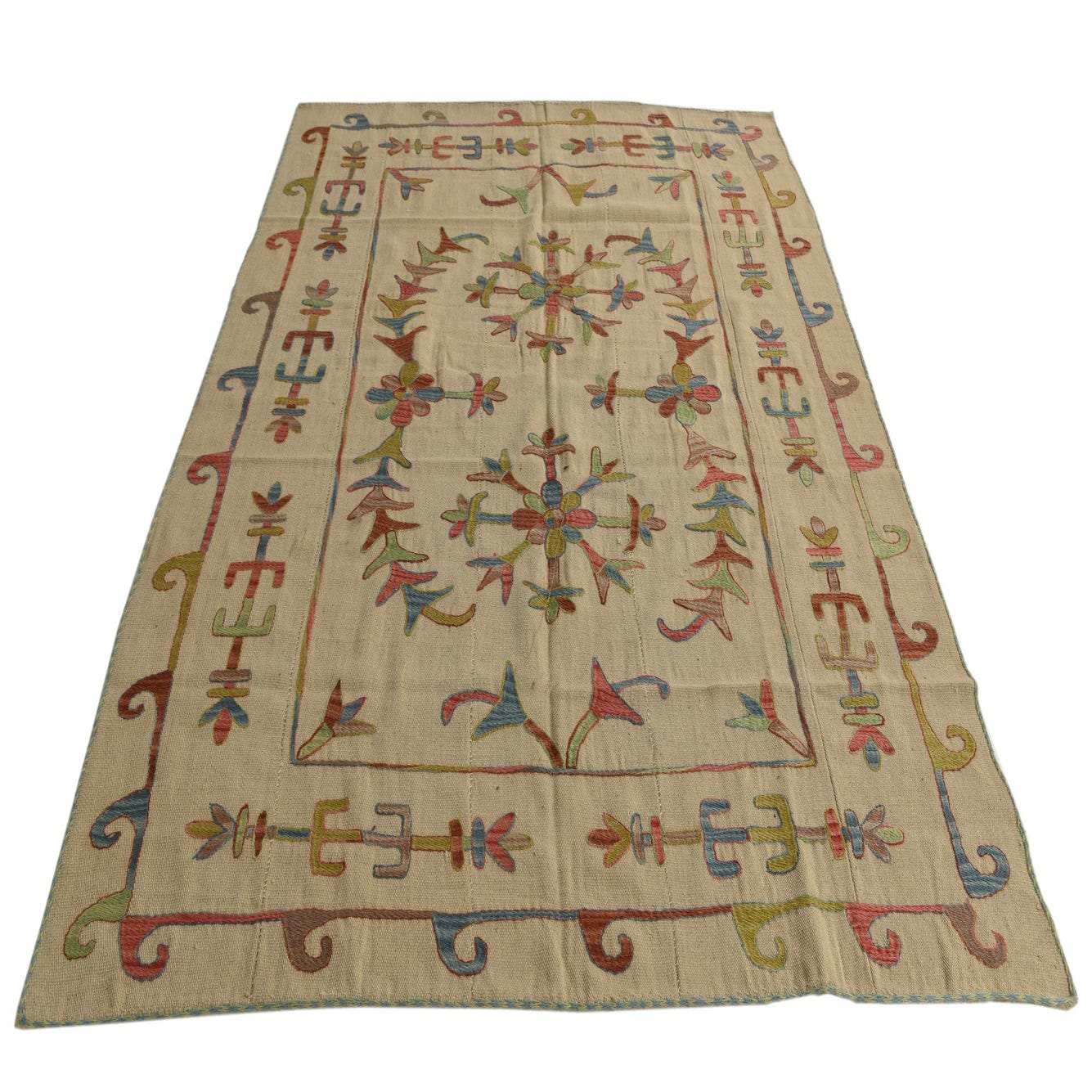 The rug's detailed borders complement the central design, lending a sense of tradition and harmony to the piece. This combination of patterns and colors makes the Kilim Suzani rug well suited for a variety of interiors, from eclectic and bohemian spaces to more contemporary or maximalist environments where it can serve as a focal point. It pairs beautifully with natural wood finishes, leather accent pieces, and a range of textiles, allowing it to harmoniously integrate into a curated home setting.