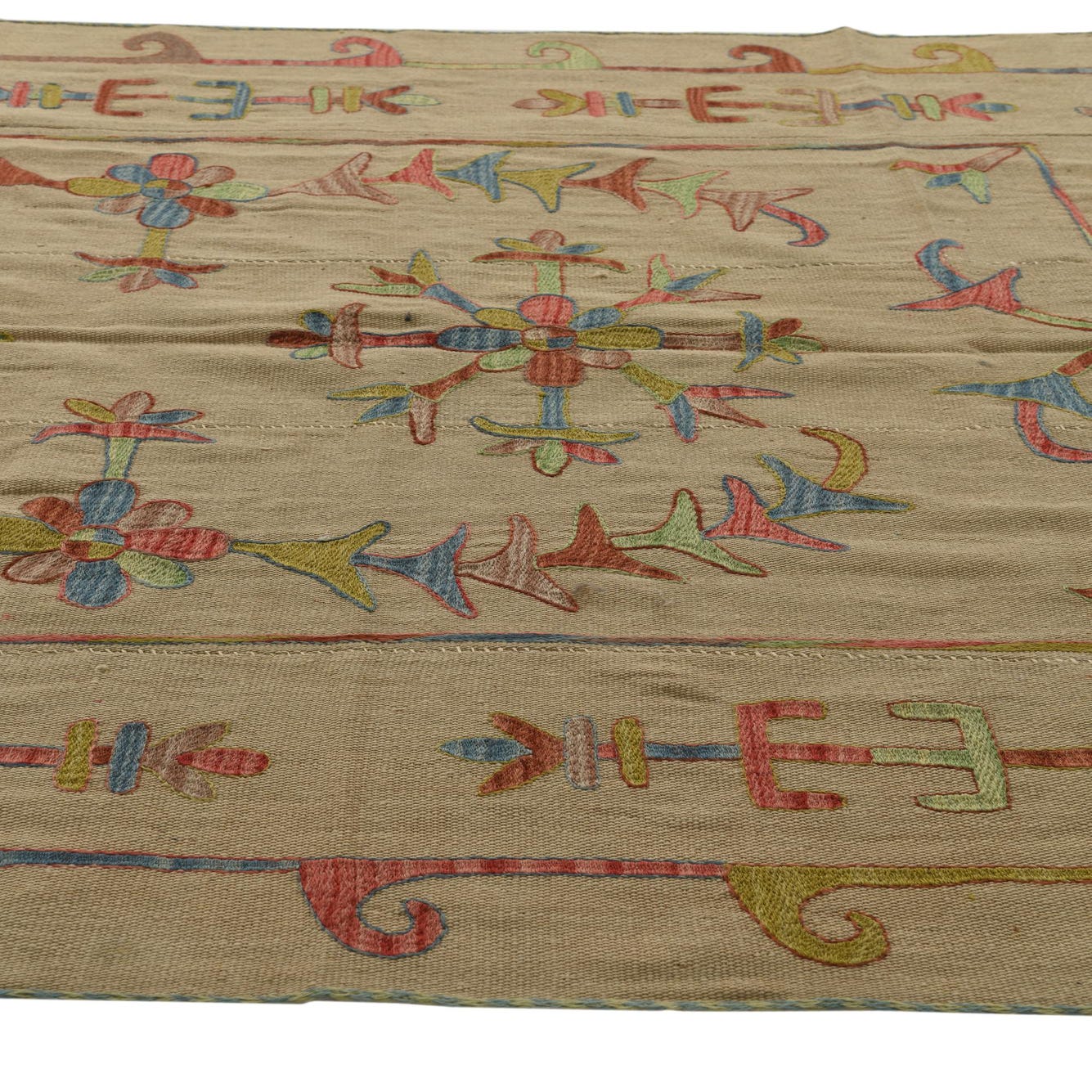 A 5x8 rectangular ivory Kilim Suzani rug with a colorful tribal pattern, featuring abstract floral motifs and geometric borders in red, blue, green, and yellow.
