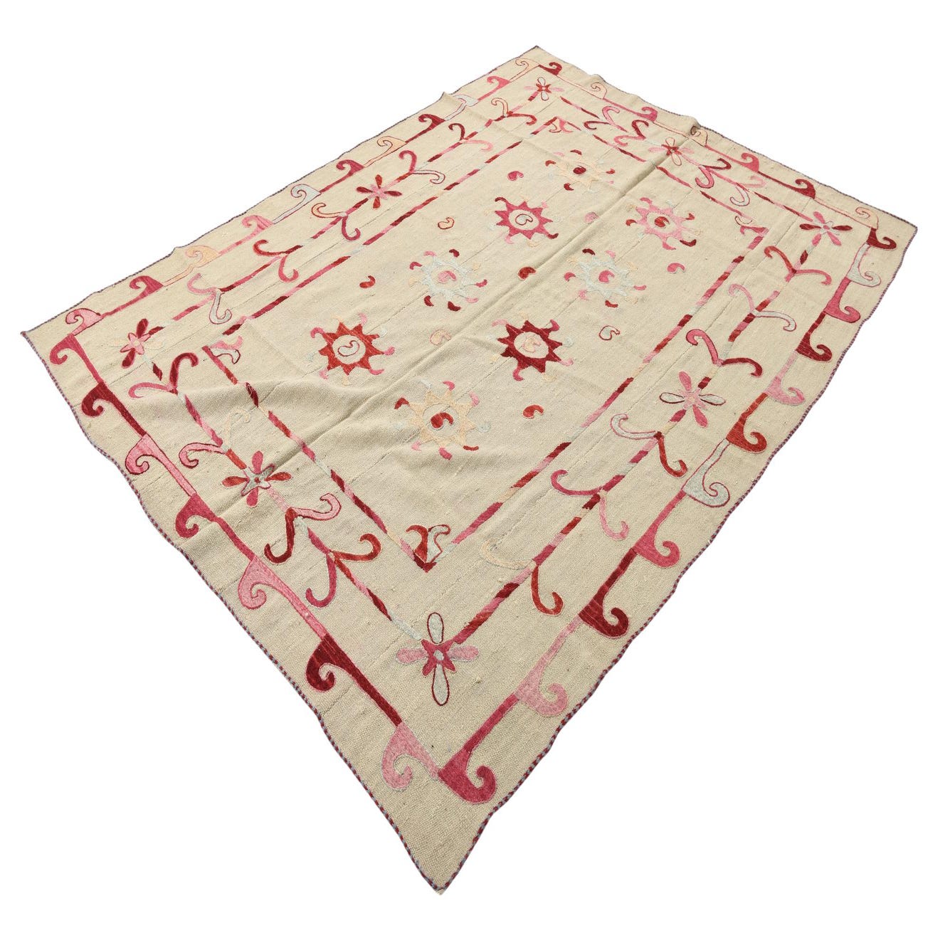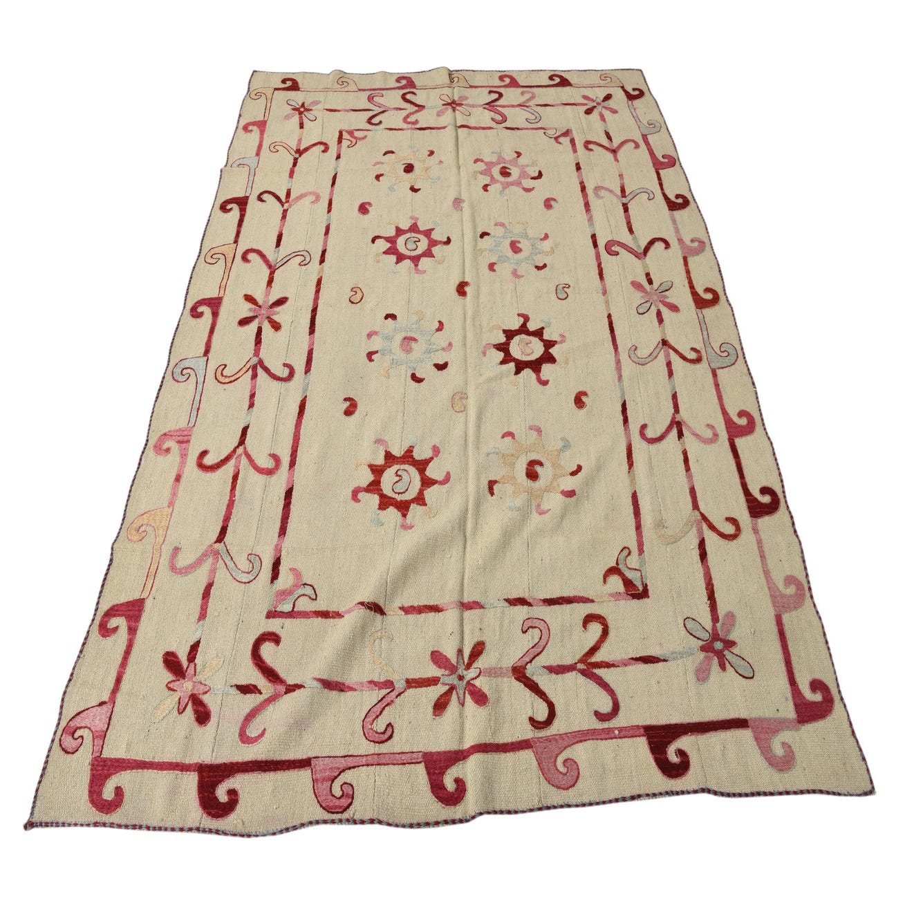 A 5x8 rectangular ivory Kilim Suzani rug with a tribal border and abstract floral motifs in red, pink, and light blue.