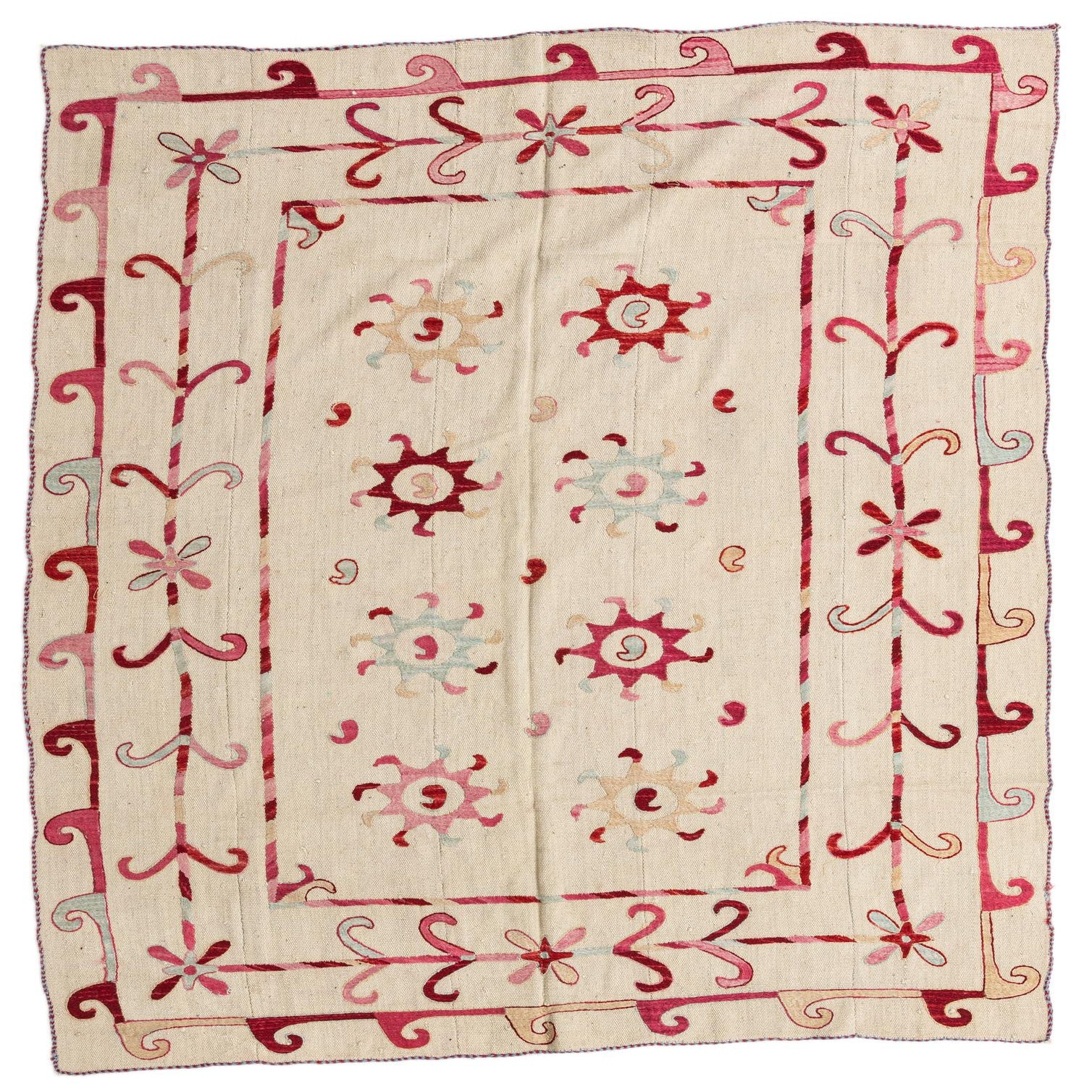 The flatweave texture of the rug provides a smooth and durable surface, suitable for high-traffic areas and helps create an unobtrusive but aesthetically appealing element in a room. Its predominantly ivory backdrop anchored by the bolder border colors allows for versatility in interior design settings, making it an ideal choice for spaces with a bohemian, rustic, or eclectic decor. Consider pairing this Kilim Suzani rug with natural wood furnishings, artisanal accents, or alongside a mix of rich textiles to create a layered and textured interior landscape. Its understated elegance also complements modern minimalist aesthetics, where the rug can serve as a focal point without overwhelming the space.