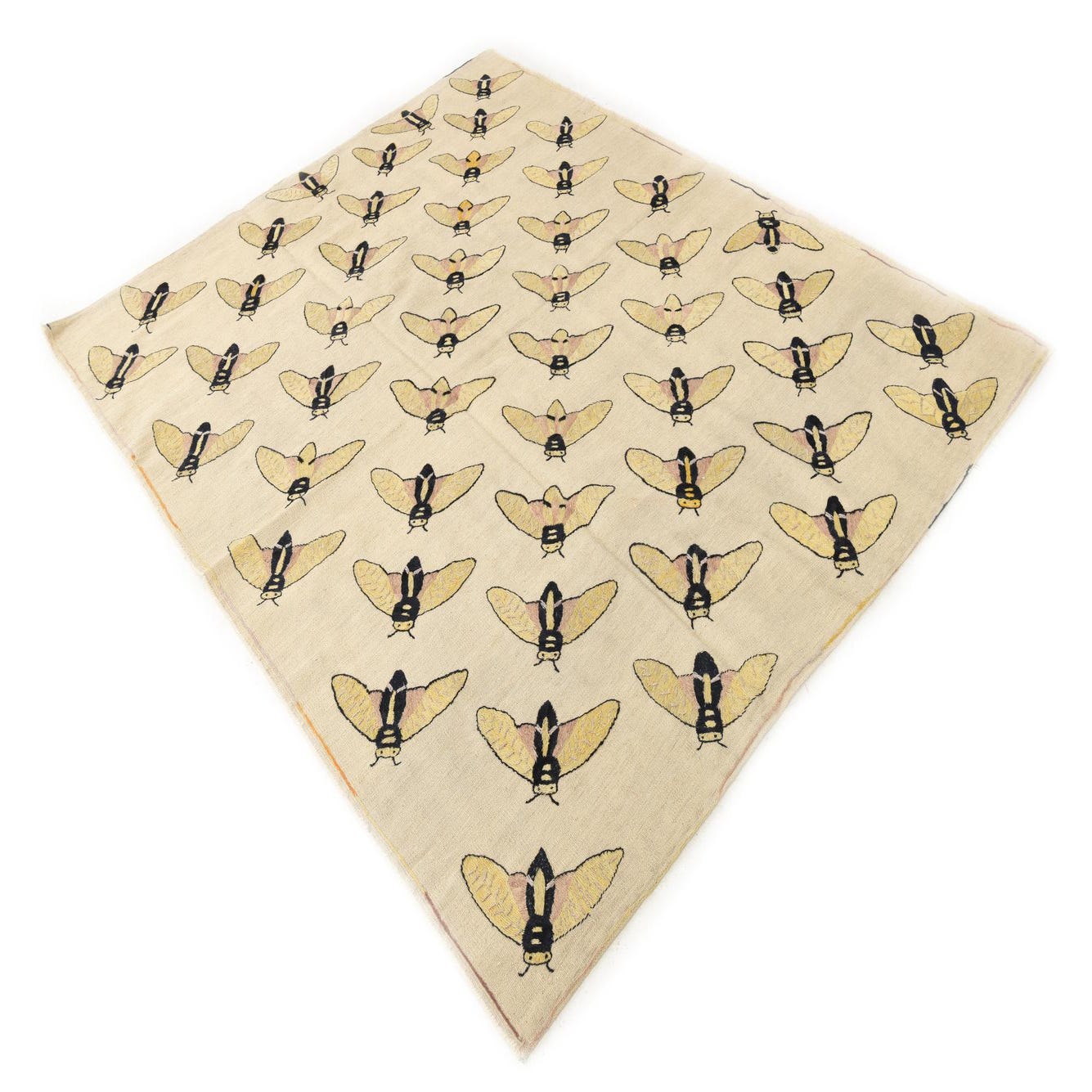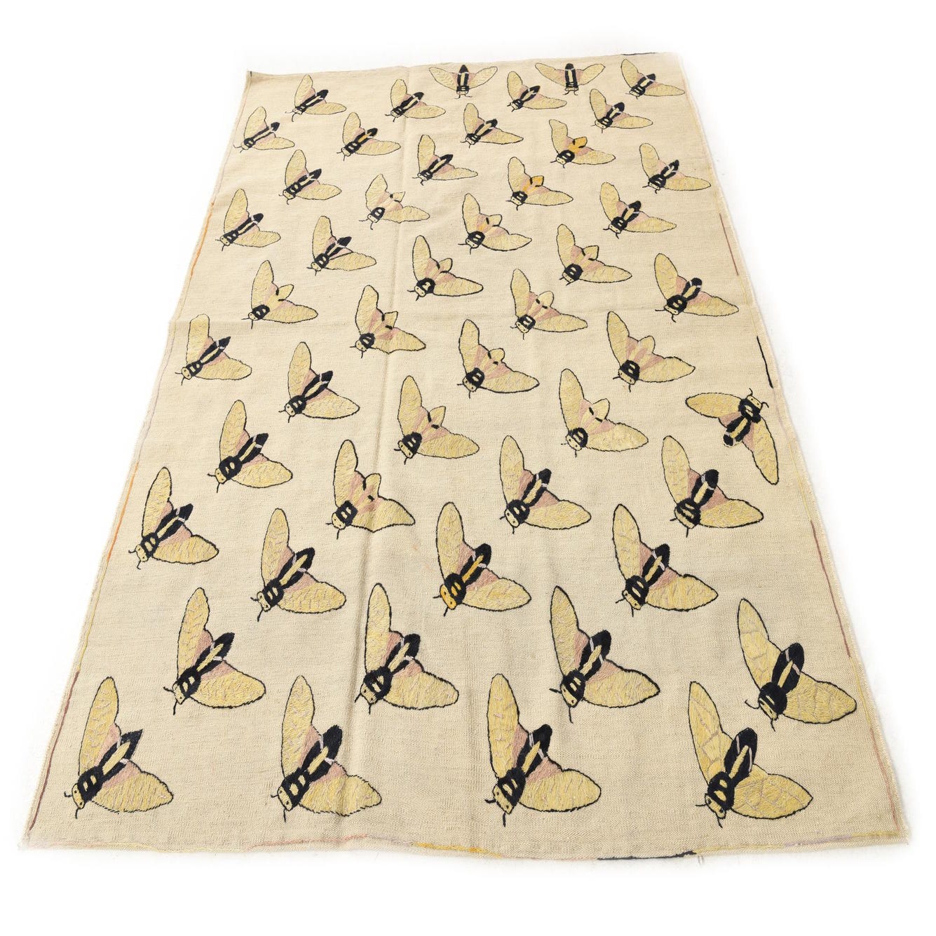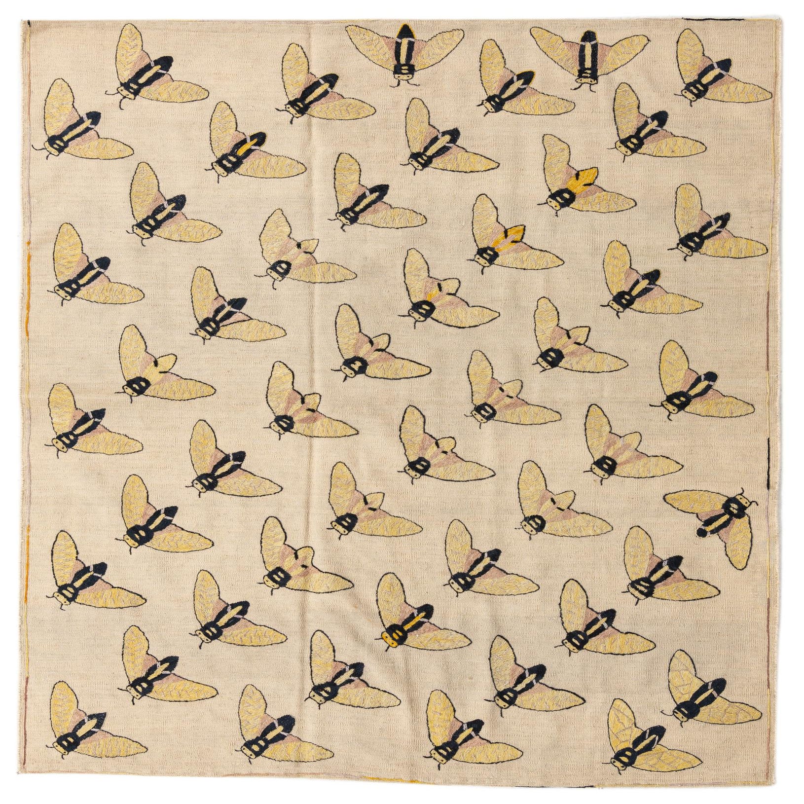 A 5x8 rectangular ivory flatweave rug with a repeating pattern of yellow and black tribal moth-like insects.
