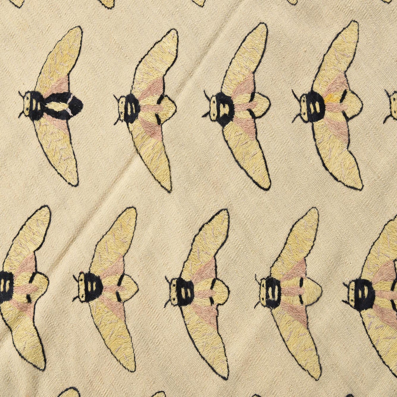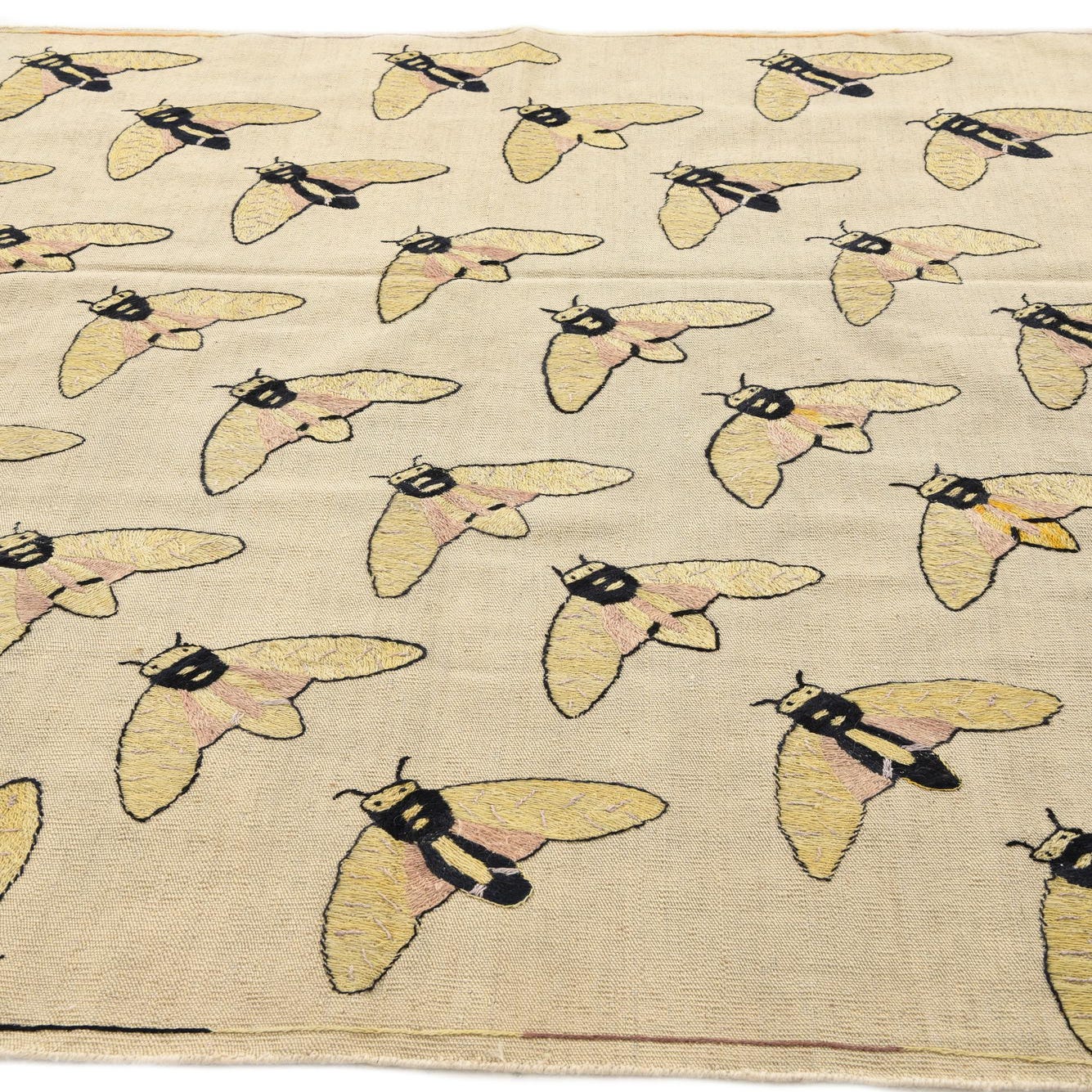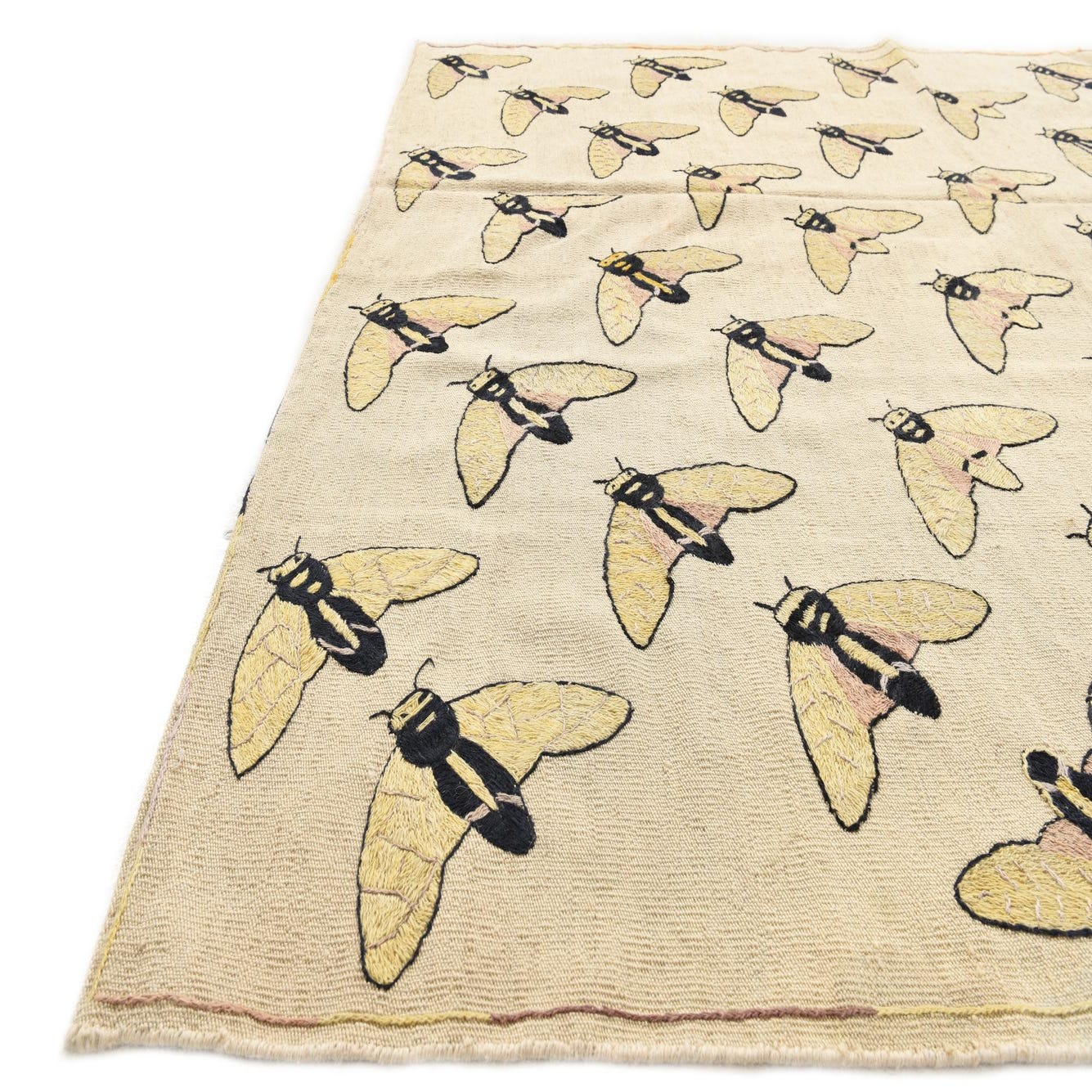 A 5x8 rectangular ivory flatweave rug with a repeating pattern of yellow and black tribal moth-like insects.