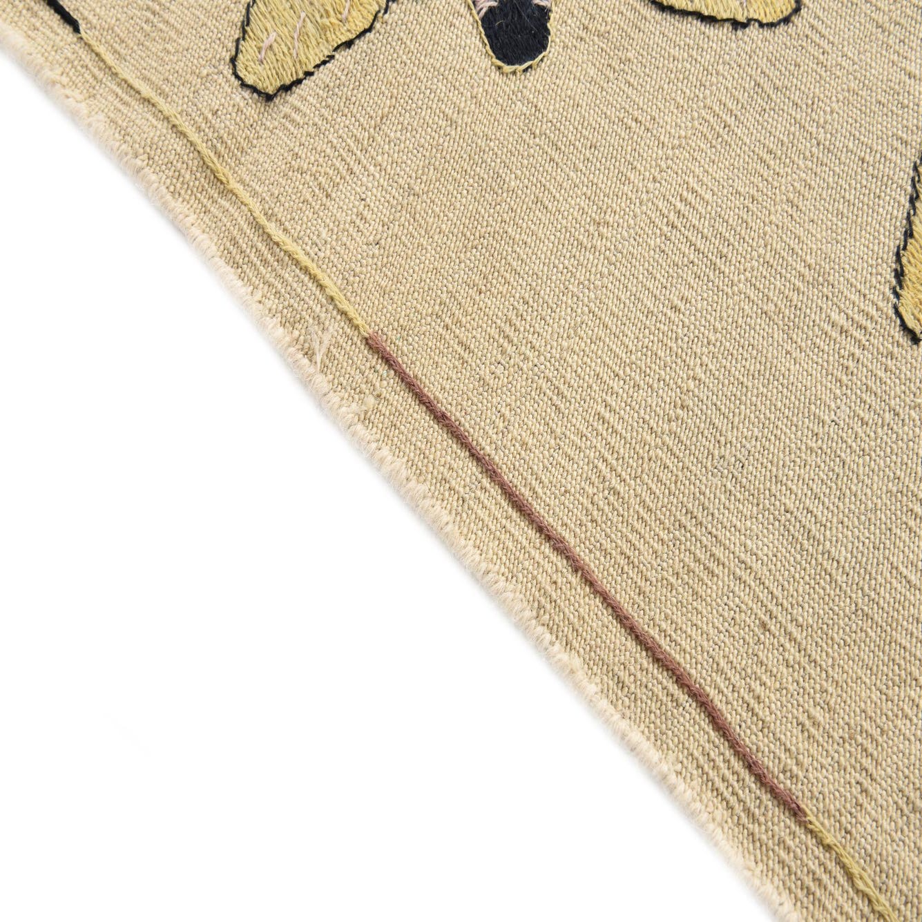 Primary color is Ivory. Colors in this rug include: Ivory, Black, Light Brown, Yellow.