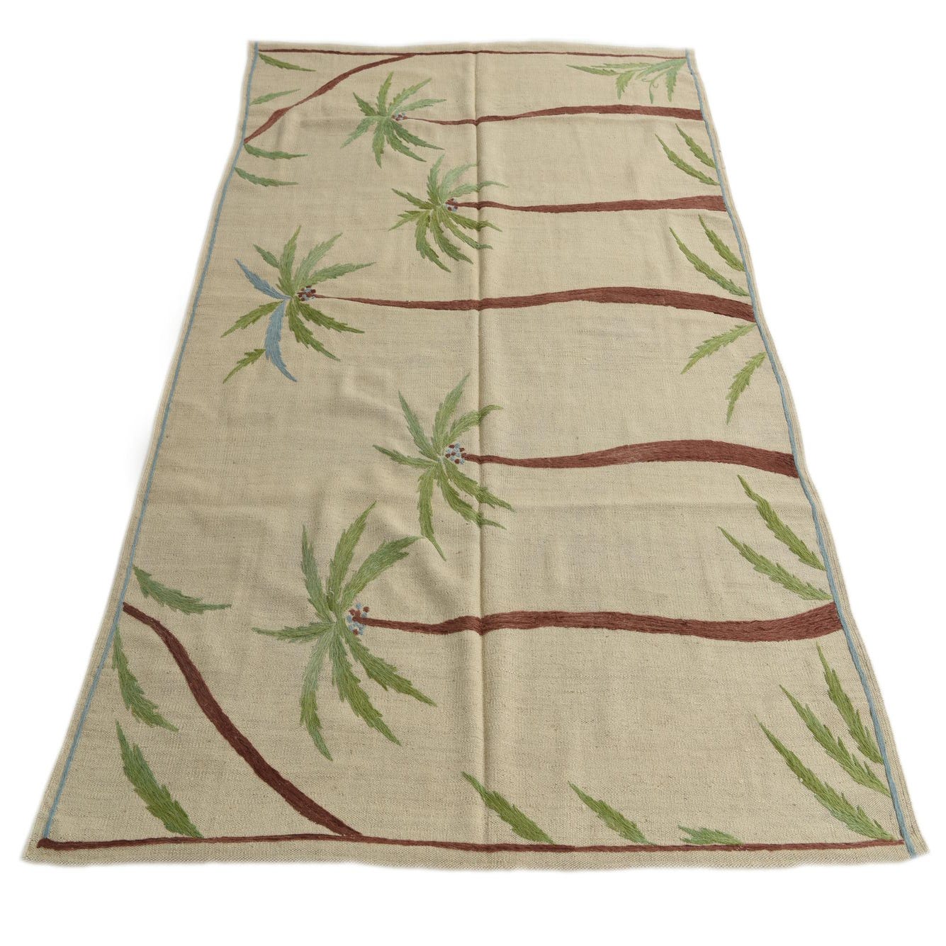 A 5x8 rectangular ivory flatweave rug with a modern tribal pattern of brown palm trees and green fronds.