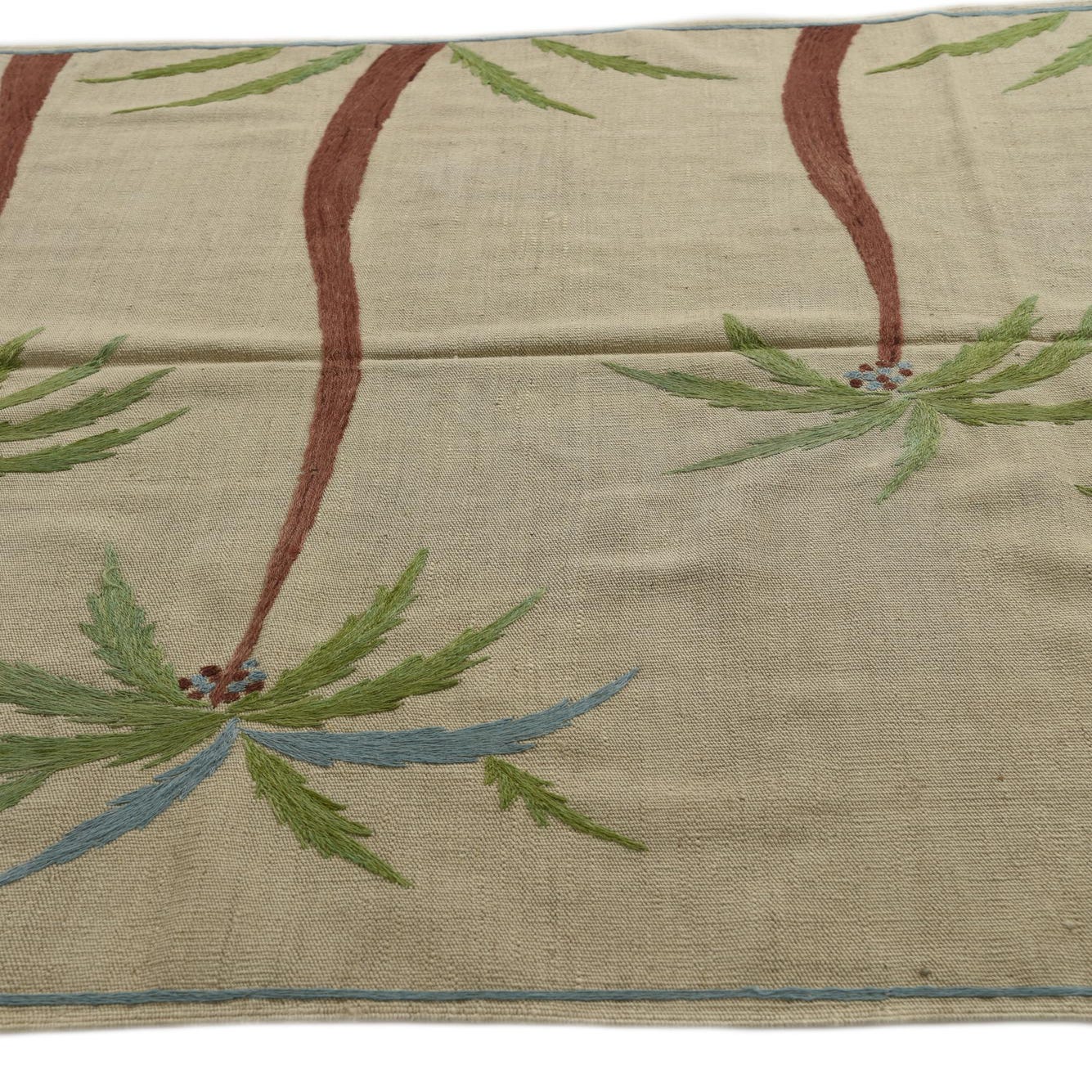 The Kilim Suzani collection presents a 5x8 hand-woven rug made from 100% wool, showcasing a distinctive design that harmonizes natural motifs with geometric sensibilities. The base of the rug is a serene ivory which serves as a subtle canvas for the sophisticated pattern. The design features organic, leaf-like motifs in verdant green shades that breathe life into the design, along with light blue accents that add a serene touch. These botanical elements are intersected by brown linear details that anchor the design with an earthy sensibility.