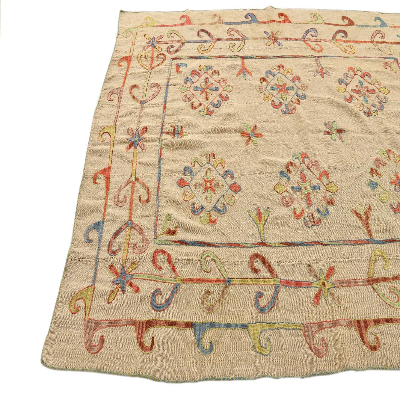 A 5x8 rectangular ivory flatweave rug with a colorful tribal Suzani pattern and a decorative border.