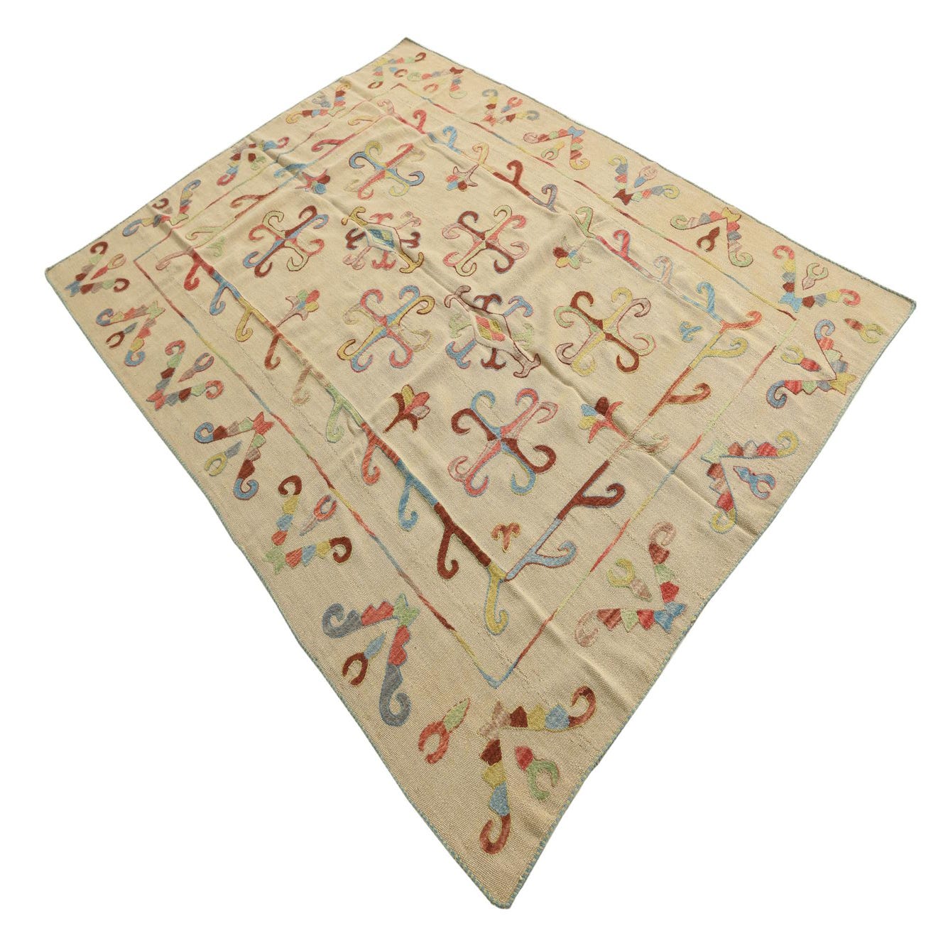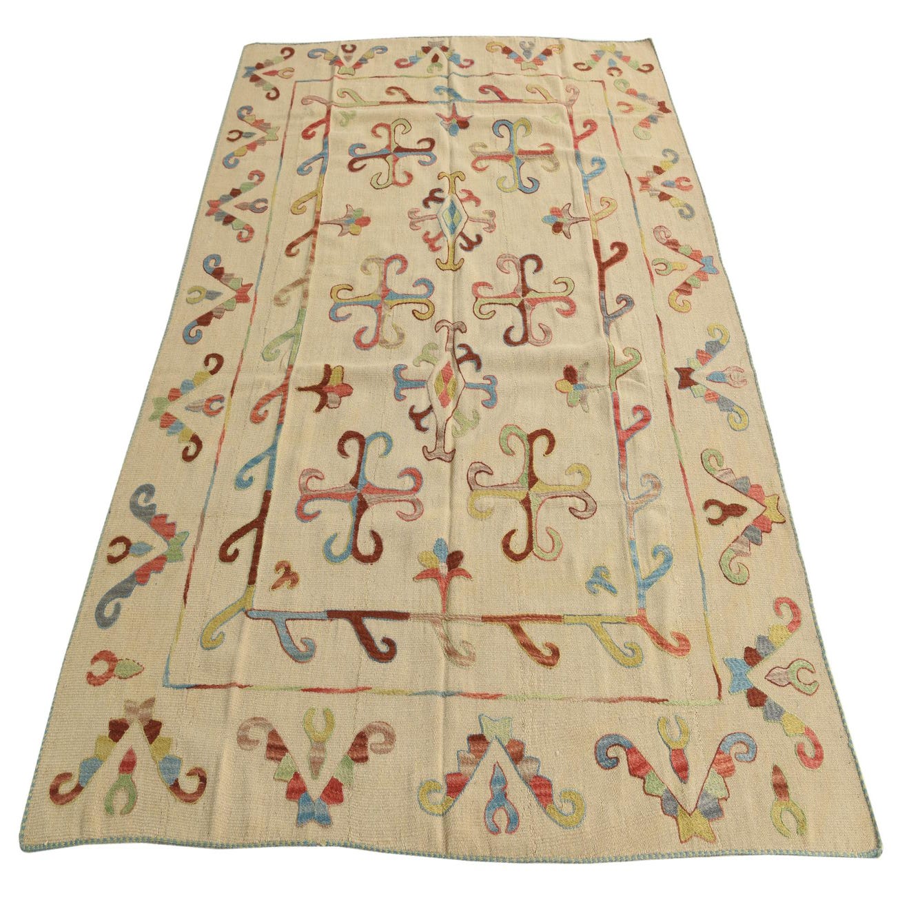 A 5x8 rectangular ivory flatweave rug with a colorful tribal Suzani pattern, ideal for a living room.