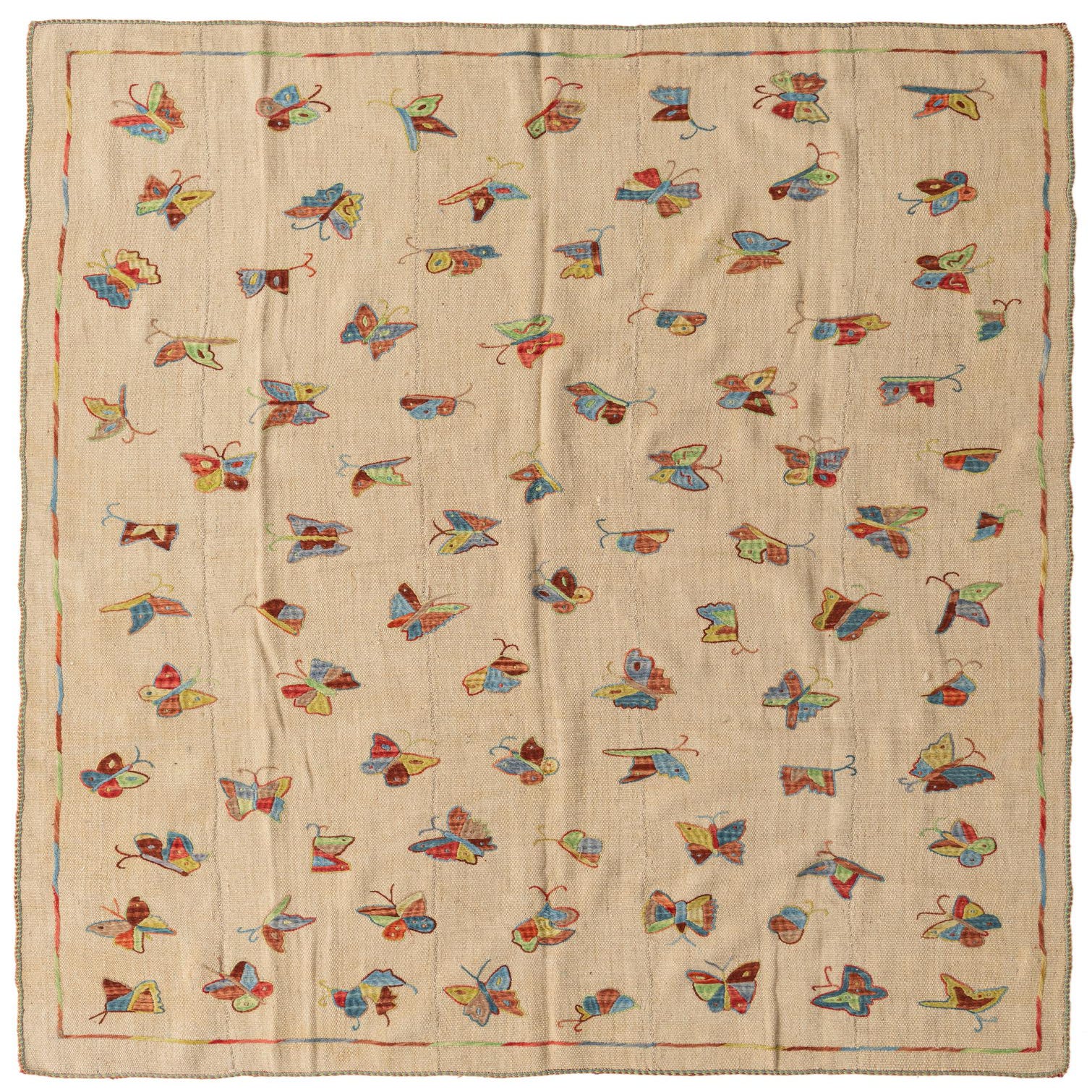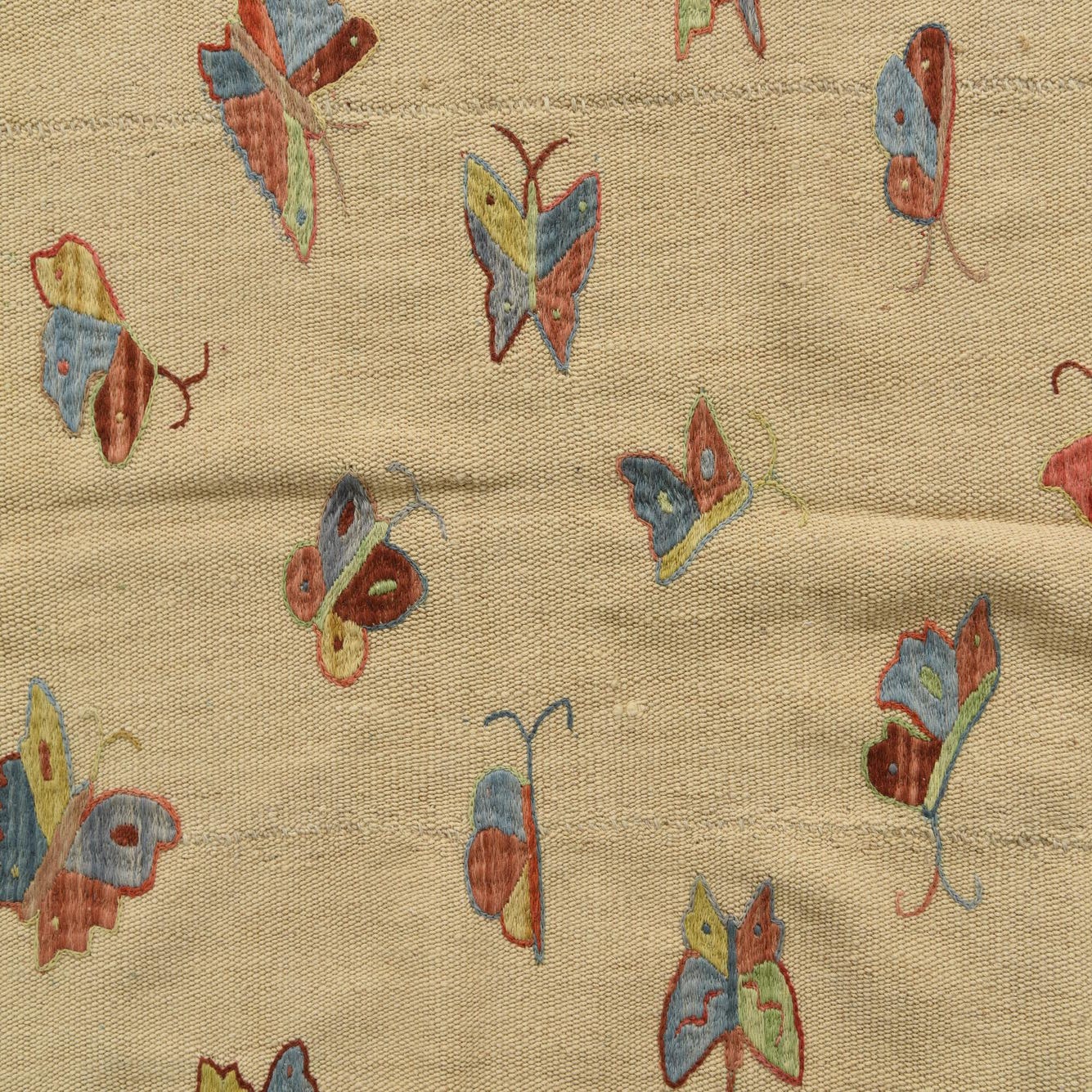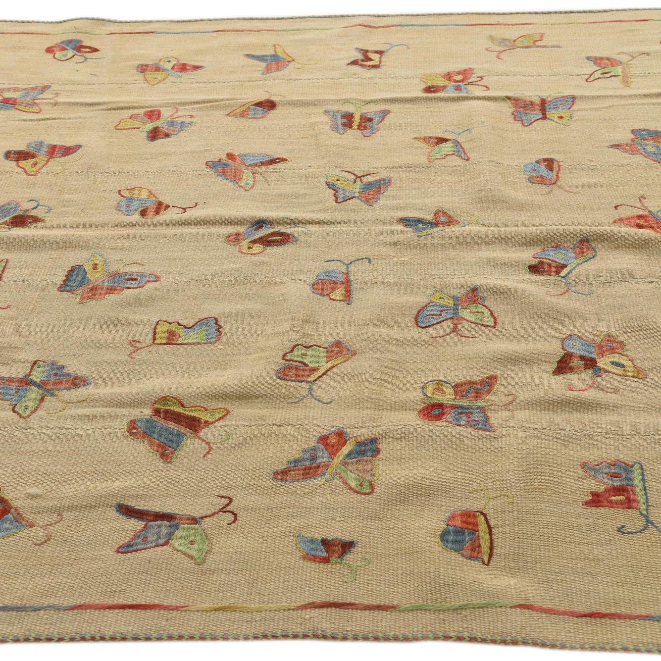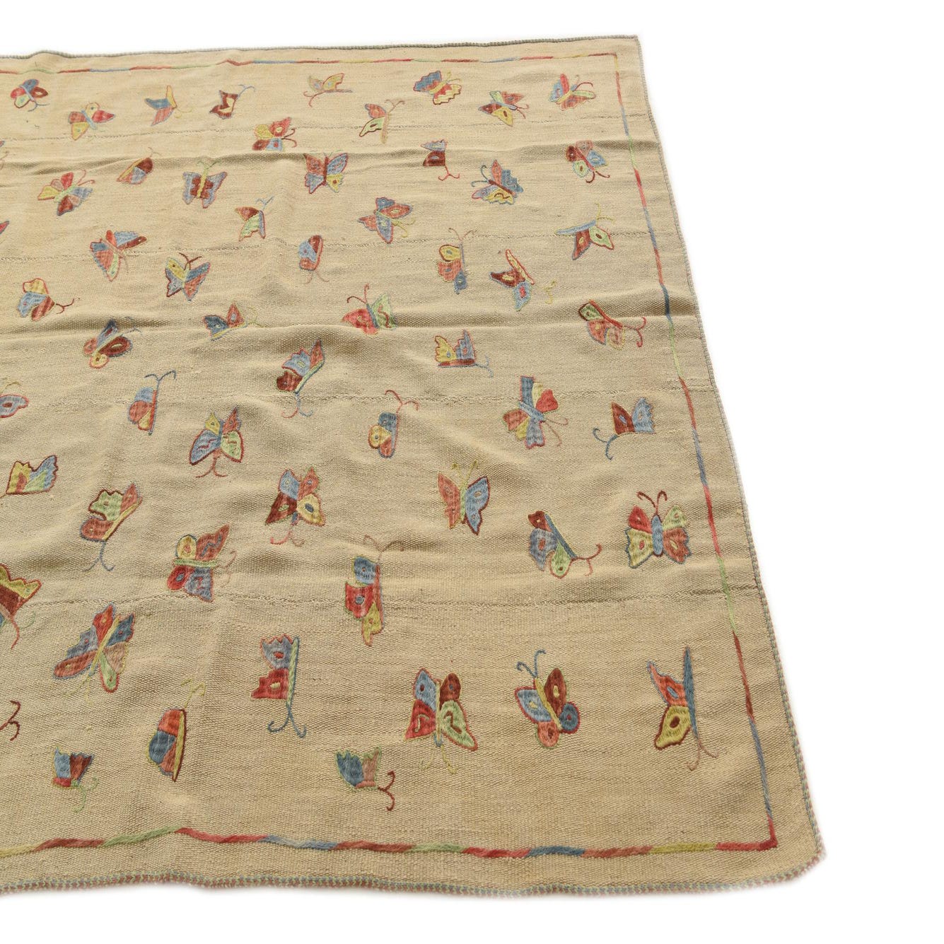 A 5x8 rectangular ivory flatweave rug features a vibrant, scattered butterfly pattern in red, blue, green, and yellow.