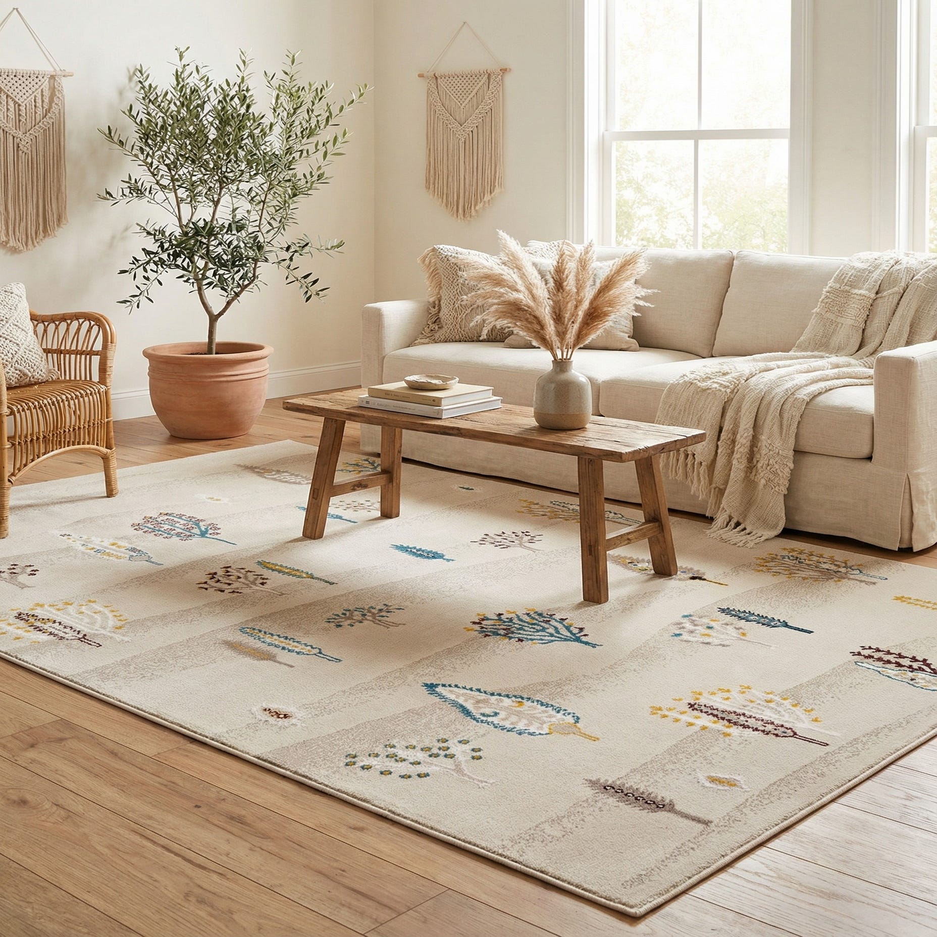 Primary color is Ivory. Colors in this rug include: Ivory, Beige, Blue, Burgundy, Gray, Yellow.