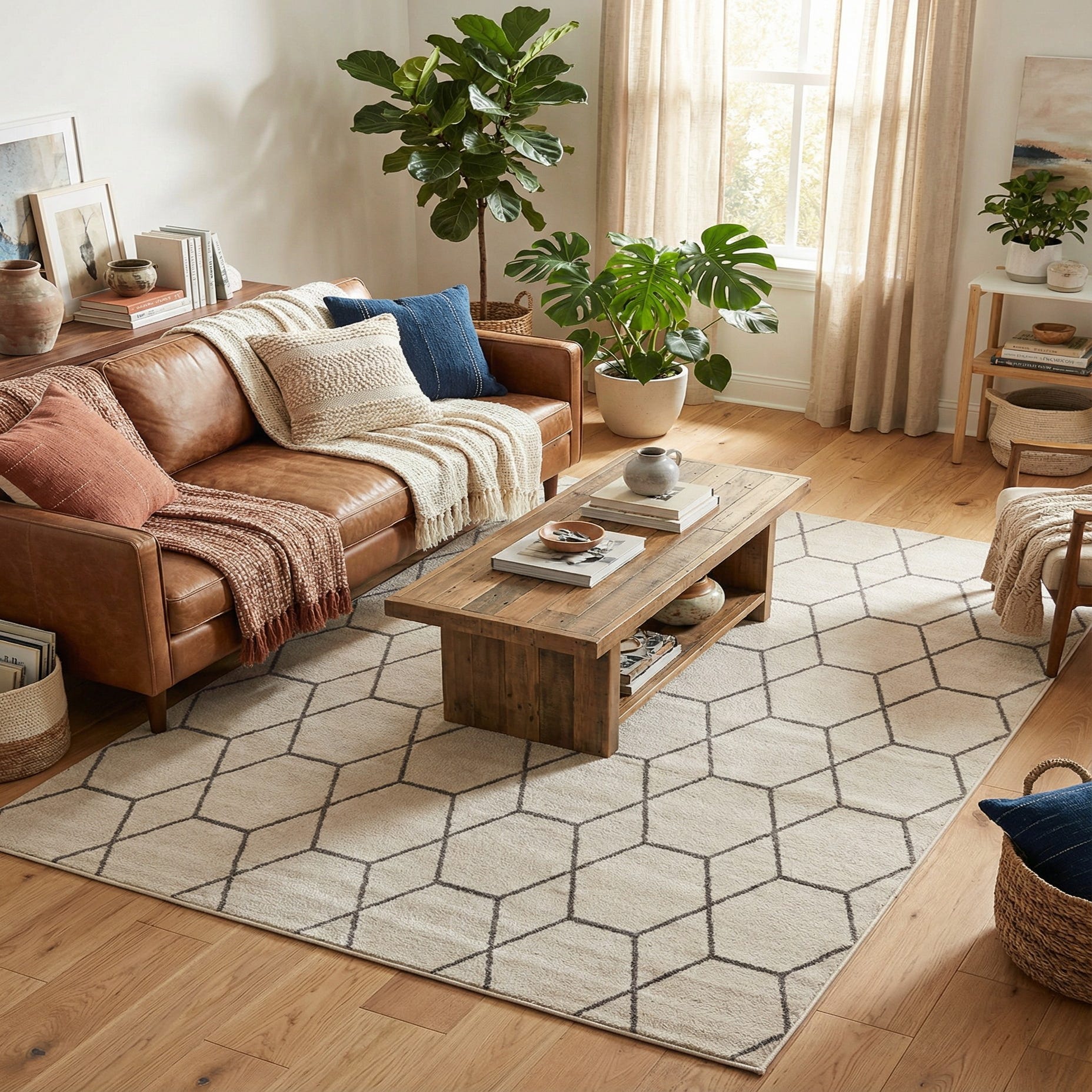 This rug works well in contemporary or transitional spaces where a neutral base is desired—place it under a low-profile sofa and coffee table to anchor a living area, layer it beneath a bed to add subtle pattern to a calm bedroom, or use it in a home office to introduce structure without heavy color. Its neutral ivory and gray palette complements Scandinavian, mid-century modern, and modern farmhouse furnishings, pairing easily with wood tones, metal accents, and soft textiles.
