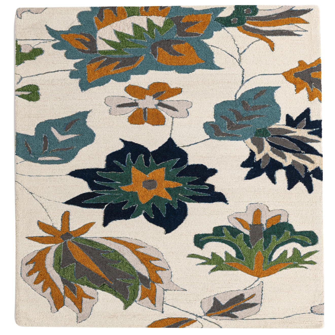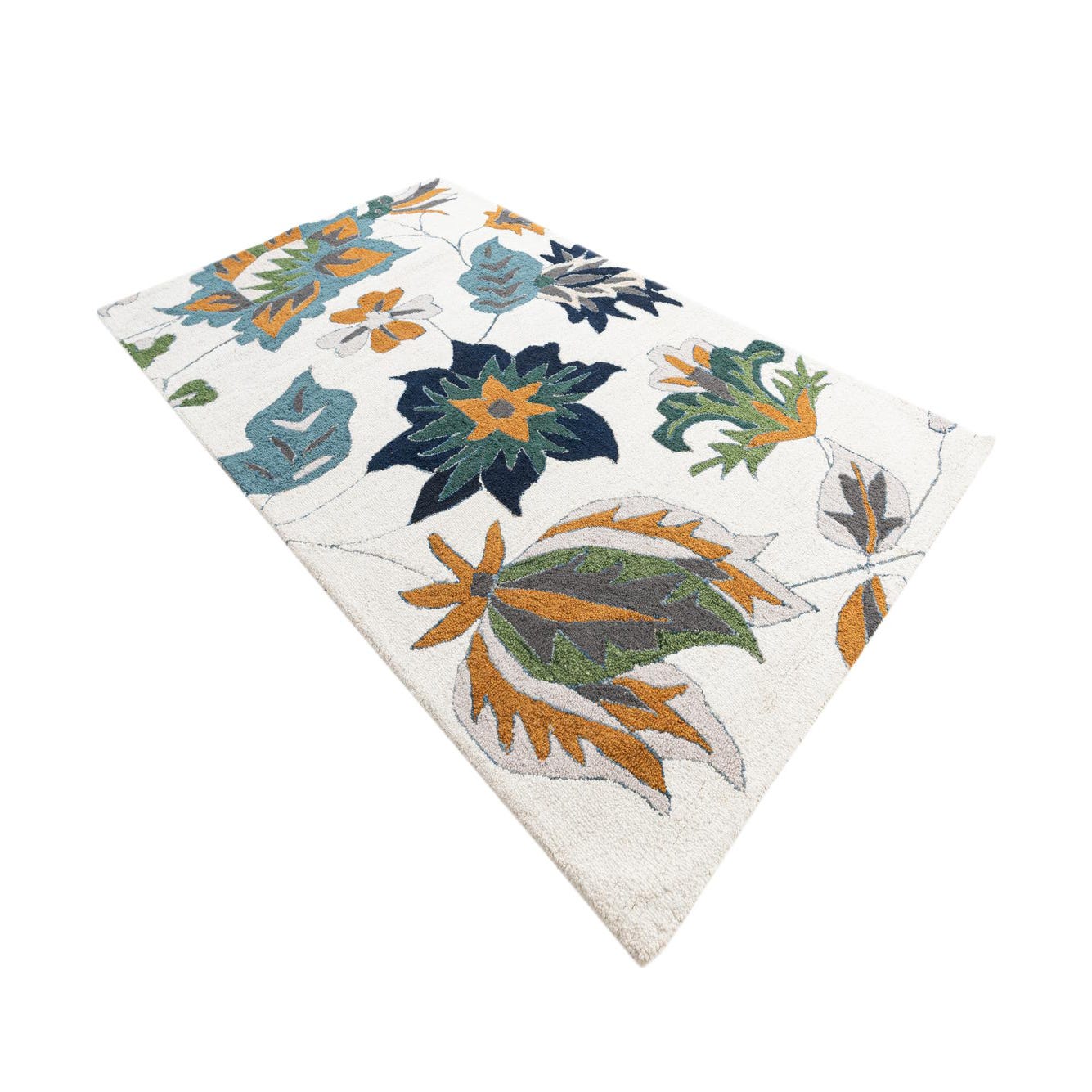 A 5x8 rectangular ivory modern rug with large teal, orange, green, and navy floral patterns, suitable for a living room.