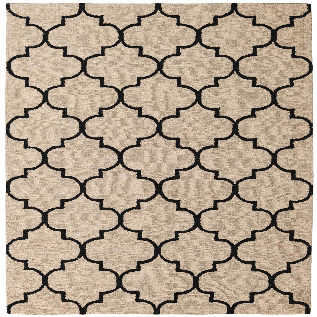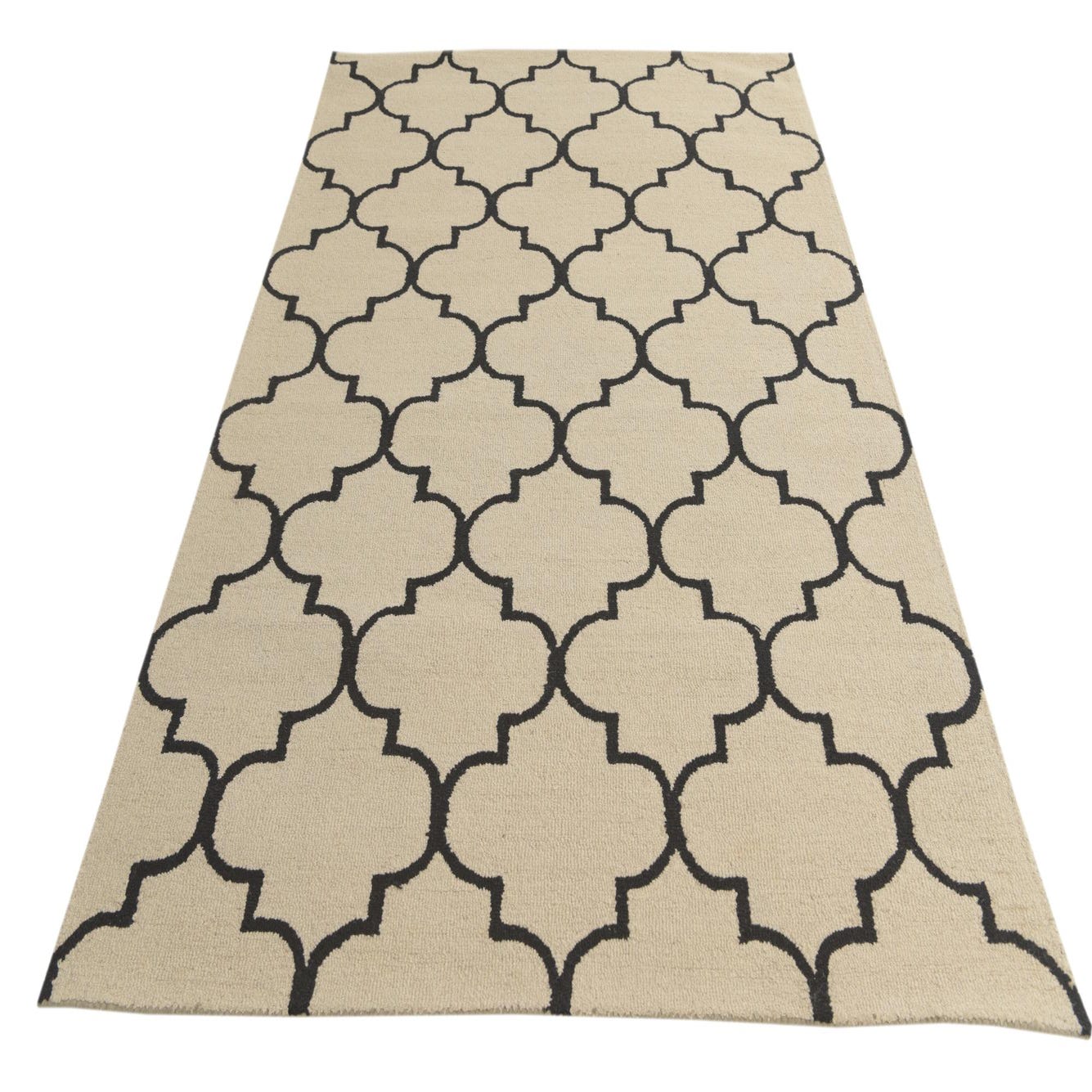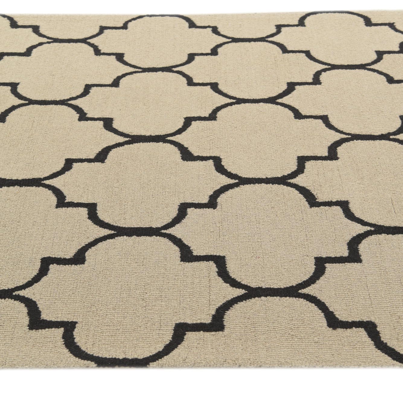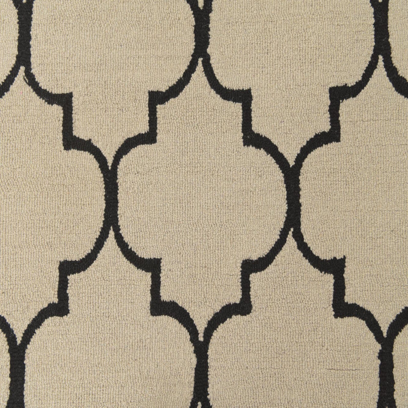 A 5x8 rectangular ivory wool rug with a black modern abstract quatrefoil pattern, ideal for a living room or bedroom.