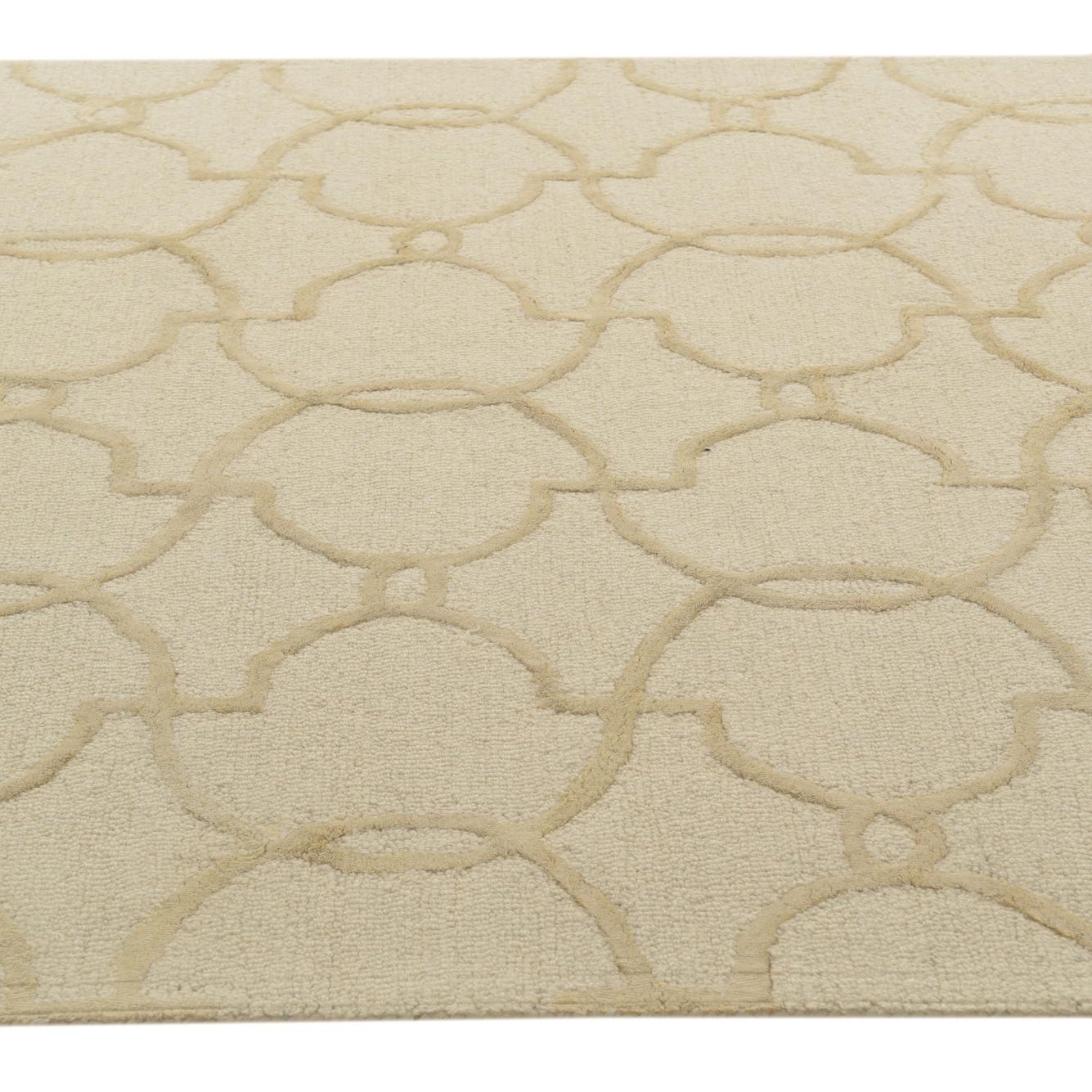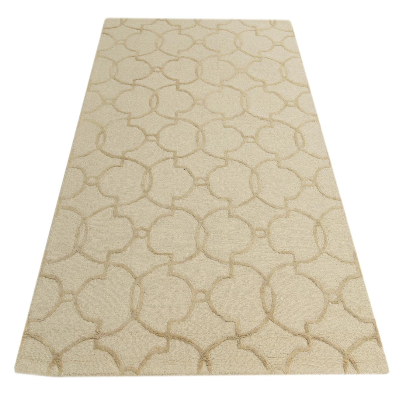 The Luna Collection presents a 5x8 hand-tufted rug crafted from 100% wool, designed to bring a touch of subtle elegance to any room. Its ivory background serves as a serene canvas for the overlaid cream pattern of interconnected geometric shapes, offering both visual interest and a harmonious balance. The neutral tones and the simplicity of the design afford this piece great versatility, making it suitable for a wide range of interior settings from modern minimalist to more traditional spaces.