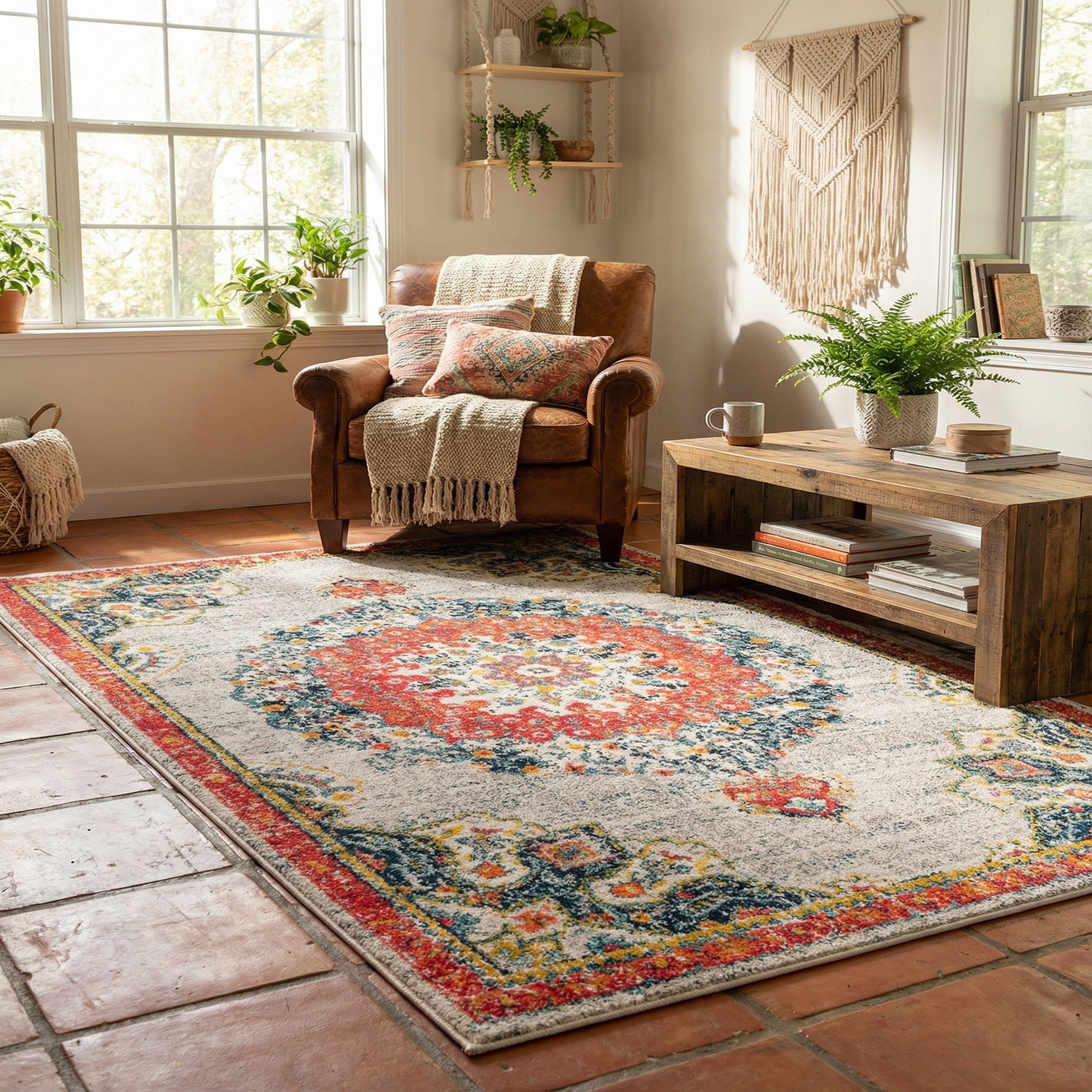 The rug’s low pile feels smooth underfoot and lays flat, making it a practical choice for everyday rooms. It fits naturally in a living area in front of a sofa, beneath a small dining table, or layered at the foot of a bed. Pair it with warm wood furniture and brass accents for a mid-century modern look, add textured pillows and woven baskets for a relaxed bohemian vibe, or use it to bring color into a neutral, transitional space.
