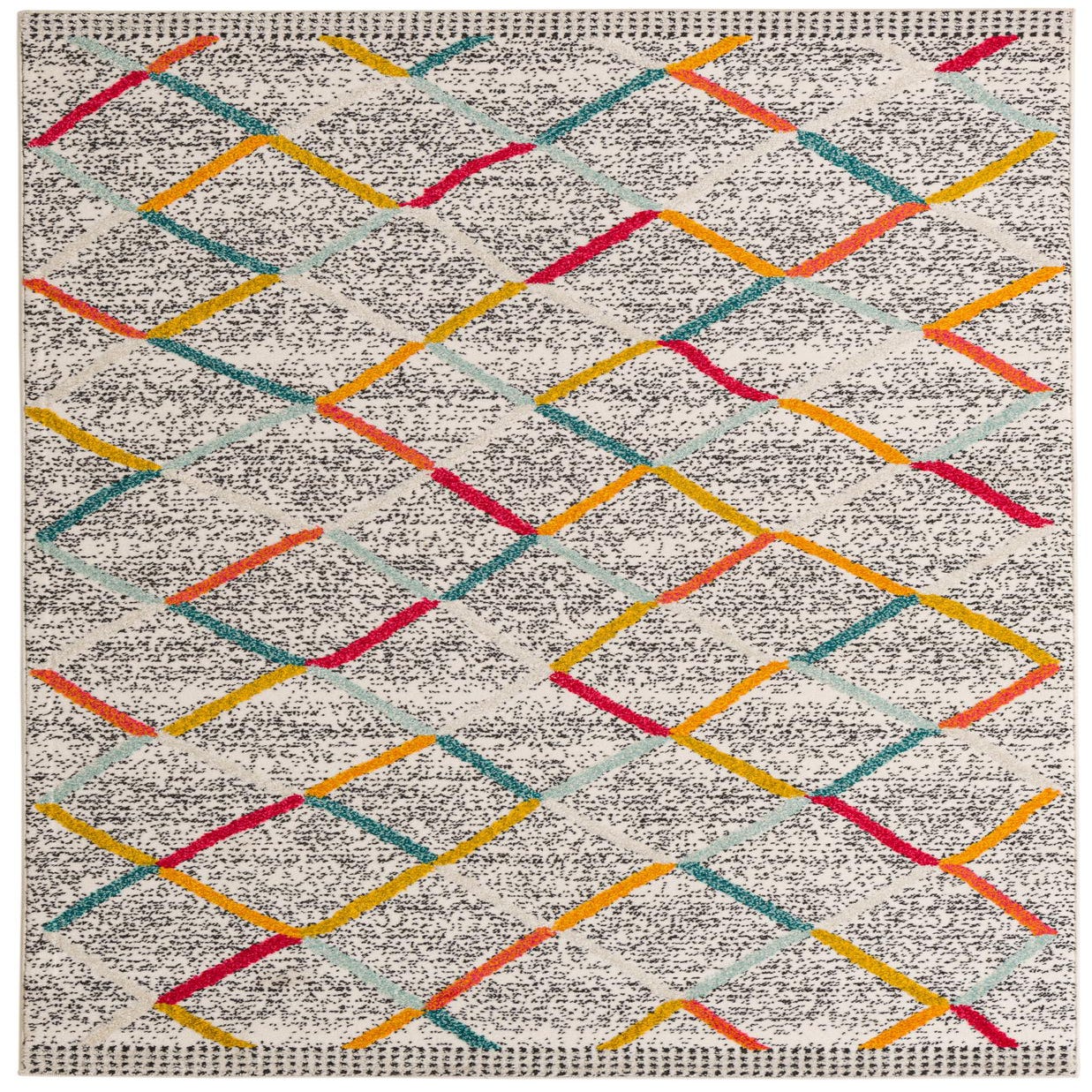An ivory ground speckled with fine black dots provides a neutral, textured base for a lively, hand-drawn lattice of diamonds. Short, tufted strokes in light blue, teal-green, yellow, orange and bright red form the intersecting lines, and those colored threads sit slightly raised against the lower pile background so you can both see and feel the pattern. Machine made from 100% polypropylene, the rug has a low-to-medium pile with a soft hand and a subtle dimensional quality where the multicolor lines run.