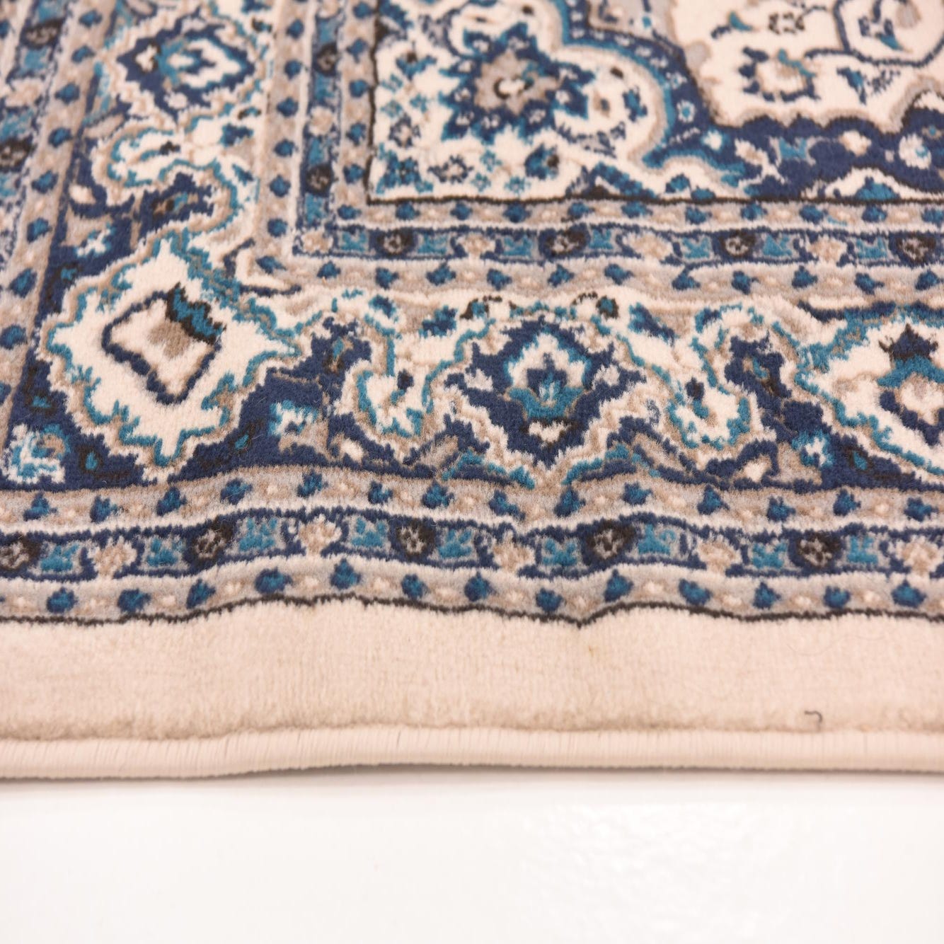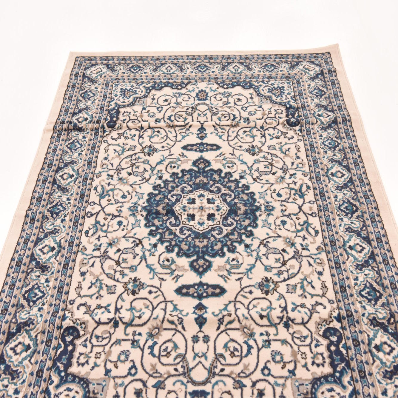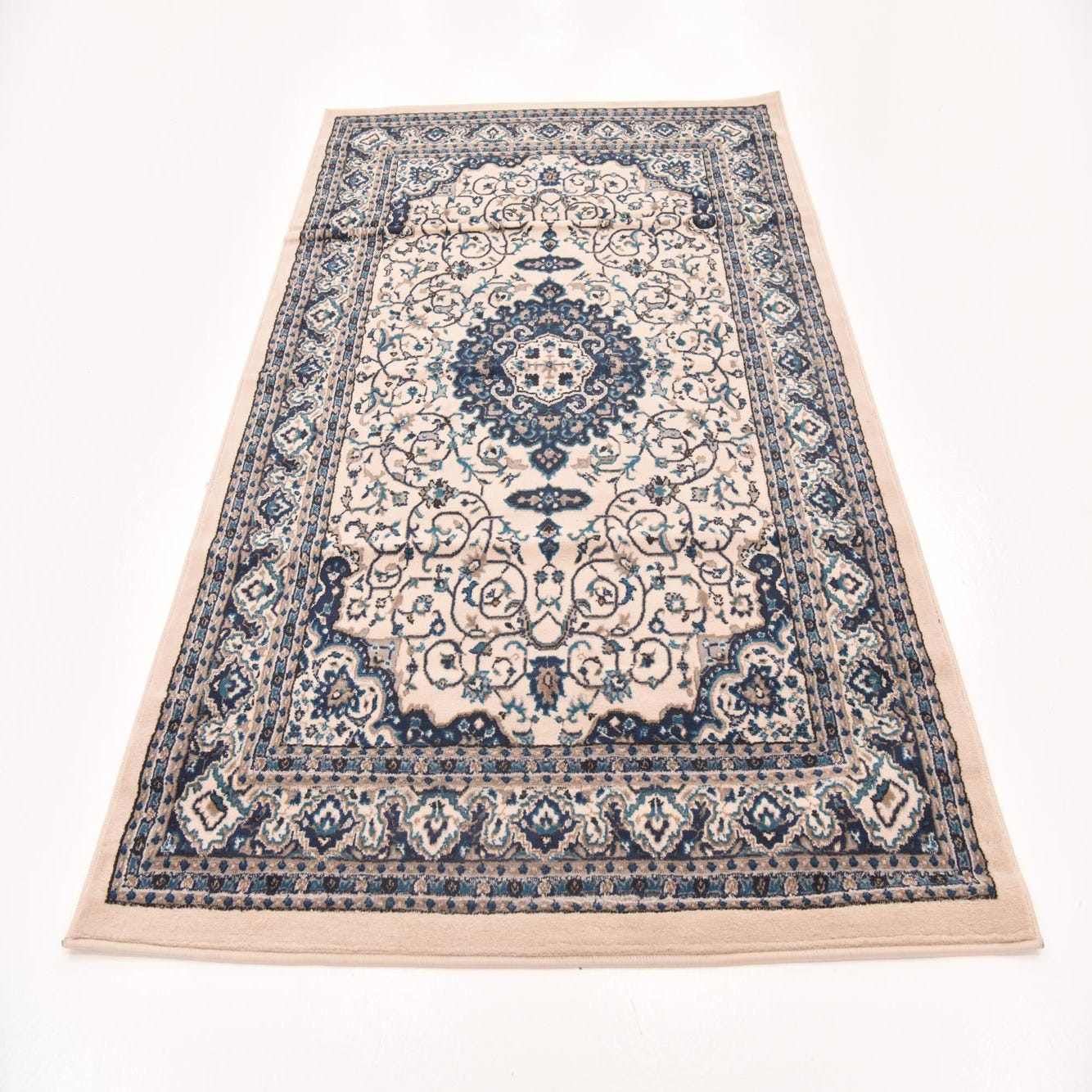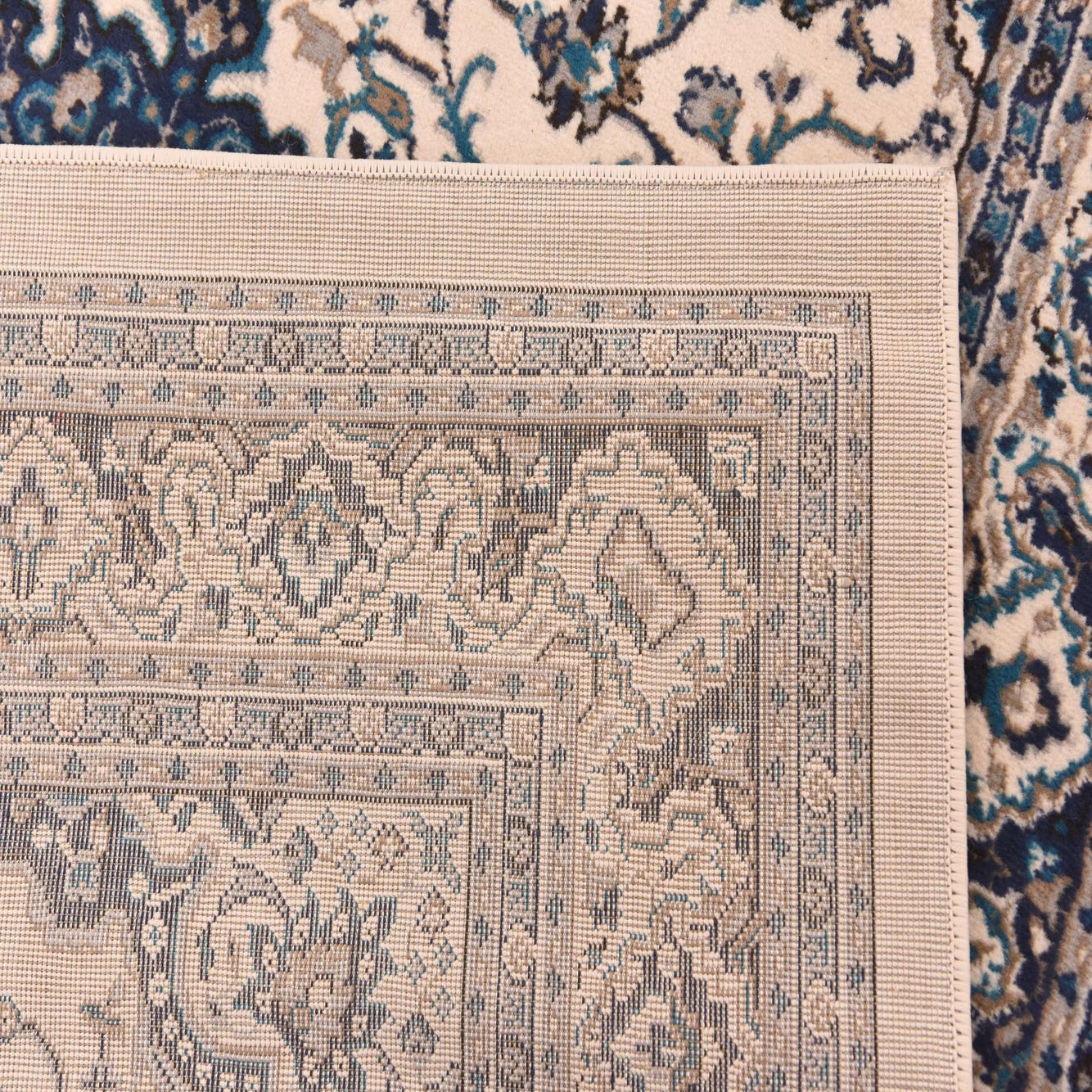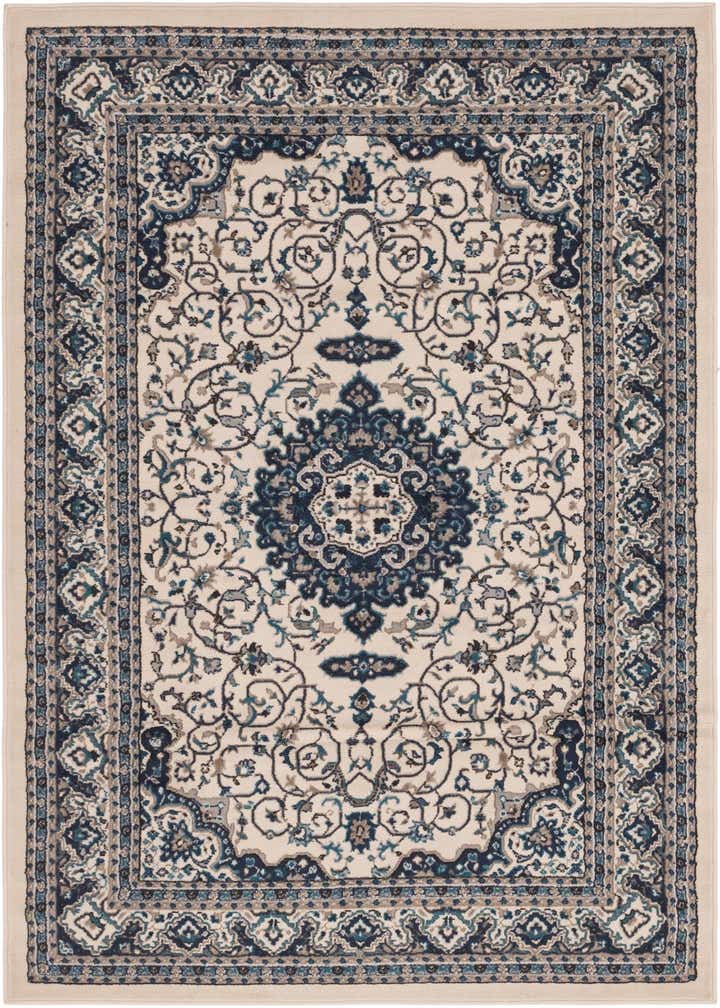 Primary color is Ivory. Colors in this rug include: Ivory, Blue, Gray, Navy Blue, Teal.