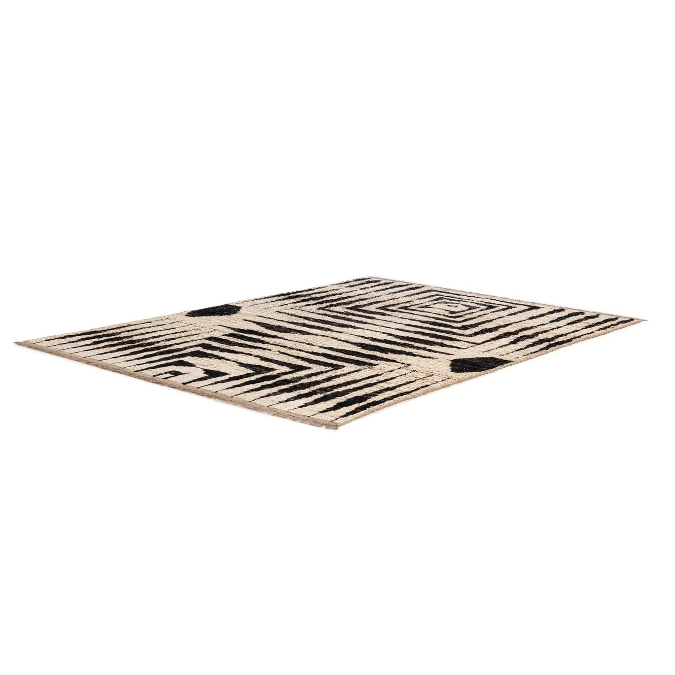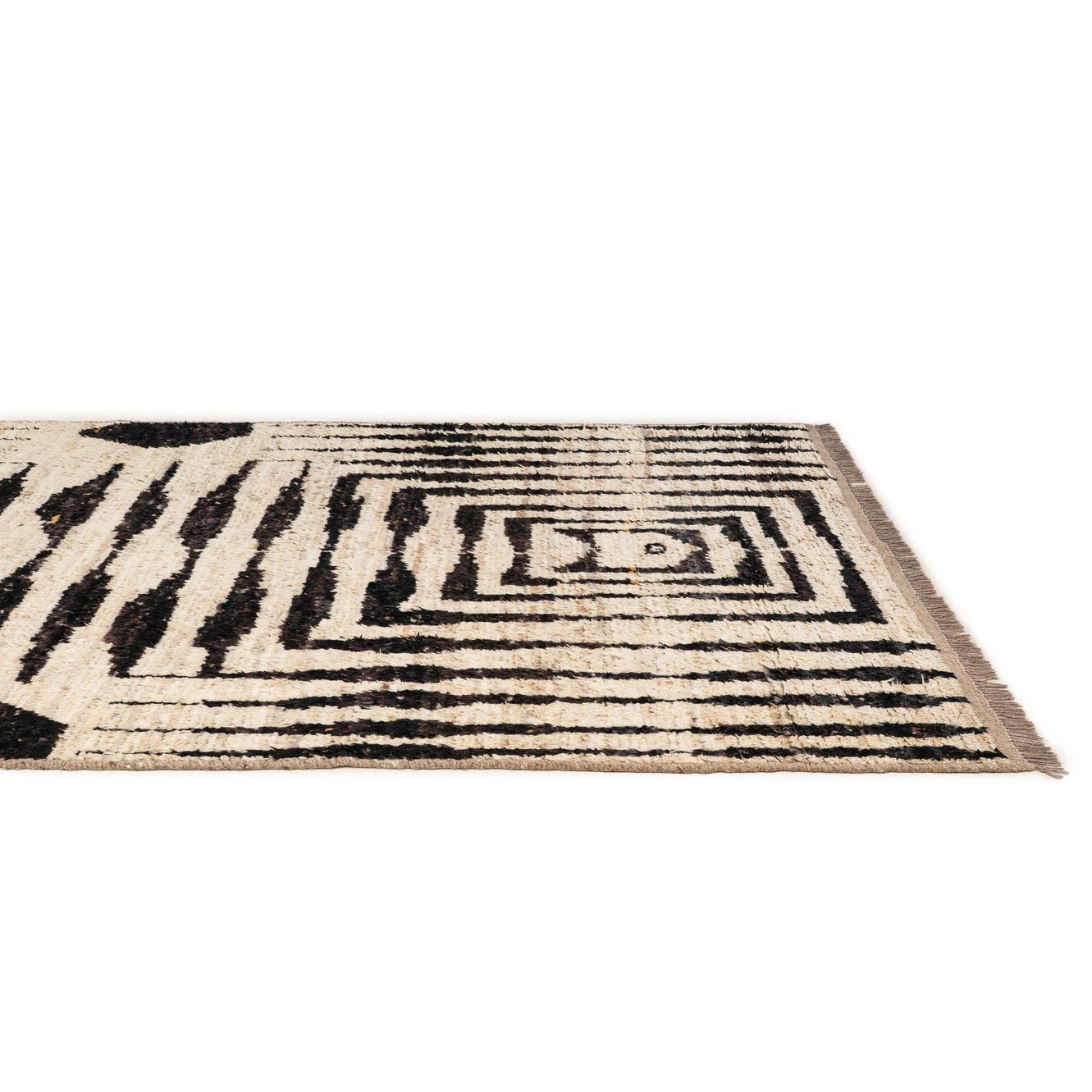 A 5x8 rectangular ivory wool rug with a bold black tribal geometric pattern, featuring squares and vertical lines.