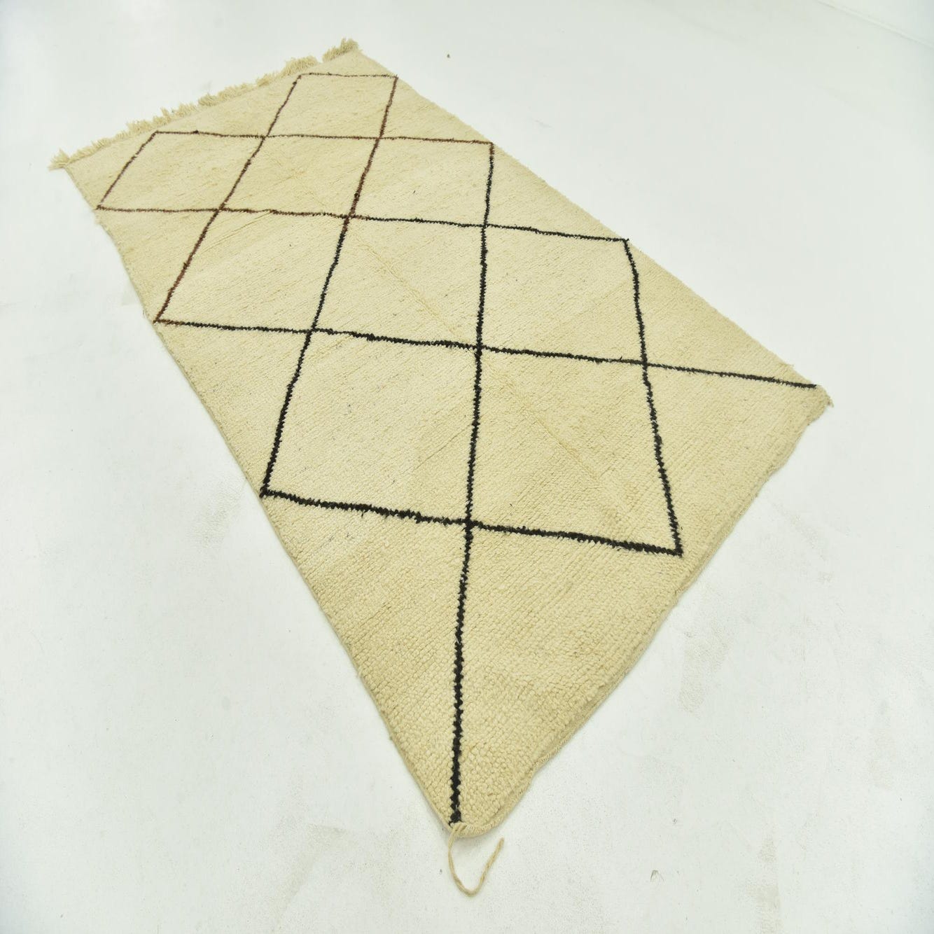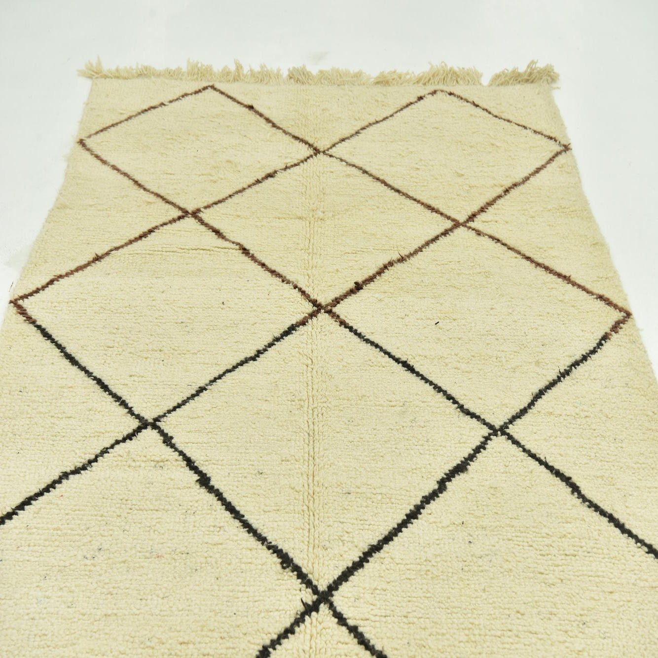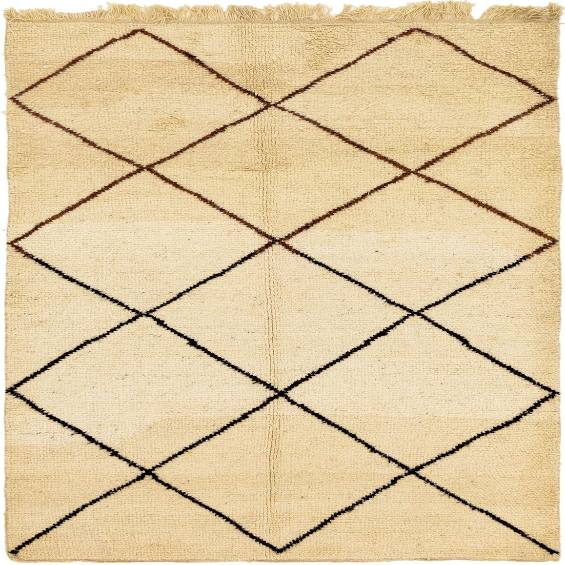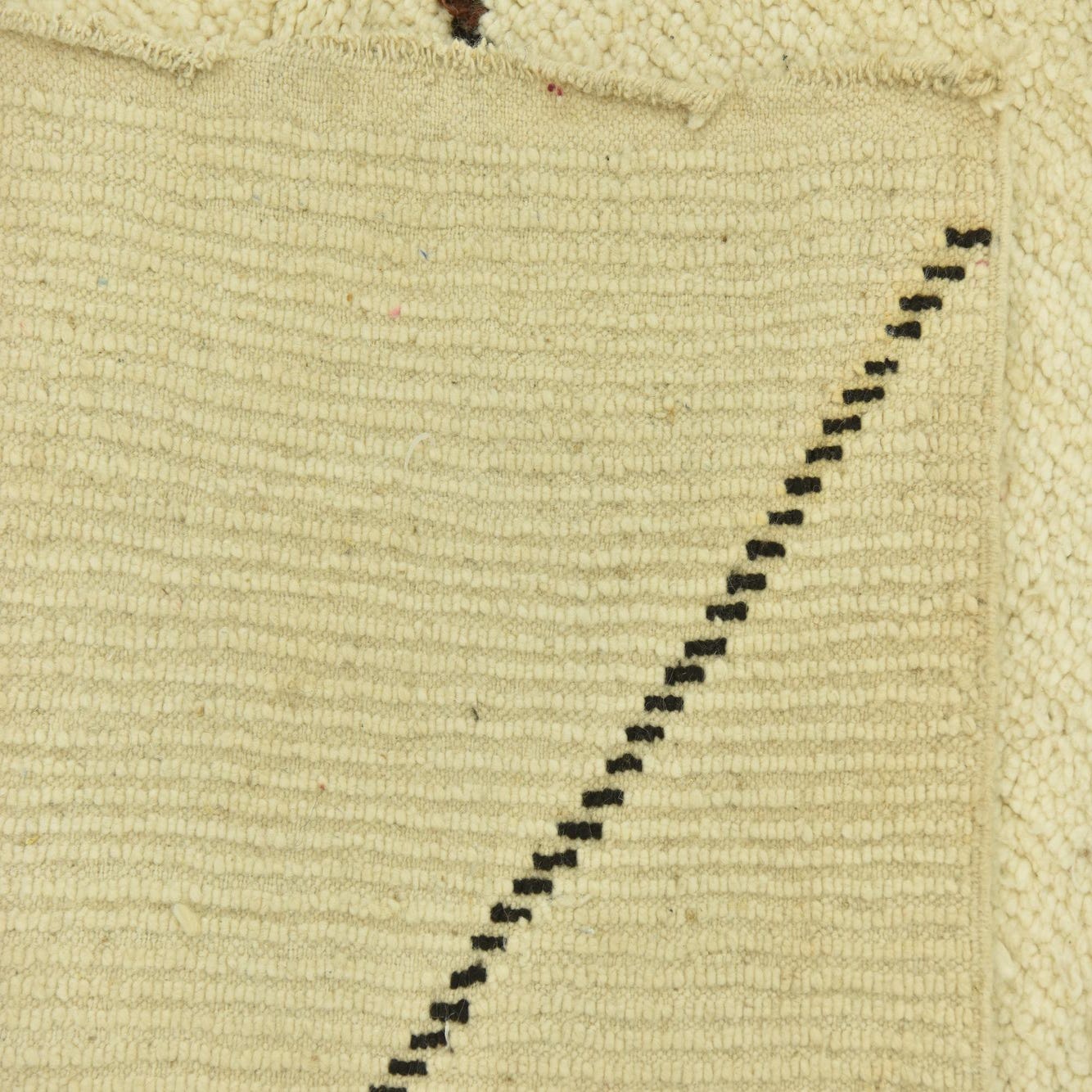 The Moroccan Collection offers a 5x8 rug, hand-knotted from 100% wool, presenting a heritage aesthetic with a semi-antique age of 40-60 years. This piece features a distinctive ivory background accented with a geometric pattern in contrasting black and touches of brown, creating a visually engaging centerpiece. The texture of the rug is indicative of traditional Moroccan craftsmanship, offering a plush feel underfoot.